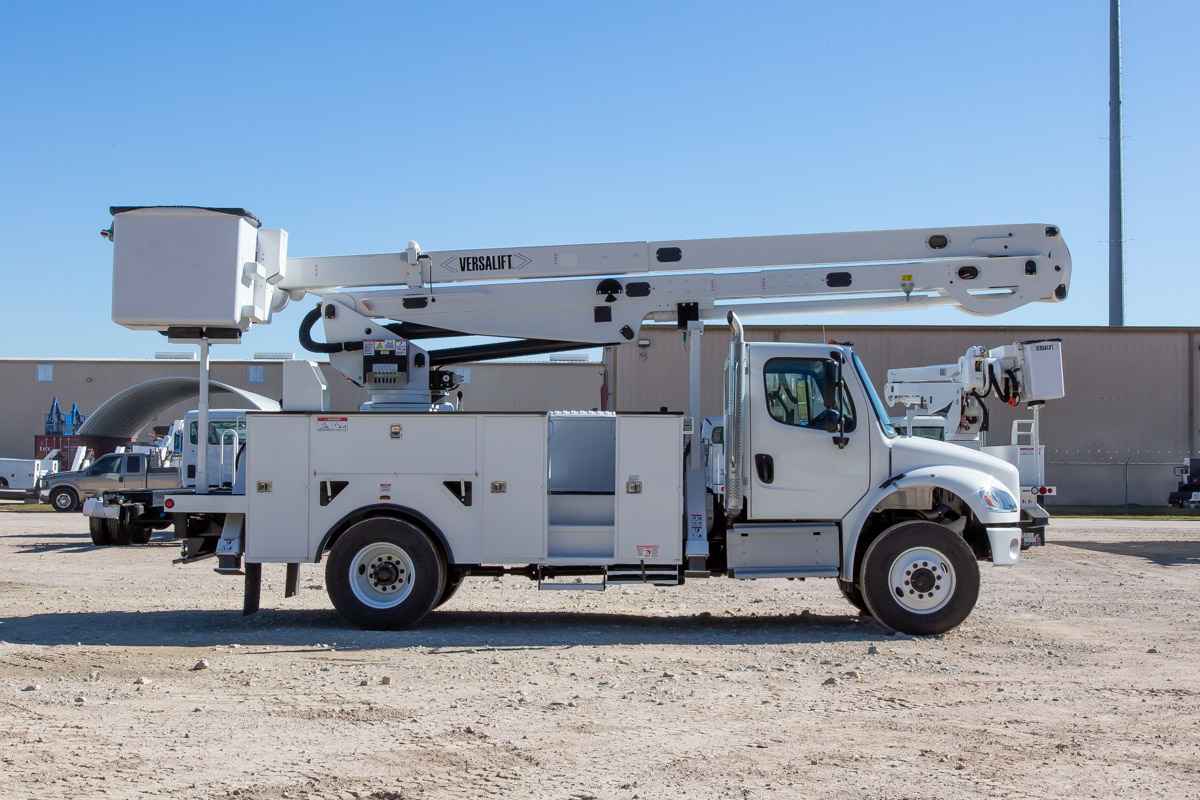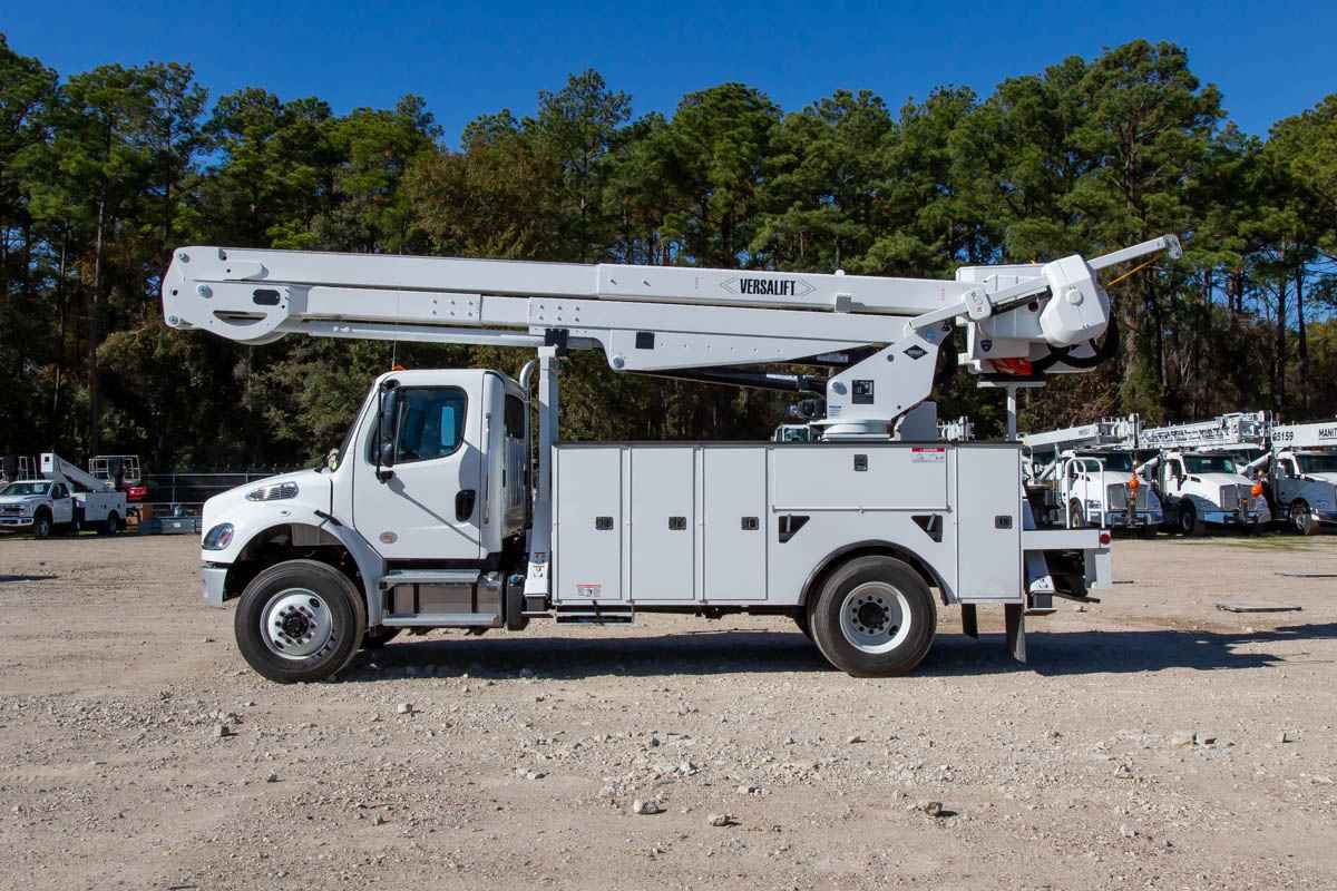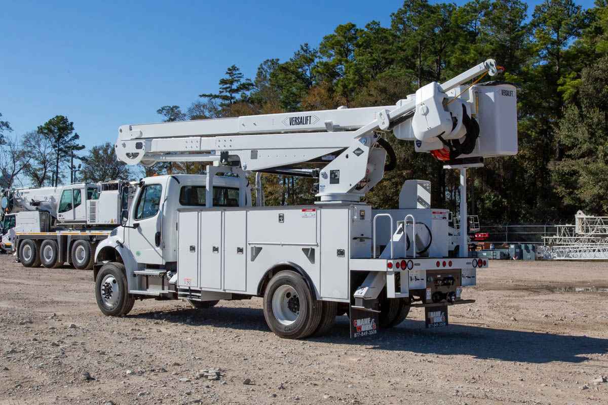 Versalift VN-555-MHI Non-Overcenter Bucket Truck - Powerful Non-Overcenter Material Handler - Truguard® Safety System Standard - Simple Mechanical Linkage for Boom Compensation INDUSTRIES SERVED: Electric Power Distribution, Electric Utilities TYPE: Non-Overcenter HEIGHT RANGE: 45ft - 65ft MODEL SERIES: VN Product Overview - Working Height: 60.5 ft (18.4 m) - Height to Bottom of Platform: 55.5 ft (16.9 m) - Horizontal Reach: 42.8 ft (13 m) - Stowed Travel Height: 12.3 ft (3.74 m) - Platform Capacity: 700 lbs (318 kg) - Platform Rotation: 90 - Insulated or Non-insulated: Insulated - Material Handling: Yes SPECIFICATIONS HYDRAULIC SYSTEM Hydraulic Controls: Full Hydraulic Operating Pressure: 3000 psi (210 kg/cm²) Flow Rate: 12 gpm (45 lpm) Filtration: 10 micron return | 100 mesh suction System Type: Open Center Power Source: PTO Pump BOOM Upper Boom Articulation: 192 Lower Boom Articulation: 120 Upper Boom Insulation Gap: 108 in (2.74 m) Lower Boom Insulation Gap: 18 in (0.46 m) Lower Boom Lift Eye Capacity: 2500 lbs (1133.98 kg) Boom Rotation: Continuous VEHICLE REQUIREMENTS GVWR: 33,000 lbs (12700.52 kg) Cab to Axle (minimum): 108 in (2.59 m) MATERIAL HANDLING OPTIONS Jib & Winch Capacity: 2000 lbs (907.18 kg)