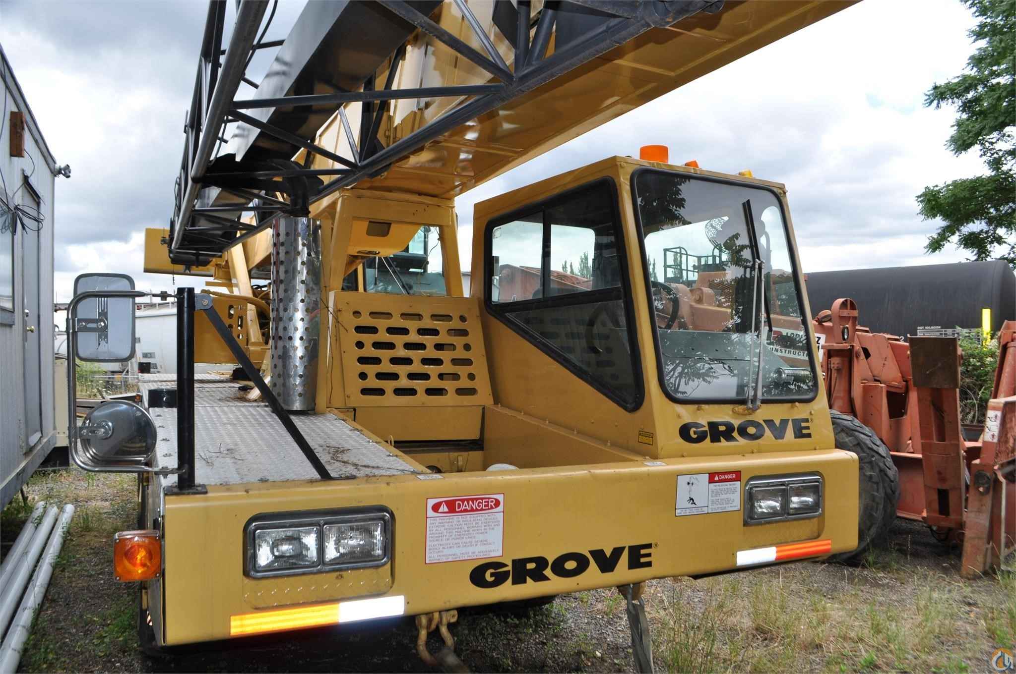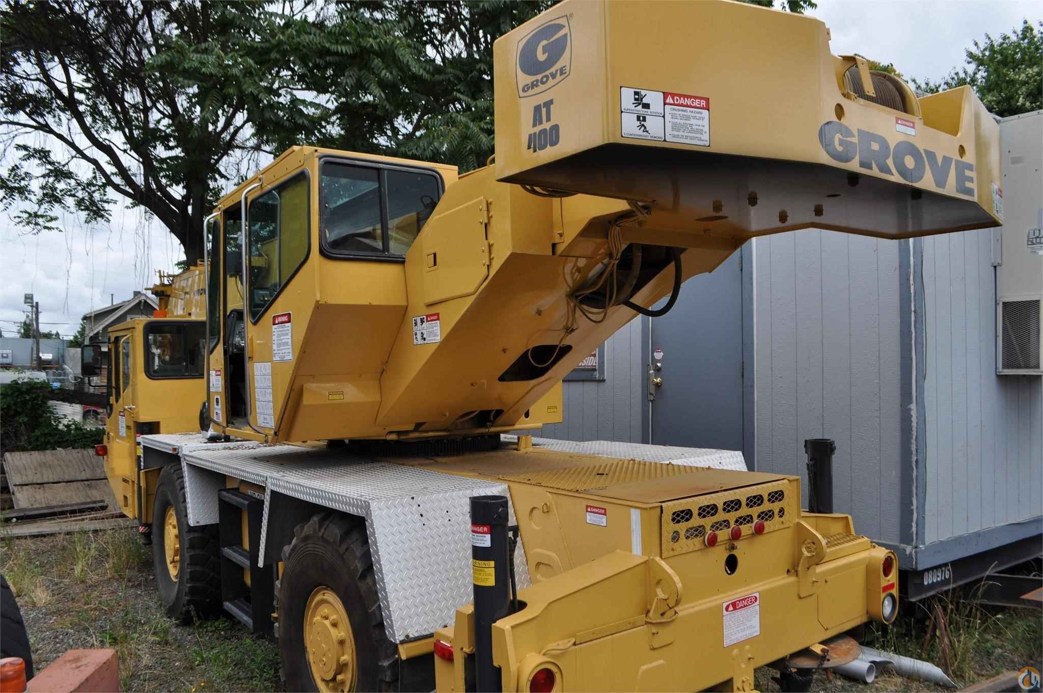 Grove AT422, 22 ton all terrain 4X4 drive hydraulic crane, 190 HP Cummins 6BTA5.9 diesel single engine, automatic power shift transmission, 27' - 70' three section full power boom, 25' to 43' telescoping swing away jib, main and auxiliary winches, rooster sheave, PAT DS350G load moment indicator, anti-two block system, complete driver controls from upper operators cab, four steering modes, hydraulic joy stick controls, 22 ton 3 sheave hook block, hook and overhaul ball.