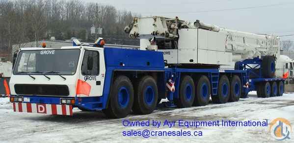 Location...Ontario, Canada. 197' MAIN BOOM, 194' LUFFING JIB, 167' FIXED, OFFSETTABLE JIB 71' SWINGAWAY, SUPER LIFT, 80 TON HOOK BLOCK, MAIN & AUXILIARY WINCHES, GROVE EKS 4 LOAD INDICATING SYSTEM - SET 85% / FT / LBS, 6 AXLE CARRIER, MERCEDES POWER, ALLISON CLT755, 20.5R25 TIRES, BOOM REMOVAL, BOOM FLOAT KIT WITH THREE AXLE DOLLY 109,064 KM, AND 7,300 SERVICE HRS, WHITE & BLUE