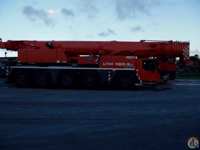 2009 LIEBHERR LTM 1160-5.1; 62 meter main boom, 22 meter swing away jib, drive is 10x8x10, A/C in both cabs, 2 winches, 3 sheave block, single sheave block, ball, full 60 ton counterweight, 12,580 kilometers, 1,152 hours on the upper. Crane currently has 16.R25 tires but can be changed at cost to new 20.5 tires. Crane is excellent condition.