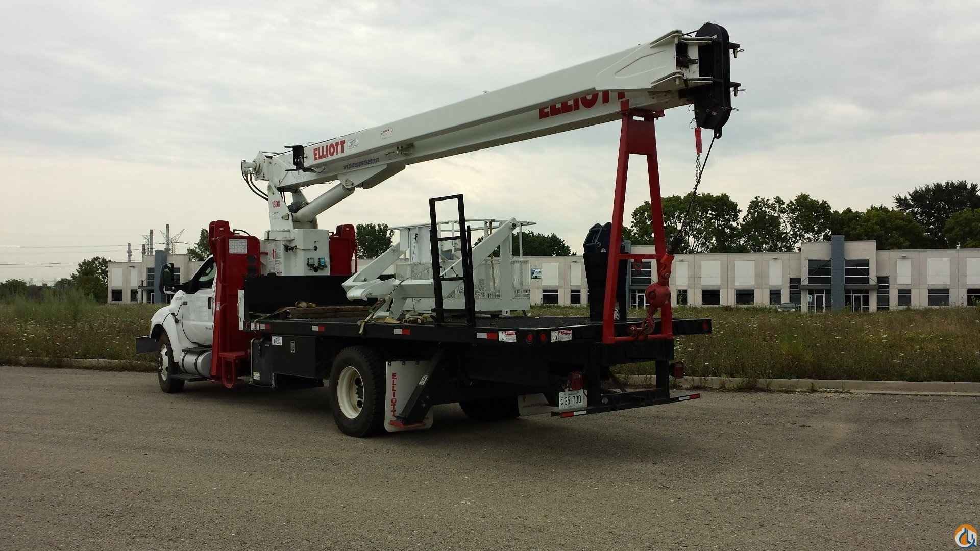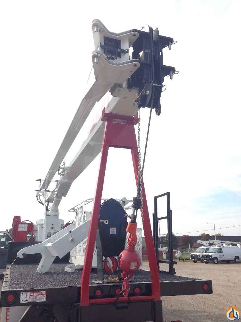 Front mount sub frame for a 20' bed, 27' retracted - 70' extended 3-section proportional boom, Sheave head equipped with three sheaves, Winch features: Burst of speed 12,800 lb. bare drum pull, 275' of 9'16" diameter 6x37 EIPS wire rope, 9,600 lb. single line pull, Internal boom hard-wired anti-two-block and Load Moment Indicator (LMI), Hydraulic overload protection system, 372 degree non-continuous rotation. Hydraulic system includes: 3-section gear pump (counterclockwise rotation), 70 gallon oil reservoir with sight and temperature gauge, 10 micron return line filter, Single gate valve on suction line. Dual operator control console with platforms: Engine start/stop switch, Independently controlled outrigger and stabilizer levers, Bubble level gauge, Signal horn, Variable speed foot throttle, Lifting capacity chart, range diagram chart, and boom angle indicator, System pressure gauge (roadside), Cup holder, 12V power outlet, Horizontal, removable type boom rest at end of sub frame, Downhaul weight with hook. Maximum tip height of 80', Maximum lifting capacity of 18 US tons at a 5' radius. Electronic throttle interface. Rear bumper with receiver tube, Backup alarm, Safety triangle kit, Unit certified to ANSI B30.5 for Mobile Cranes.