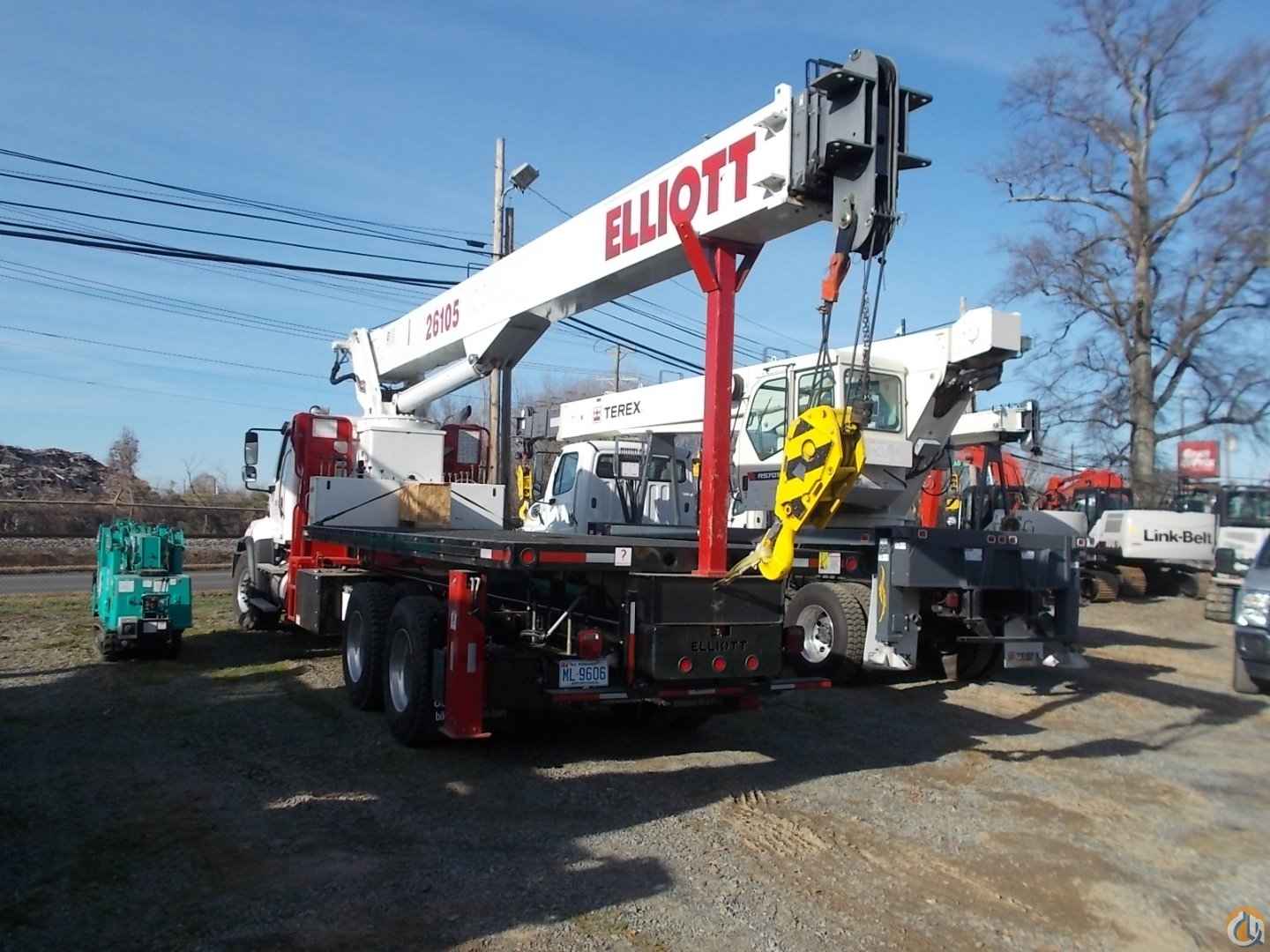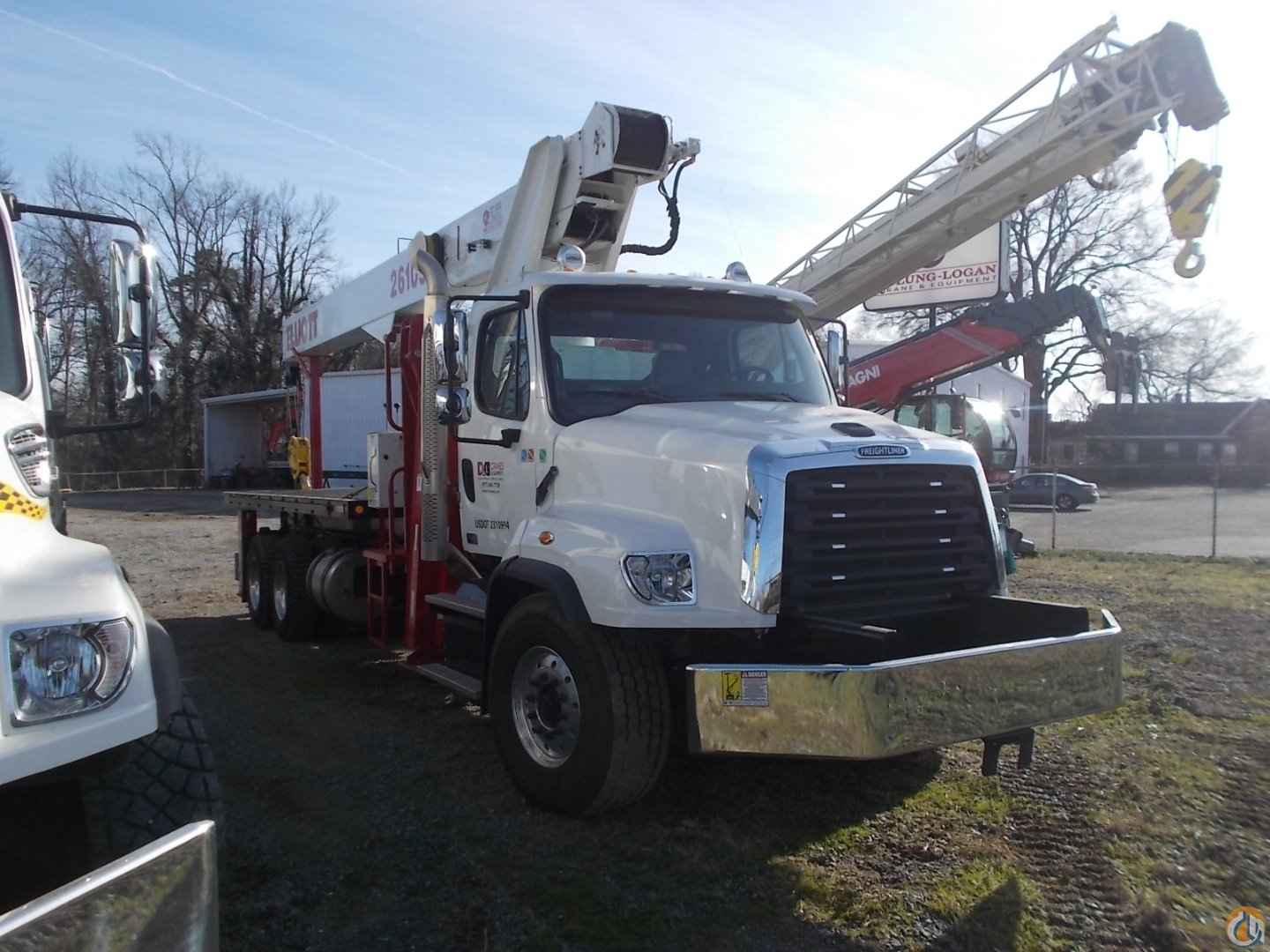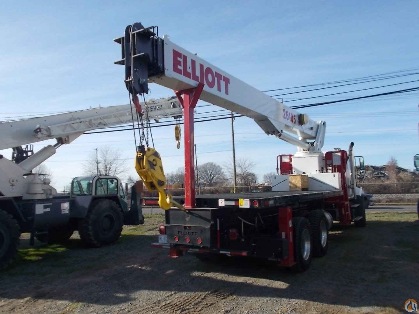 Used 26 ton Elliott w/ 105’ of Main Boom; 20’ Steel Bed; 26’-45’ 2-Piece Jib w/ Manual Extension; 20-Ton Line Block; Air Shift PTO, Mounted on 2014 Freightliner M2-114, Detroit Diesel450 HP, FUller 10spd, 40,000 rears on 46,000 tuftrac suspension, Dif locks, 2 stage engine brake, Full Double frame Chassis, Alum. wheels, Chrome Bumper & Grill, A/C, Pwr windows, Standard White Paint Scheme