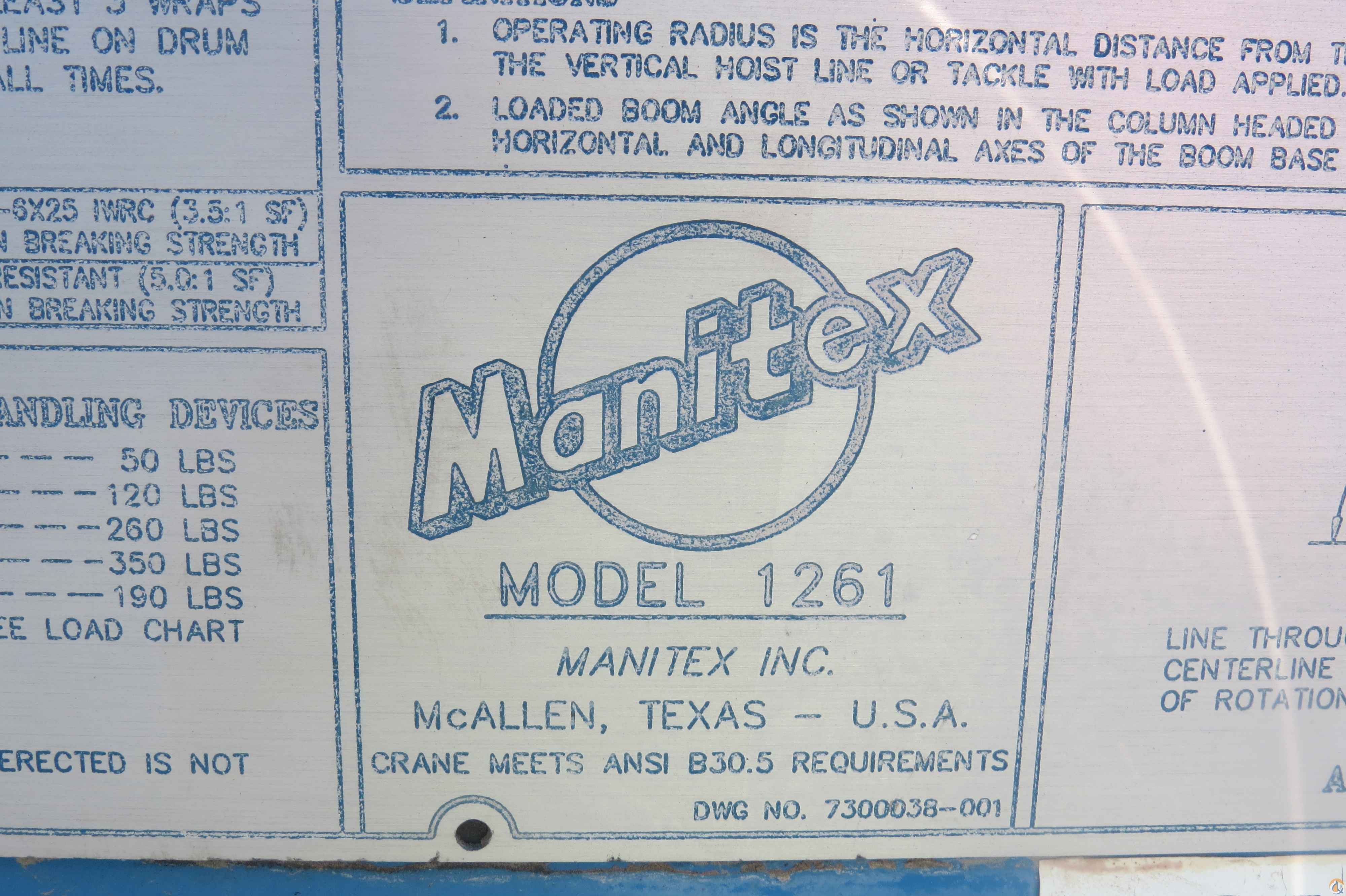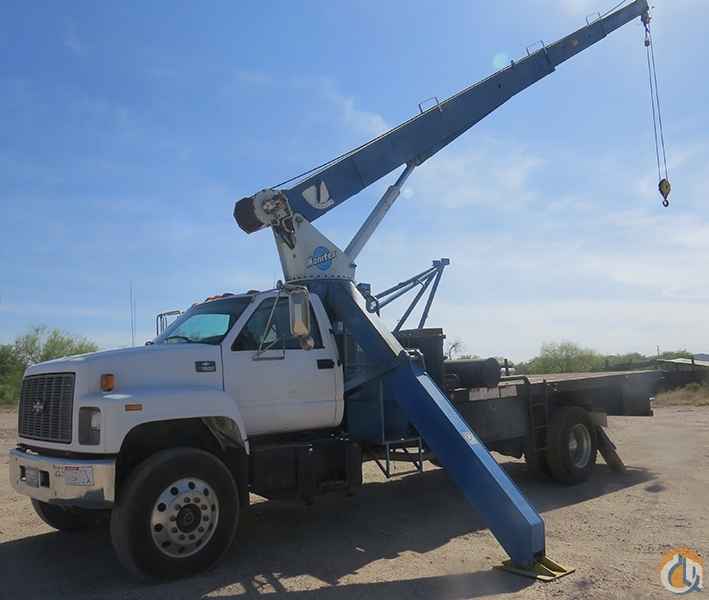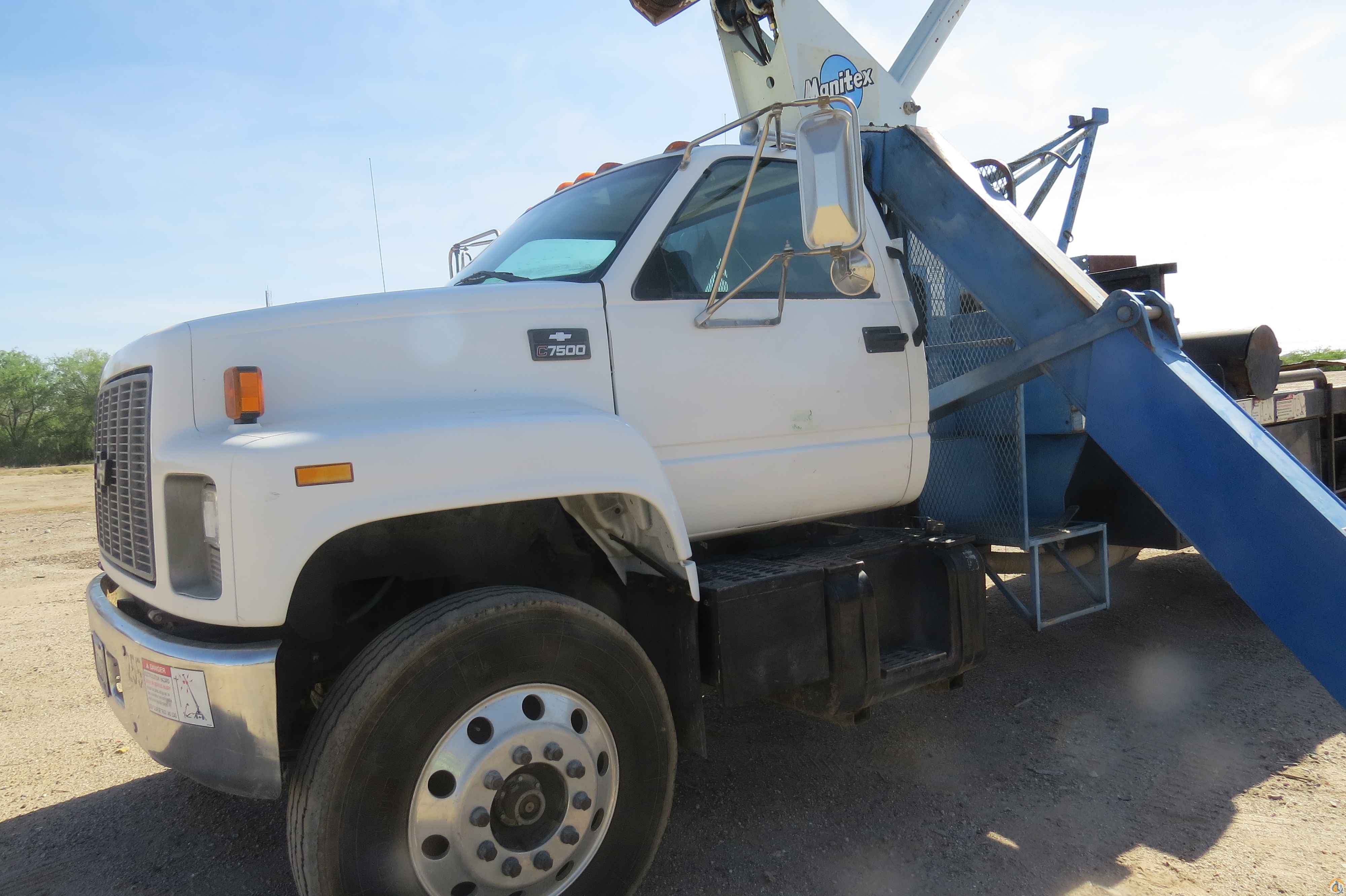 2000 Chevy C7500 with Manitex 1261 12.5 ton crane. 64800 miles. Cat 3126 engine. Automatic transmission. 61 foot, three section boom. McKissick 20,000 pound block. 18 foot steel bed. Pintle hitch. Good rubber. Aluminum wheels.