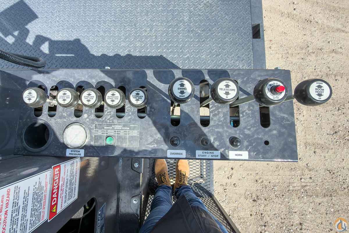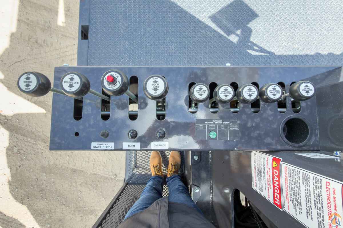 Dual operator stations are equipped with four single-lever crane controls arranged in accordance with ANSI B30.5 standards. Fully proportional control valves. A system pressure gauge is mounted on the driver’s side console. Each station includes individual control levers for each outrigger and stabilizer for precise leveling. These control levers are shorter and positioned towards the center of the crane away from the main crane controls for added safety. Both control stations are equipped with engine start/stop, foot throttle, signal horn, boom angle indicator, load chart and range diagram.