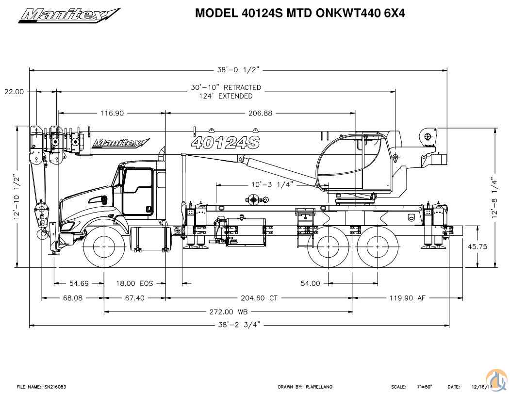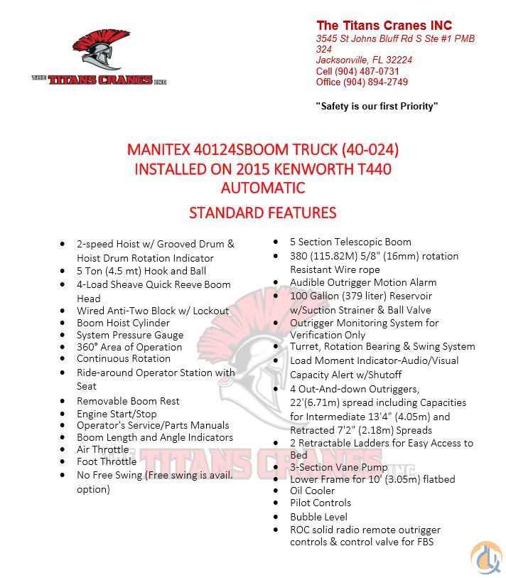 • 40124S 40 Ton with 124’, 5 Section Telescoping Boom – NO FREE SWING • New Style Tilting Cab with Heat and Air Conditioning • 2 Piece 30.5’ – 55’ Hard Wired, QA Jib • 35 Ton 3-Sheave Load Block • 10' Steel Bed • Rear Mount Installation • Engine Monitoring System • Hot shift PTO (Required with Automatic Transmission) • Drive Shaft for Pump Installation (Required with Automatic Transmission) • Hydraulic Reservoir, Chassis Mounted required when there is no bed • Front Center Stabilizer (Requires Additional Mounting Charge) • Mounting--Front Center Stabilizer