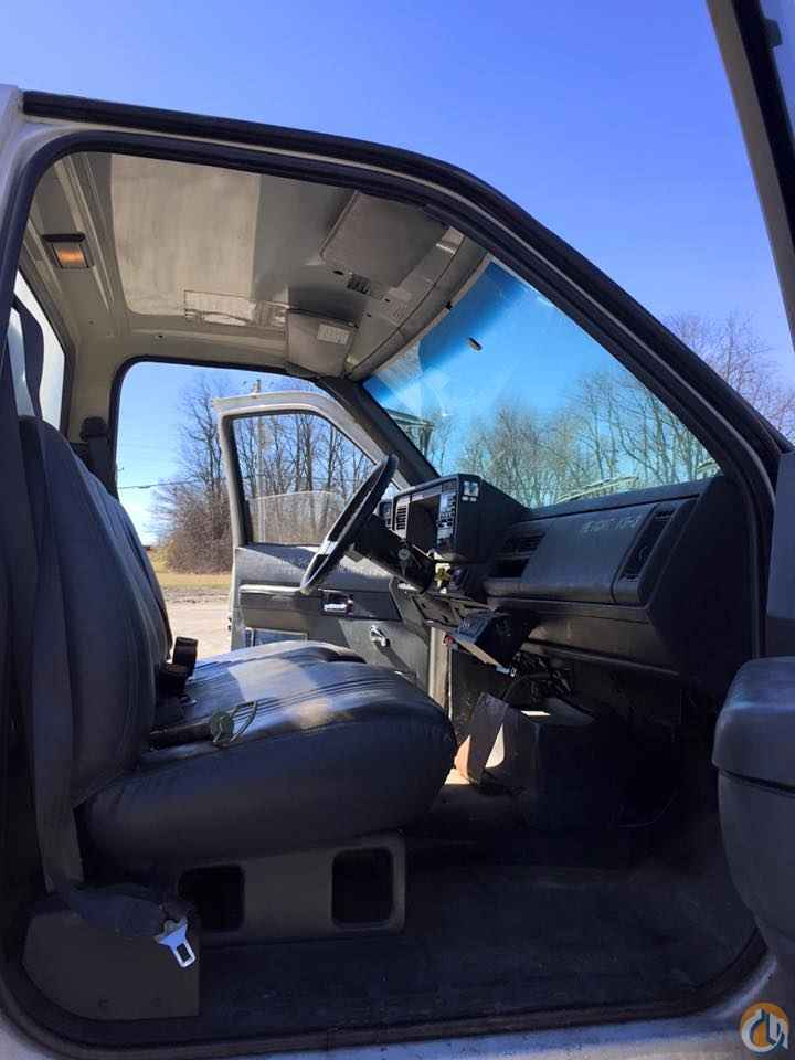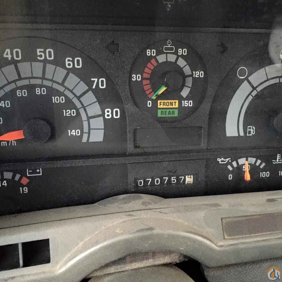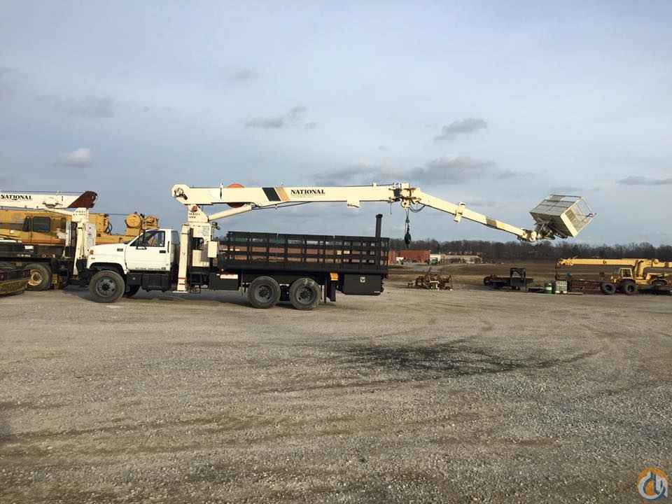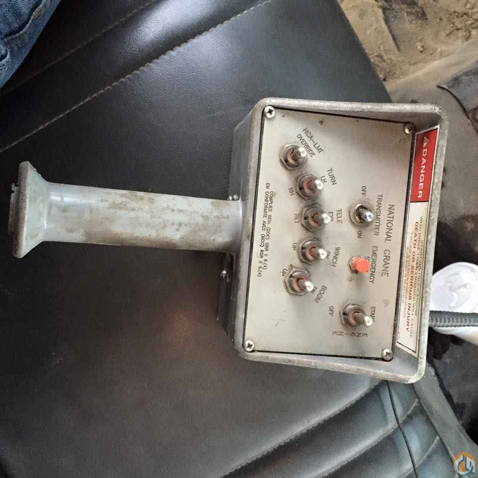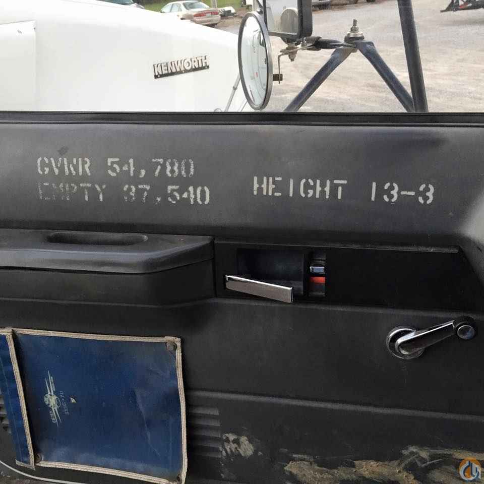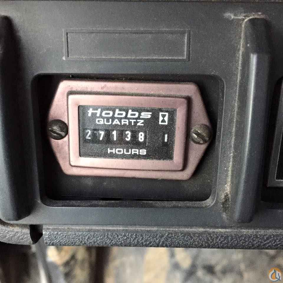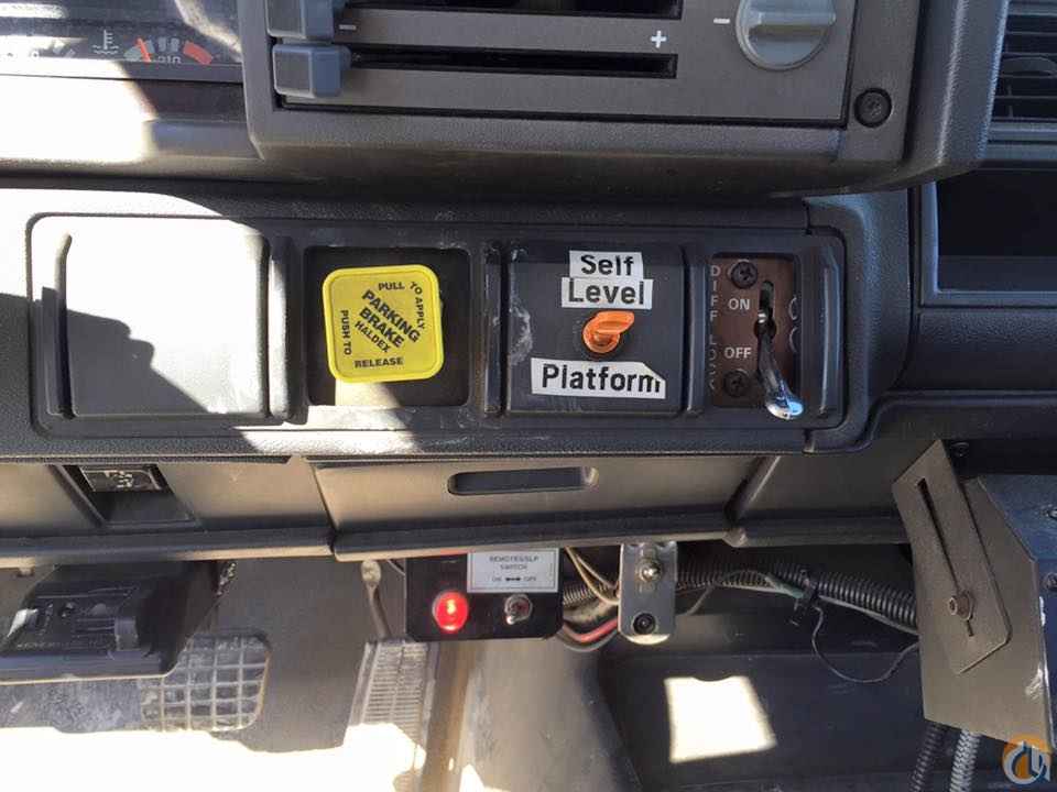 Boom mounted behind the cab, 106' sheave height 15 angling self leveling removable jib with man platform with wireless remote. Heel winch dual controls and 5 outriggers.