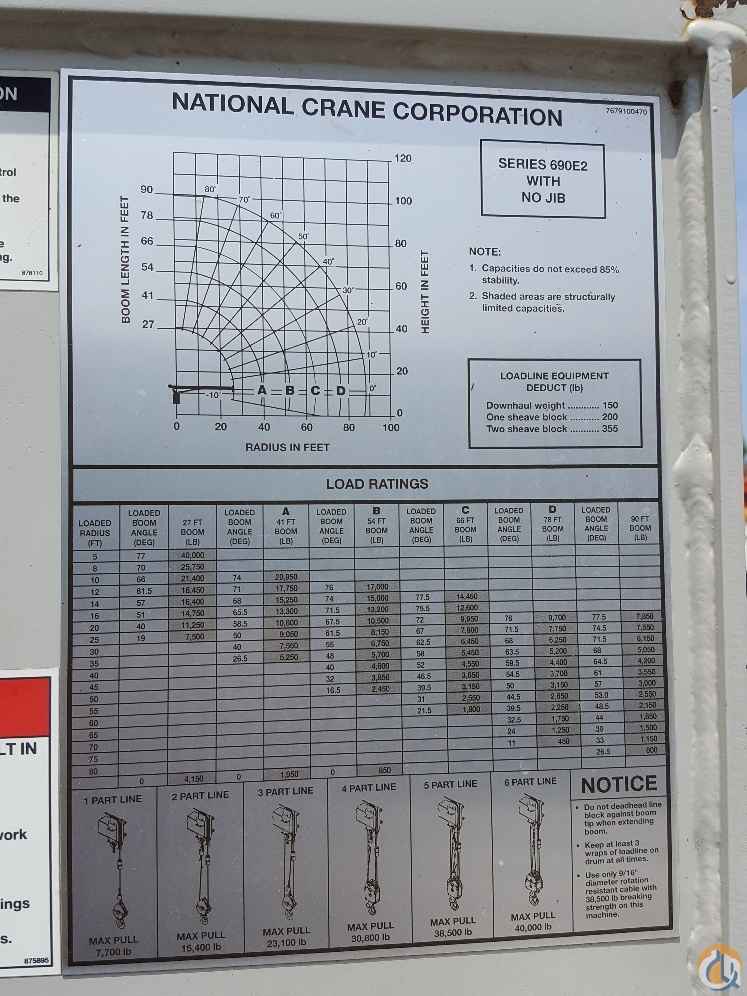 2013 National 690E2, 20 ton, 90’ boom, No jib, mounted on Peterbilt 345, Paccar PX8 350 hp, Eaton Fuller 8LL, eng brake, 20K lb frt, 40K lb rears, Hendrickson suspension, aluminum wheels, 20 ft flat bed, McKissick 210 lb 1 sheave block, 52K miles & 8000 total engine hours, 2500 PTO hours.