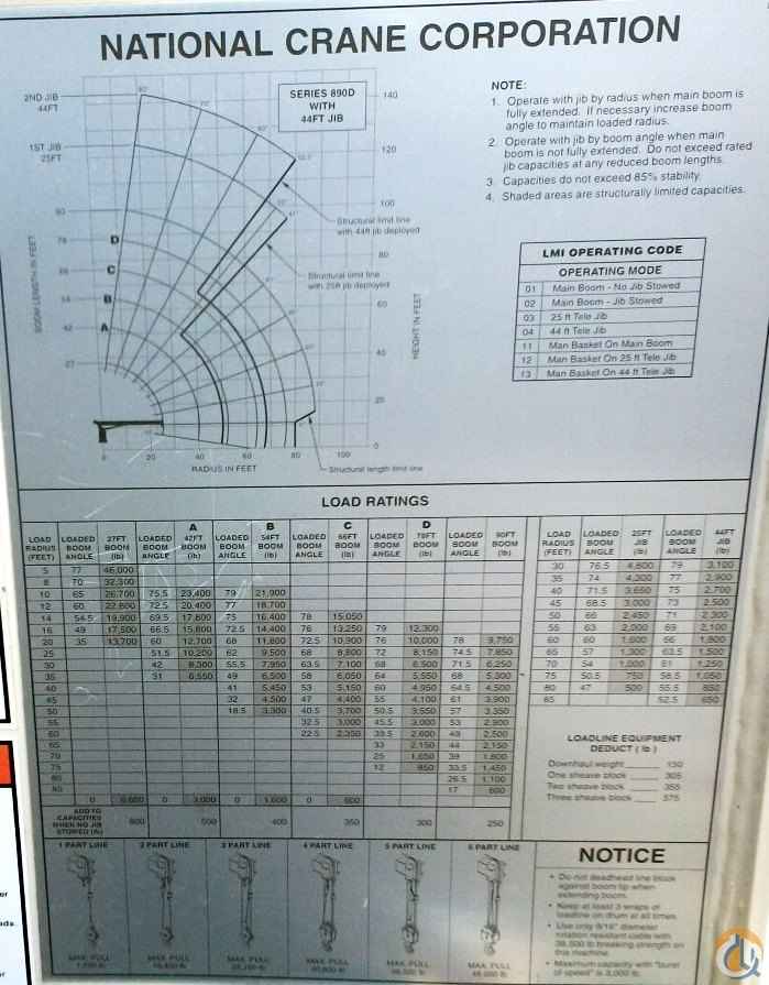 USED NATIONAL 890D 23 TON CAPACITY, 90 FT. 4 SECTION BOOM, 100 FT. TIP HEIGHT, PAT DS 160 LMI SYSTEM, ANTI TWO BLOCK, 4 HYDRAULIC OUTRIGGERS, HD 19' 8" FT. WOOD BED, OVERHAUL BALL, PAINTED NATIONAL WHITE, ALL STANDARD EQUIPMENT, SOLD AS IS, WHERE IS, NO WARRANTY IS EXPRESSED OR IMPLIED