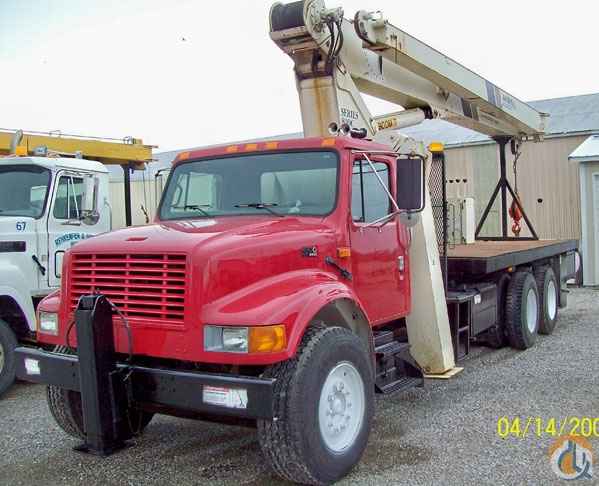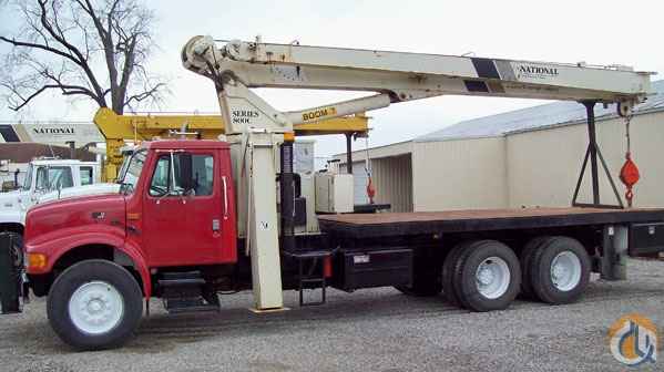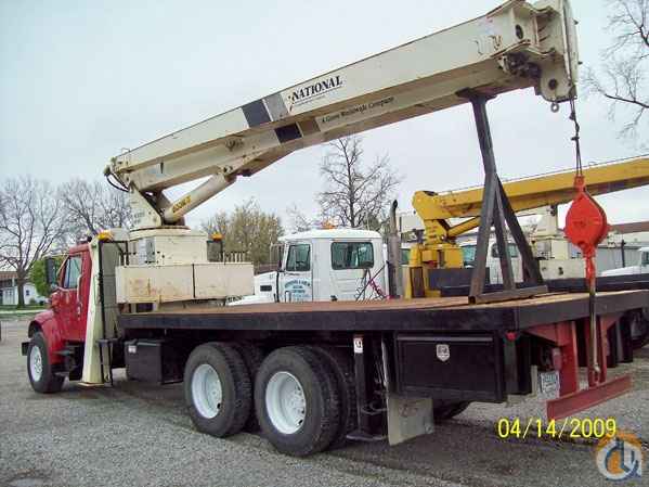 Location...Illinois. 1995 International 4900 National 880C Boom Crane 80' Boom 43' Jib DT-466 Diesel Eaton 9-Spd Transmission 71,298 Miles Full Locking Rear Axles 16,000 Frt. Axle 40,000 Rear Axles 20' Steel Flatbed W/ side Boxes Front and Rear Hydrauli Stabilzers