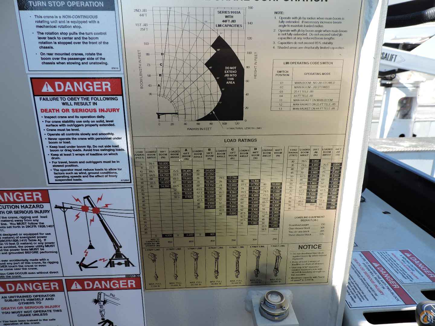 - Anti-two block safety device; shuts off telescope out and winch up controls and does not allow hook to be pulled into sheave case includes keyed override.
