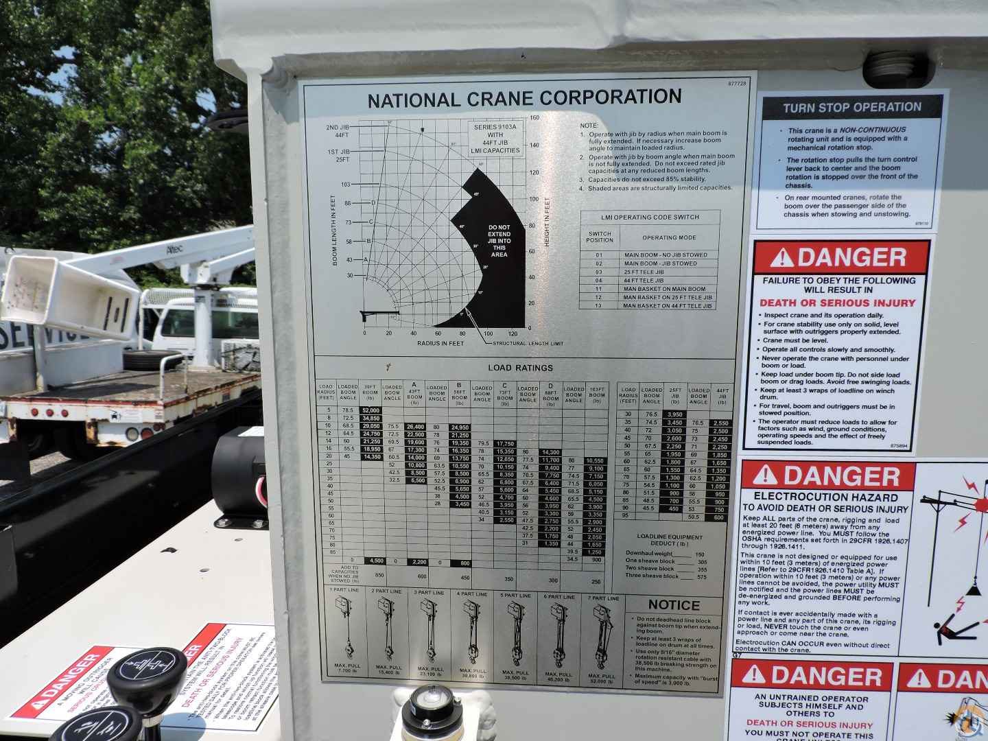 - Anti-two block safety device; shuts off telescope out and winch up controls and does not allow hook to be pulled into sheave case includes keyed override