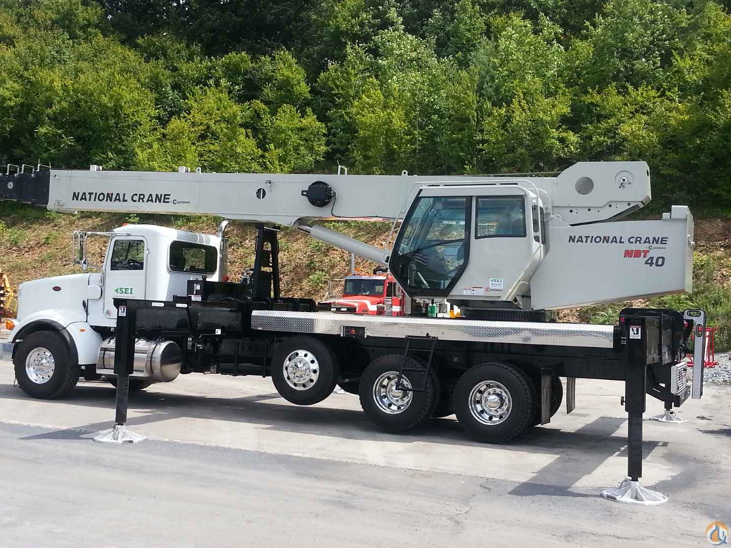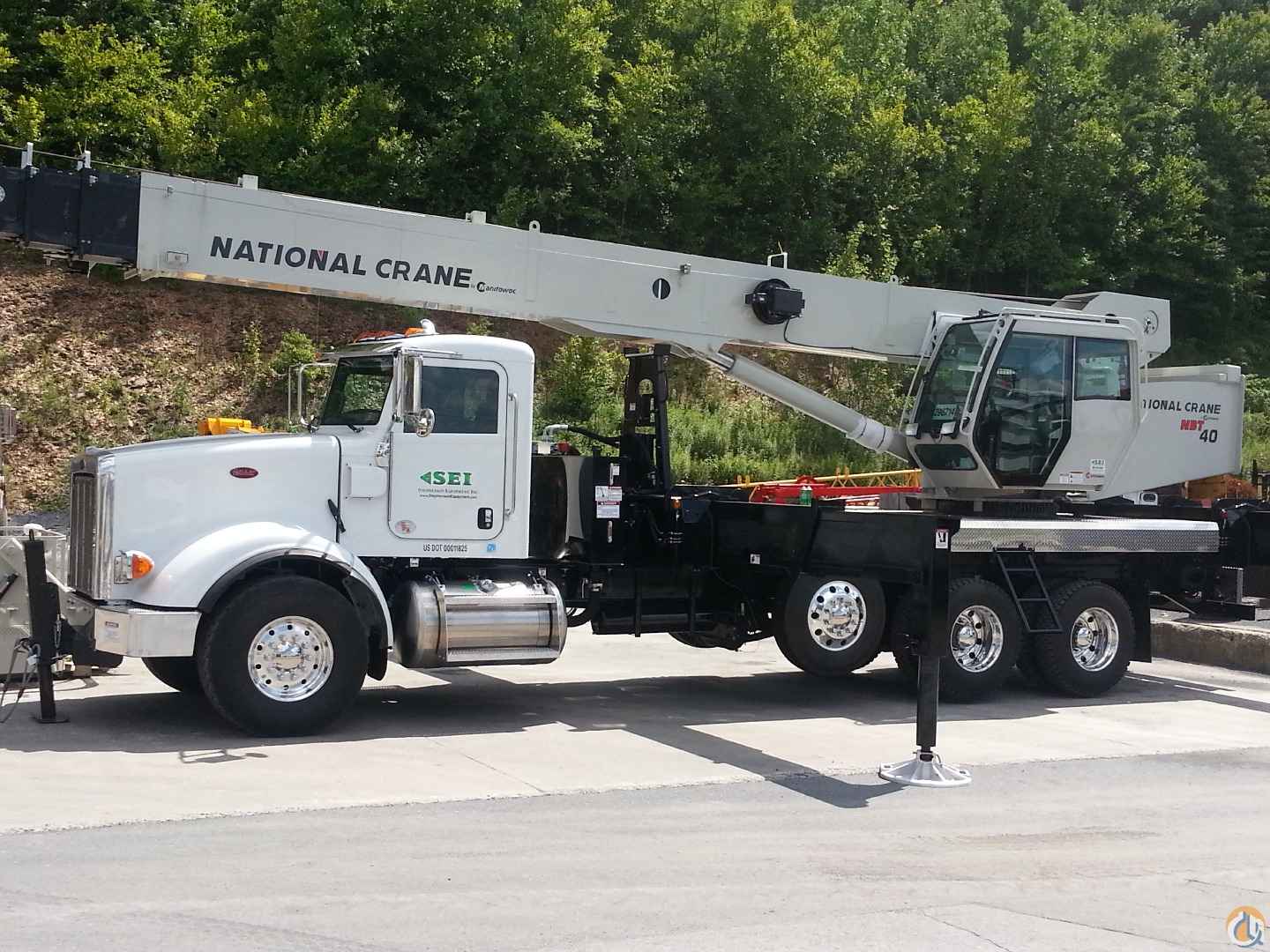 40 ton Capacity, 31’ to 127’ five section boom. 31 ft. to 55 ft. jib (telescoping boom ext. includes 24ft manual pull out section to 55 ft.). 360 degree continuous rotation . Graphical LMI system with audio/visual warning system and control lever lockout . 450 ft of 5/8” wire rope. 20 ton single sheave “Quick Reeve” type block with swivel hook & latch. Yoke style, 72 in x 36 in steel basket, gravity hung with cylinder brake lock, includes quick-attach boom attachment. Four function radio remote control. Mounted on a 2013 Peterbuilt Chassis VIN# 2NPTL40X5DM175886, 73,280 GVW.