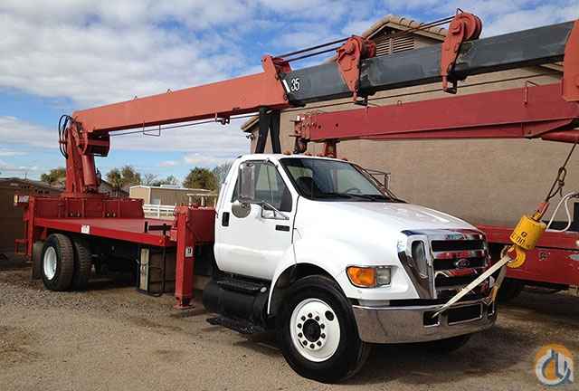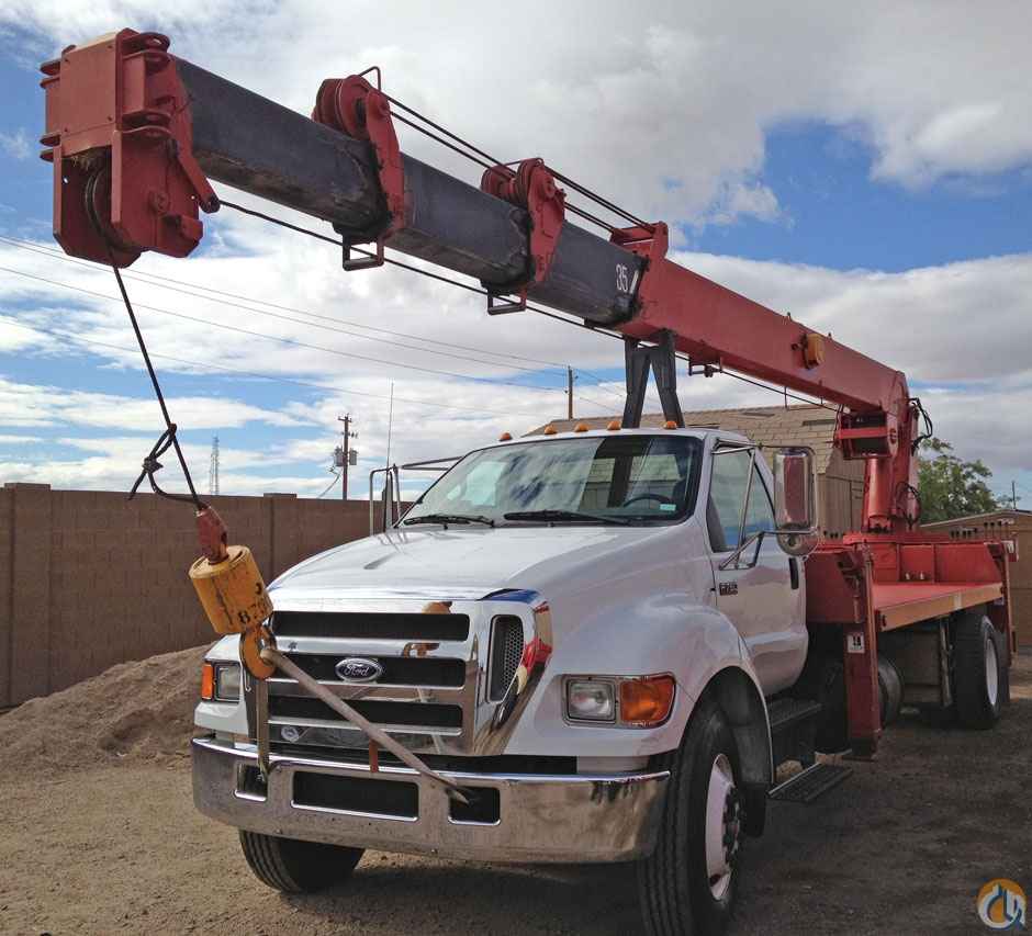 UNIC 1582RM rear mount crane mounted on a 2006 Ford F750 truck. The crane is equipped with continuous rotation, 4 out & down outriggers, 92 ft. tip height with main boom (optional 24 ft. jib available for a 116 ft. tip height), 16 ft. HD deck, and a Hi-speed. The truck is a 33,000# G.V.W., air brakes, 245 HP Cummins Turbo diesel engine, and a 6-speed transmission.