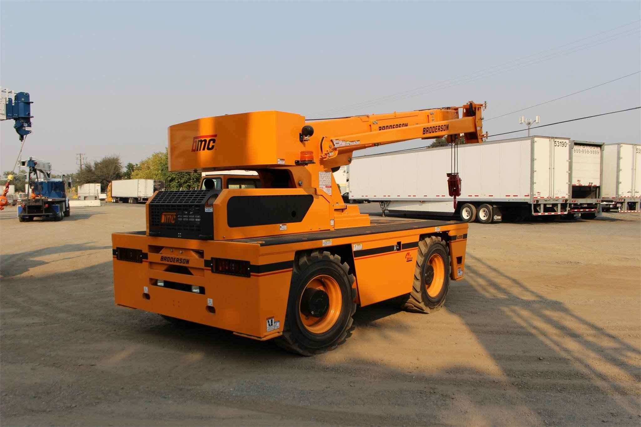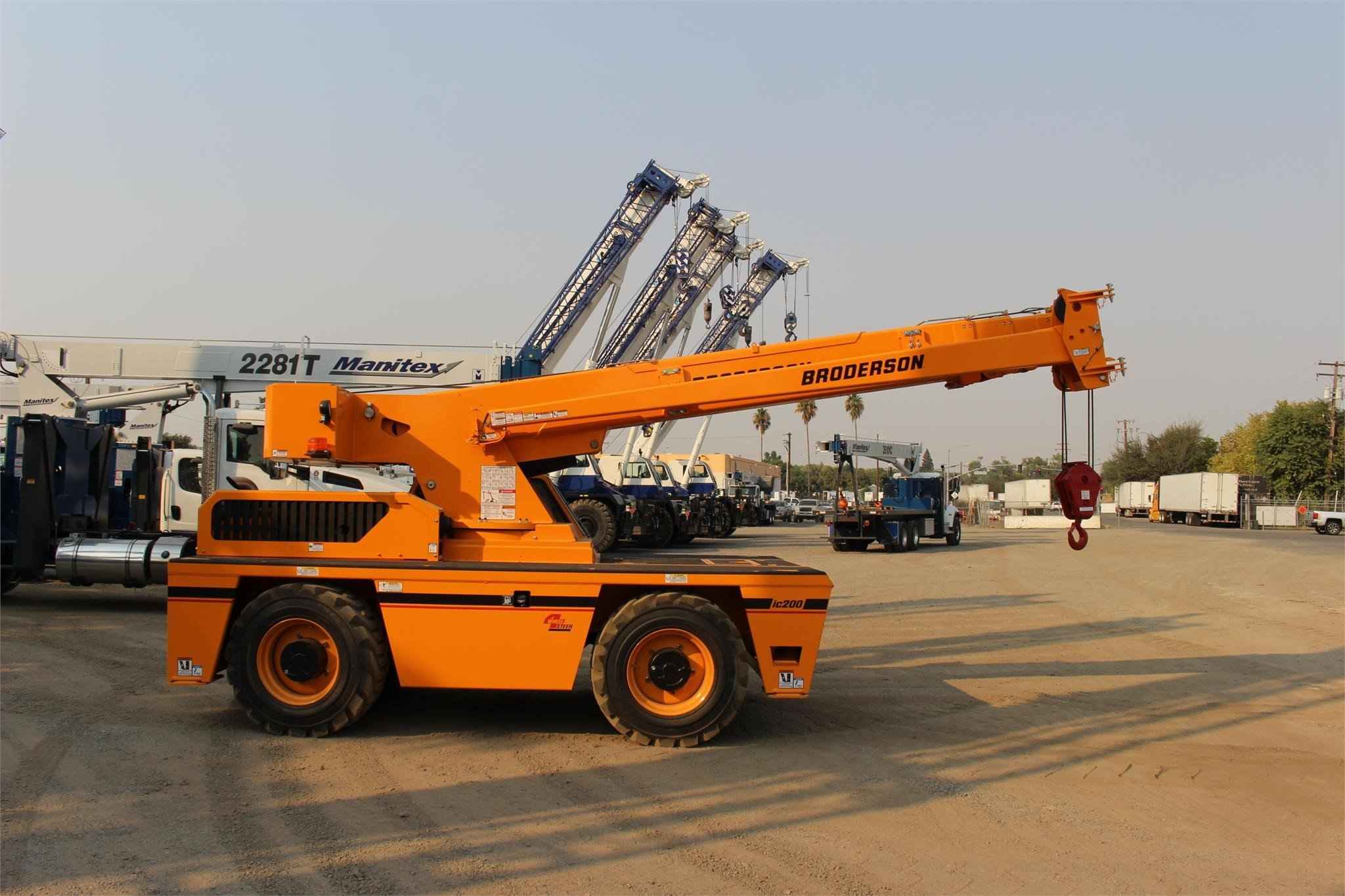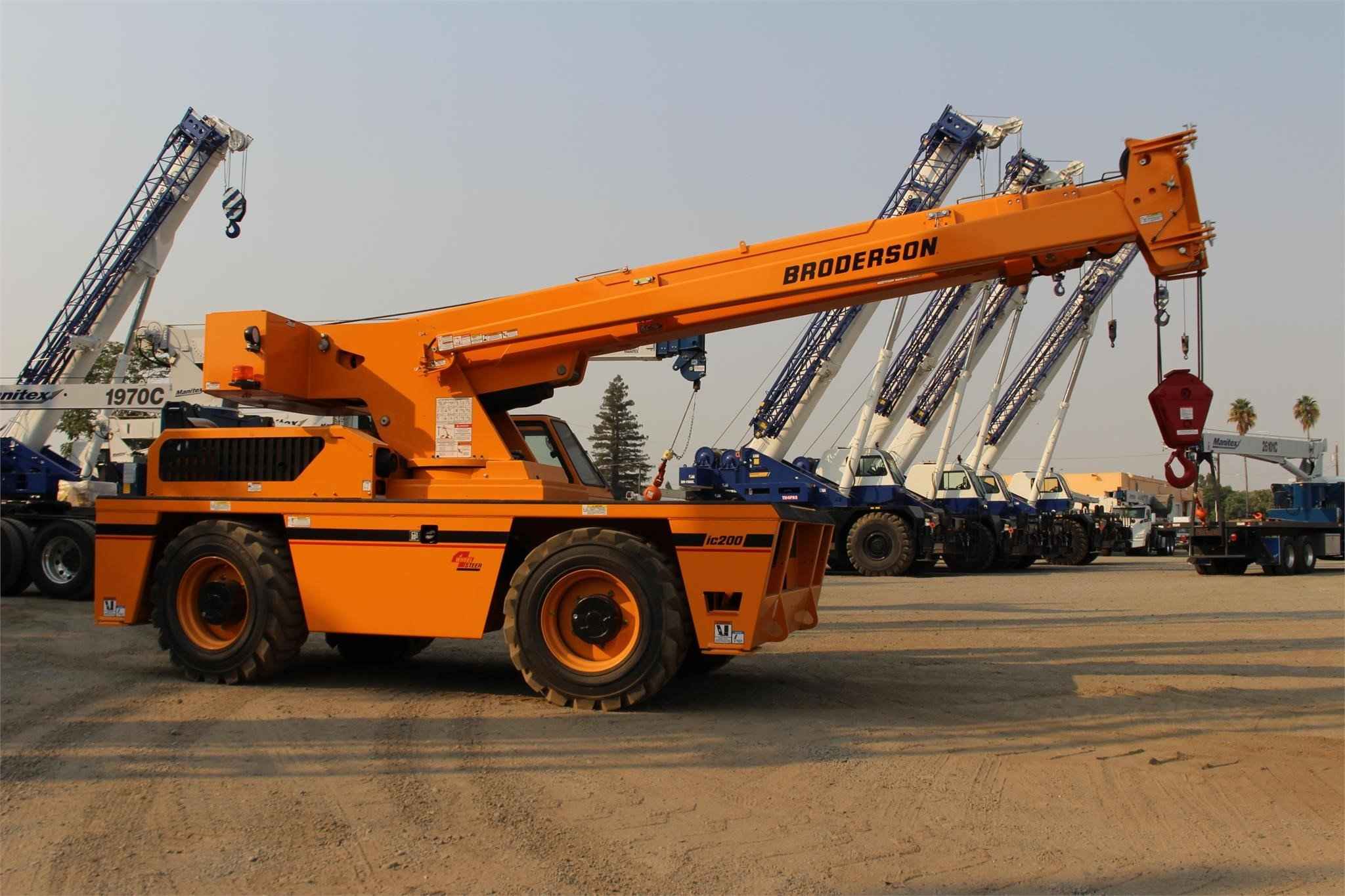 BRODERSON IC-200-3J 15 TON CRANE Standard Features: Self-Loading Carry Deck crane increases the range of current and potential future applications. 4-Section Boom with a continuous 360 degree swing rotation turret. Simple, rugged worm drive gear box results in greater reliability, 15’6” – 50’0” Boom. Hoisting with a hydraulically-powered turret-mounted planetary gear system provides all the low speed power to lift heavy loads, yet also a high speed setting for faster cycle times when lifting lighter loads. Hydraulic Power is provided by a direct driven tandem pump delivering 29 gpm. Rated Capacity Limiter warns the operator of impending overload with audible and visual signals, and stops boom functions in the event of overloads. Multiple Steering Configurations: 2-Wheel, 4-wheel or crab steering. Electronic sensors and control box automatically align the steering when a new mode is selected. EPA Tier 4 Cummins QSF3.8L Diesel Engine Powershift Transmission, with 4 speeds forward and reverse, minimizes bumps and jolts during shifting that is possible at any engine speed in any gear. Heavy Duty Chassis Frame provides a front deck carrying capacity of 17,000 lbs. Drum Rotation Indicator improves operator productivity. Easy Access to engine compartment and hydraulic equipment components simplifies maintenance and repair. Narrower and Lower Profile Design for better access to tight workspaces as well as easy transport. Available Features Included: • Industrial Crane with 15’6” – 50’0” Boom • Four -Wheel Steer & Two Wheel Drive • High Traction Tread, 385/65D22.5 16 ply • All Weather Cab, w/heater, defroster, & wiper • Deluxe Operator Seat • Strobe Lights • Boom Work Lights • Work Lights – Rear • Boom Extension – 16 ft. Offset • Rated Capacity Limiter • Hoist Drum Rotation Indicator • Sheave Block, 4-Part