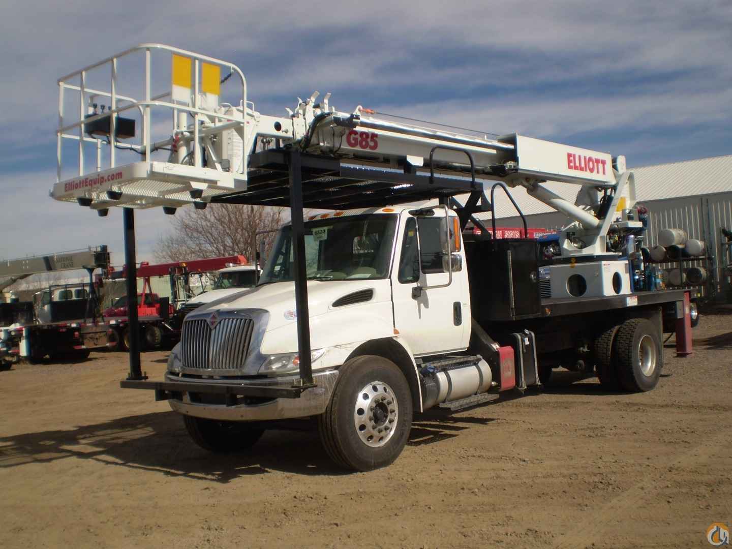 Elliott HiReach G85R, having a 85' working height. Basic unit includes base assembly supporting rear mounted rotating turret, hydraulically powered continuous rotation mechanism, oil reservoir mounted to truck frame, oil, and manual hydraulic controls mounted to turret. Electronic proportional three stick remote controls on platform. Base mounted "MH" type hydraulically powered, individually controlled rear main outriggers and “A” secondary outriggers behind cab. High strength steel four section hydraulically telescoping boom with one double acting 7" lift cylinder plus (1) 2 1/2" piggyback and (1) 3" extension cylinder. Two exposed cable carriers to boom tip. Hydraulically self-leveling and rotating 40" x 60" EZR work platform with remote leveling from platform. Power take off and pump drive, pressure gauge, pump and holding valves on all cylinders. Remote start/stop at upper and lower controls, 12-volt emergency pump with switch at upper and lower controls, PTO hour meter, backup alarm, fire extinguisher, safety triangle kit, and two body harness and lanyards. L.E.D. lights to include all bed marker lights, stop, tail and turn. Installed on chassis, tested and ready to operate. Unit certified to ANSI A92.2 for Vehicle-Mounted Elevating and Rotating Aerial Devices. Platform capacity 500 lbs.