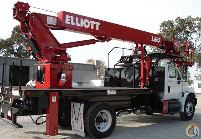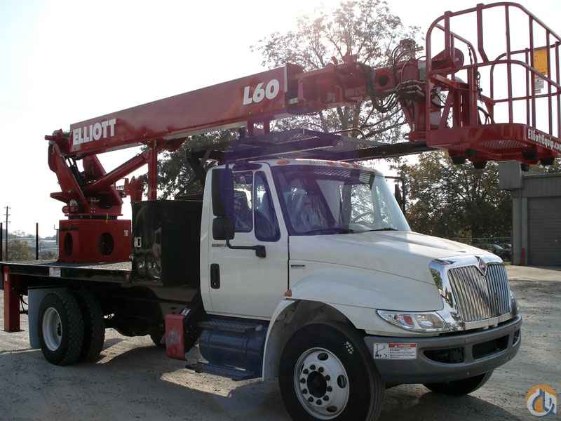 One new Elliott Hi-Reach L60R-MHA having a 62' working height. Basic unit includes base assembly supporting rear mounted rotating turret, hydraulically powered continuous rotation mechanism, oil reservoir mounted to truck frame, oil, and manual hydraulic controls mounted to turret. Base mounted "MH" type hydraulically powered, individually controlled rear main outriggers and “A” secondary outriggers behind cab. Steel three section hydraulically telescoping boom with one double acting 6" lift cylinder plus a 3" piggyback extension cylinder. One exposed cable carriers to boom tip. Hydraulically self-leveling and rotating 30" x 54" EZR work platform with remote leveling from platform. Power take off and pump drive, pressure gauge, pump and holding valves on all cylinders. Remote start/shutdown at upper and lower controls, 12-volt emergency pump with switch at upper and lower controls, PTO hour meter, backup alarm, fire extinguisher, and two body harness and lanyard. Safety triangle kit. Unit painted red, white or black. Installed on chassis, tested, checked and ready to operate. Unit certified to ANSI A92.2 for Vehicle-Mounted Elevating and Rotating Aerial Devices. Platform capacity 500 Lbs.