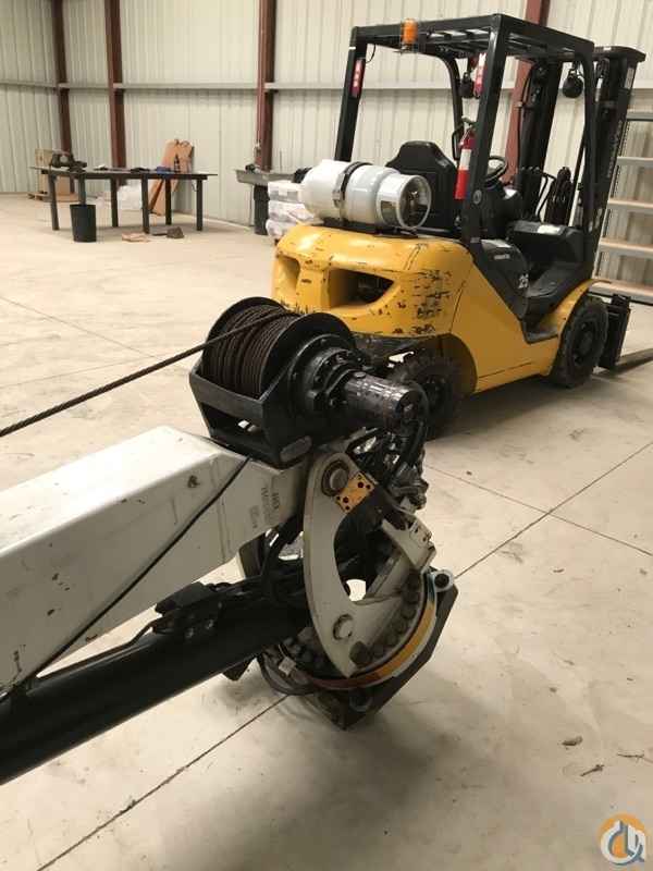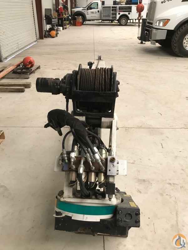 The planetary winch is powered by a high-torque hydraulic motor. The winch is operated at a line speed of 60 fpm (18.2 m/min) under no-load conditions. The one-part line lifting capacity of the winch is 5500 lb (2500 kg). Maximum two-part line winch capacity is 10,500 lb (4762 kg). The winch is equipped with 100' (30.5 m) of 7/16" (1.1 cm) 6x25 FW PRF RRL IWRC XIPS wire rope. A compact, anti-two-block device is included to prevent the lower block or hook assembly from coming in contact with the boom sheave assembly. The winch meets ANSI B30.5 standards.
