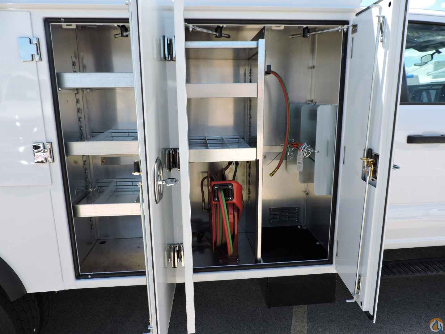 - CS1V – Divider kit with shelves and 8” drop well. Oxy-Acetylene bottle holder holds 2 bottles. Oxy-acetylene twin hose reel with 50’ twin hose