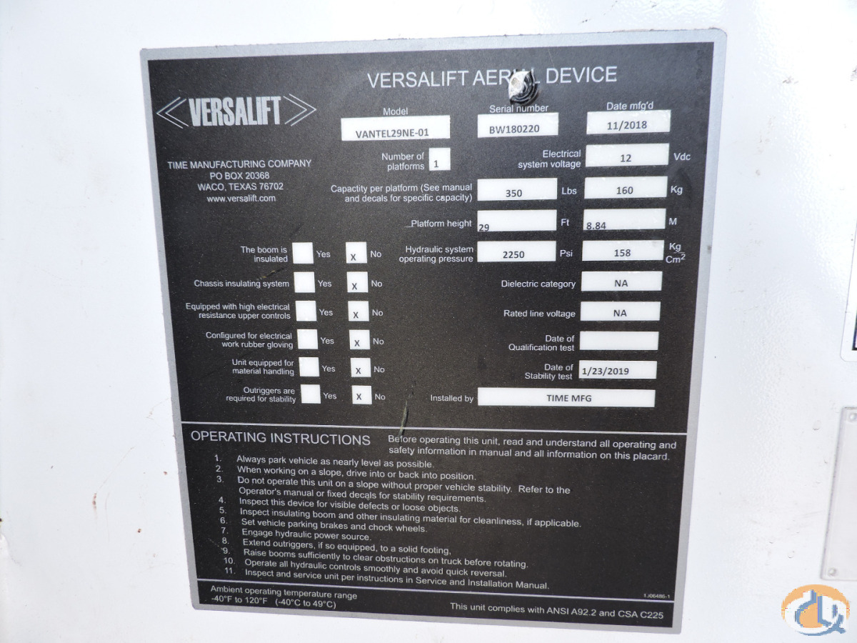 2018 Versalift Vantel-29-NE equipped as follows:
