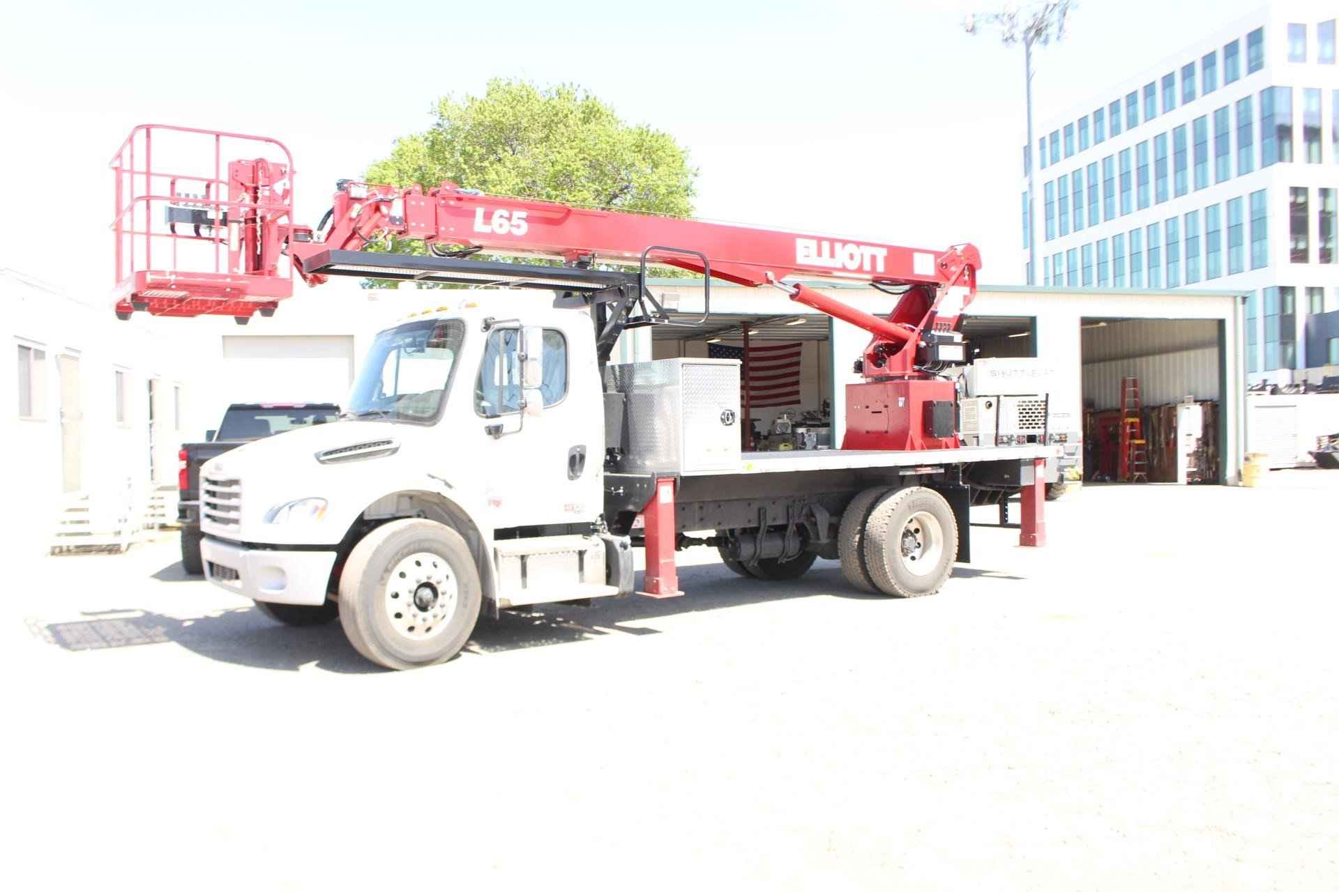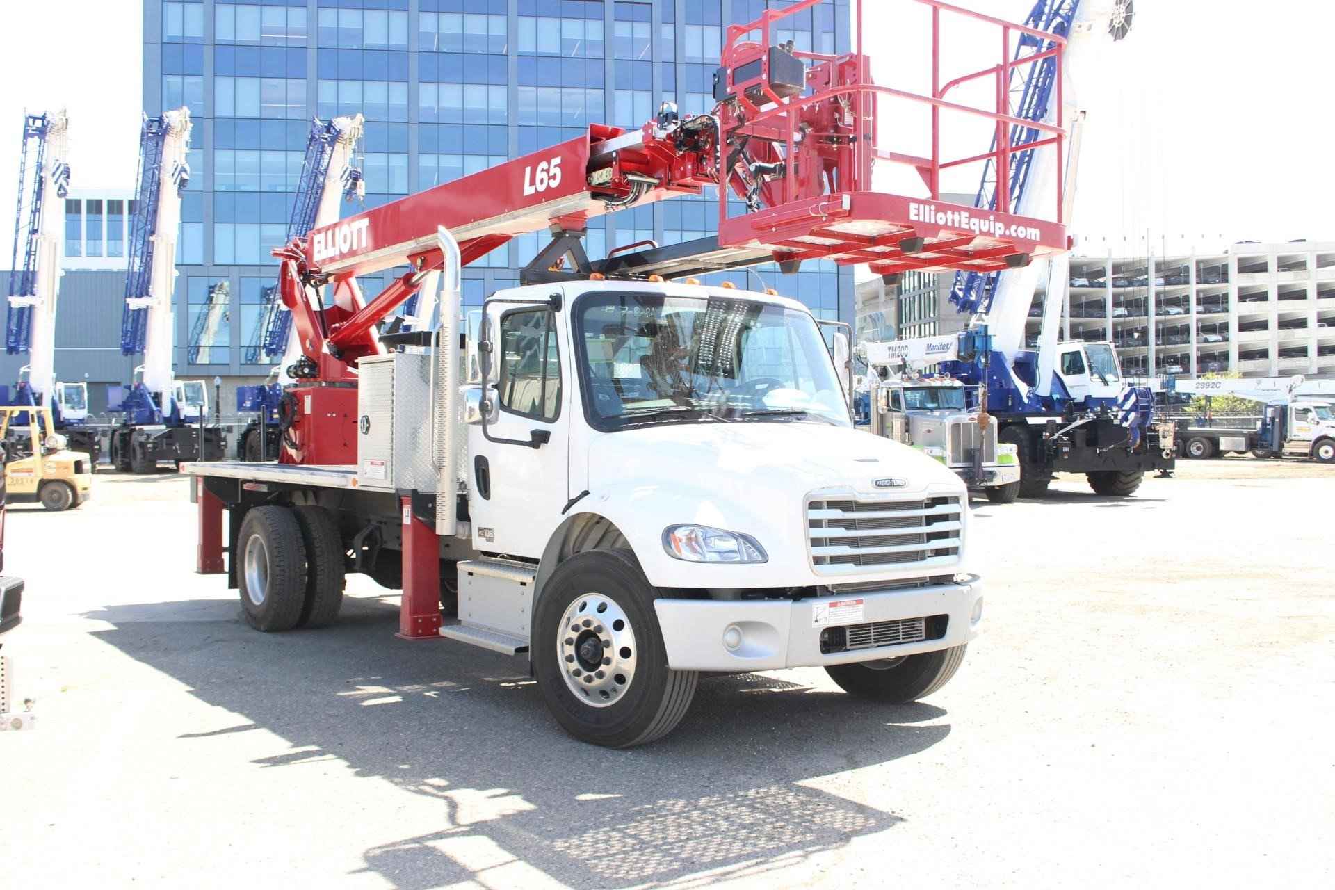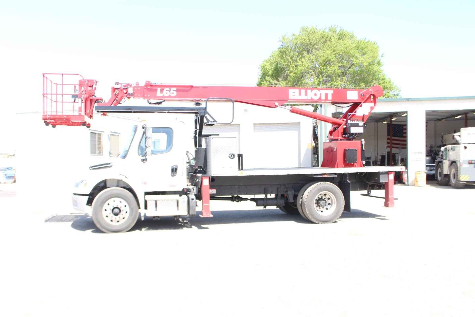 June 15, 2023 Unit 119042 New Unit ELLIOTT L65R Standard features: One new Elliott HiReach L65R having a 65' working height. Side Reach – 56’6” (Center of rotation to end of platform), Platform Capacity – 600lbs., Rear mount turret with boom stowed over the truck cab, Certified ANSI A92.2 for vehicle-mounted elevating and rotating aerial devices, Boom – 3 section 4-plate design, Lift cylinder – 6” double acting, Boom extension – Hydraulic (no cables), Continuous rotation, Oil reservoir – steel 30-gallon capacity includes sight and temperature gauge. Located back of turret box, Subframe-High strength full length, Lower controls – Electric over hydraulic on turret, Rear Outriggers – 17’0” out and down outriggers, Secondary outriggers – 12’0” out and down outriggers, Outrigger controls – rear of bed each corner. Electric over hydraulic, Cable Carrier – full length with tube for hoses and cables. Includes cover, Platform - hydraulic self-leveling with 160° of rotation. Aluminum floor, Hydraulic pump – fixed gear, USB outlet at upper controls, PTO hour meter, Chassis control – Start/Stop, Throttle and horn located at rear bumper, lower turret controls and upper platform, Automatic rotation lockout – Prevents boom from rotating to side where outriggers are not fully extended horizontally, Emergency pump – 12 volt with switch at lower turret and upper platform, Backup alarm, LED lights – bed marker, stop/tail/turn and reverse, Safety kit – Fire extinguisher, safety triangle kit, and two body harnesses with lanyards, Manuals – (1) operation, maintenance and safety, (1) Parts and (2) electronic copies of each, Maintenance filters –(1) extra high pressure and (1) return filter. Additional Options: • 40” x 60” Platform (standard) • 110 Volt Line to Platform • (2) Sign Forks on Platform Extendable • (4) Single-axis joysticks - hardwired • Walkway with steps and handrails. Includes boom rest. • 5,900 lb. Planetary Winch with Anti-Two-Block Switch, Horn, Two Part Hook, Cable Packer, 180' of 3/8" Cable, 2-part block & Retainer Lug • 500 lb. Platform Mounted Jib with Hydraulic Winch. Jib Stows in Platform. • Hot Shift PTO for Automatic Transmission • Aluminum 14’6” includes stake pockets and tie down rails. Black grip deck • (4) 24”x24”x1” composite plastic outrigger pads with (2) steel holders • Straight down (2 steps with grab handles) • 98" x 36" x 24" Aluminum Crossbody Box (Requires 2' Shorter Bed) (Treadplate-No paint) • One button operation – “Platform Stow” – Automatically stow the platform, “Platform Unstow” Unstow the platform to either side of the chassis at lower controls, “Chassis Auto-Level” – Automatically level the chassis with outriggers, “Outrigger Stow” – stow outriggers automatically • Chassis Rating - 25,999 lbs. GVWR Non CDL • Mounting Bracket Above Crossbody Box for Welder/Generator (Miller 185/230) • Welder/Generator Start/Stop Switch in Platform • Welder Leads to Platform - (2) 1 Gauge Cables • HiReach Unit Painted Red, Subframe Painted Black, Outriggers Painted Red (STD) MOUNTED ON 2024 FREIGHTLINER M2 106 Mounted on a 2024 Freightliner M2 106 with a 280 HP Cummins B6.7 diesel engine, 198” WB, 132” C.A. 90” AF, Allison 2500 RDS automatic transmission, 29,000 GVWR, Detroit DA-F-10.0-3 10,000 lb. drop single front axle, Detroit DA-RS-19.0-4 19,000 lb. R series rear axle, Michelin XZE2 11R22.5 14 ply radial front tires and Michelin XDN2 11R22.5 Radial rear tires, hydraulic brakes, 50 gallon alum fuel tank (LH), AM/FM radio, cruise control, power windows, power locks, tilt steering, air conditioning, air ride driver seat, two-man passenger bench seat, unit is painted white.