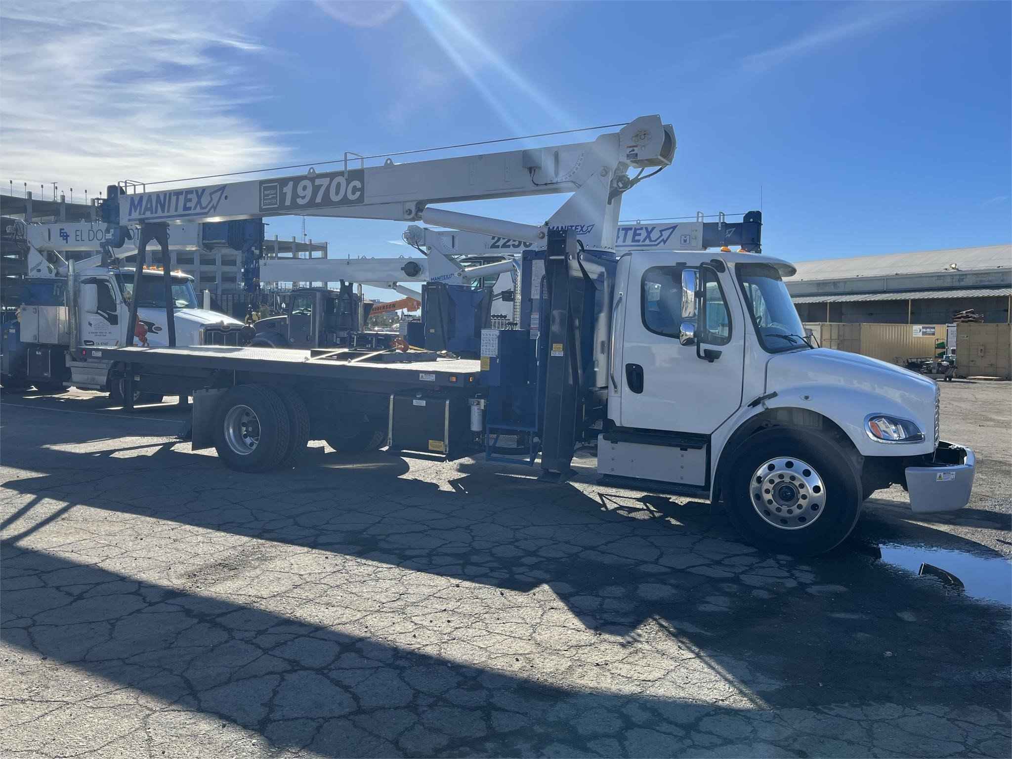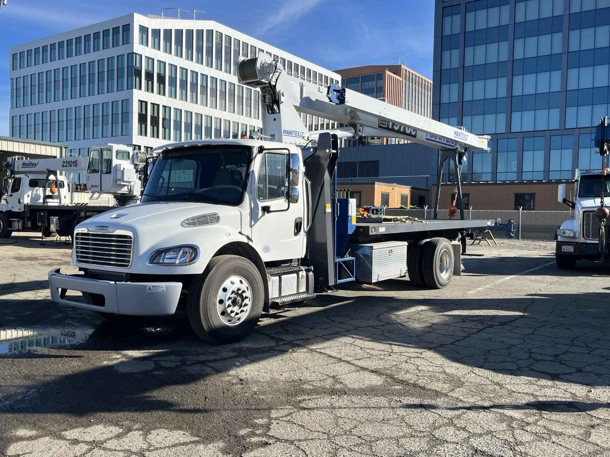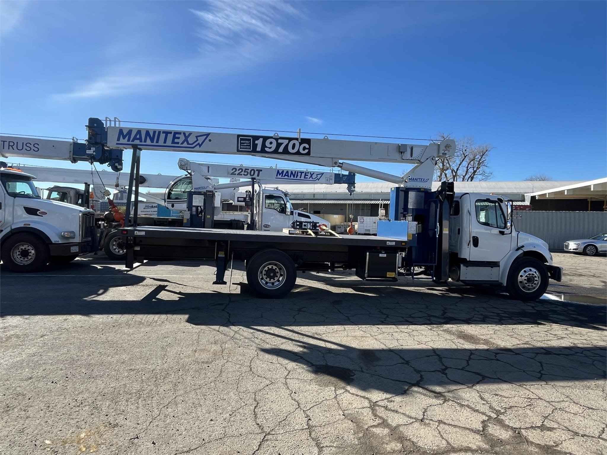 MANITEX 1970C 19 TON CRANE Standard features: 70’ Three-Section Telescopic Boom, 19 ton base rating at 5’ radius, 2-speed Hoist w/Grooved Drum, 7 Ton Hook and Ball, 3-Load Sheave Quick Reeve Boom Head, Externally wired Anti-Two Block w/lockout, Boom Hoist Cylinder, System Pressure Gauge, 372° Non continuous Rotation, Removable Boom Rest, Engine Start/Stop, Operator’s Service/Parts Manuals, Boom Length and Angle Indicators, Foot Throttle, Electronic Throttle, Bubble Level, 300’ of 9/16” EIPS IWRC Wire Rope, 70 Gallon HD Reservoir w/Suction Strainer & Ball Valve, Pedestal, Turret, Rotation Bearing & Swing System, Dual Operator Control Stations, Load Moment Indicator – Audio/Visual Alert w/Shutoff, Audible Outrigger /Stabilizer Motion Alarm, A-Frame Outriggers (21’6” spread width), A-frame rear stabilizers, 3-Section Hydraulic Pump – CCW Rotation is Standard, Subframe for 20’ bed, Outrigger Monitoring System verification only, Signal Horn. Additional Options Included: • 1 Piece 24’ Jib • Radio A2B • 3 Section Vane Pump-Clockwise Rotation • Standard Mount Installation • 20’ Steel bed with 1/8” thick Steel Thread Plate • Hotshift PTO • Rotation Resistant Rope in lieu of Standard • 15 Ton 1-Sheave Quick Reeve Block for 2-3 part line 9/16” rope • Chassis Mounted HD Hydraulic Reservoir in Lieu of Standard • Aluminum Toolbox (48” L x 24” W x 24” H) – Chassis Mounted MOUNTED ON 2024 FREIGHTLINER M2106 Mounted on a 2024 Freightliner M2106 with a Cummins B6.7, 280 HP diesel engine, Allison 2500 RDS Automatic Transmission, Detroit DA-F-14.7-3 14,000 lbs. drop single front axle, Detroit RS-21-160 21,000 lb. R- Series single rear axle, 50 gallon aluminum fuel tank, Heater and air conditioning with defrosters, full instrumentation, Full power windows, AM/FM/WB with Bluetooth, Single Air Horn Roof Mounted, Dual Mirrors, External Sunvisor, Halogen headlights and unit is painted White. Full set Alcoa wheels.