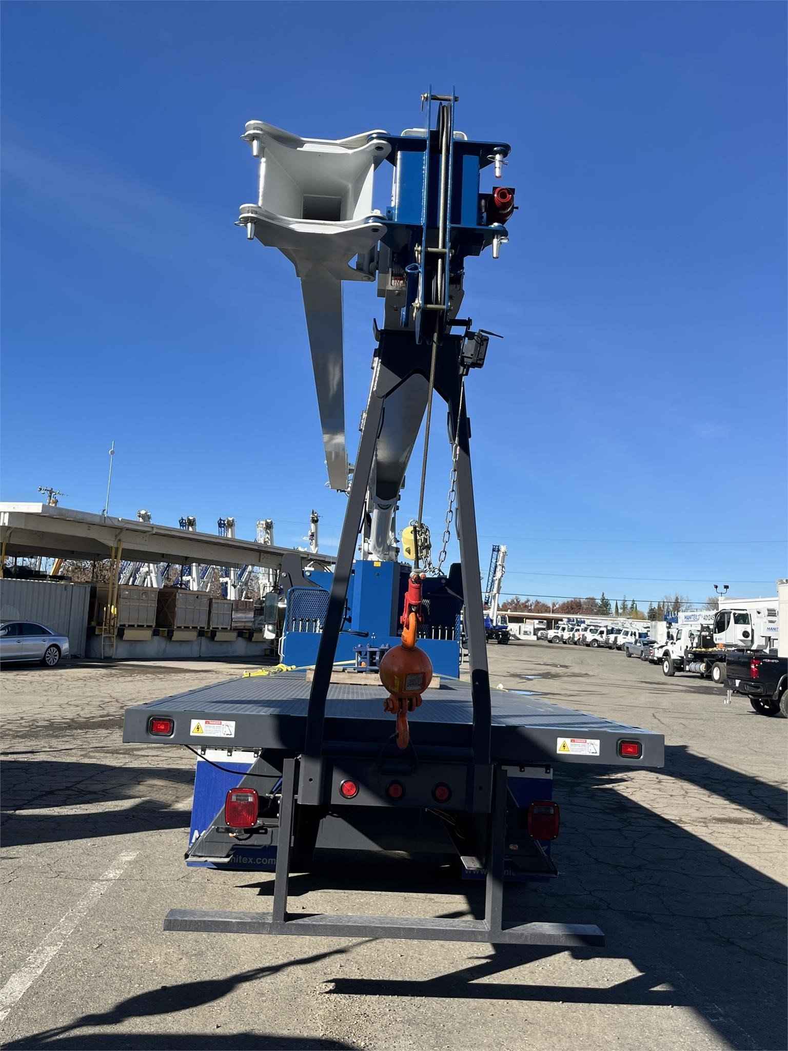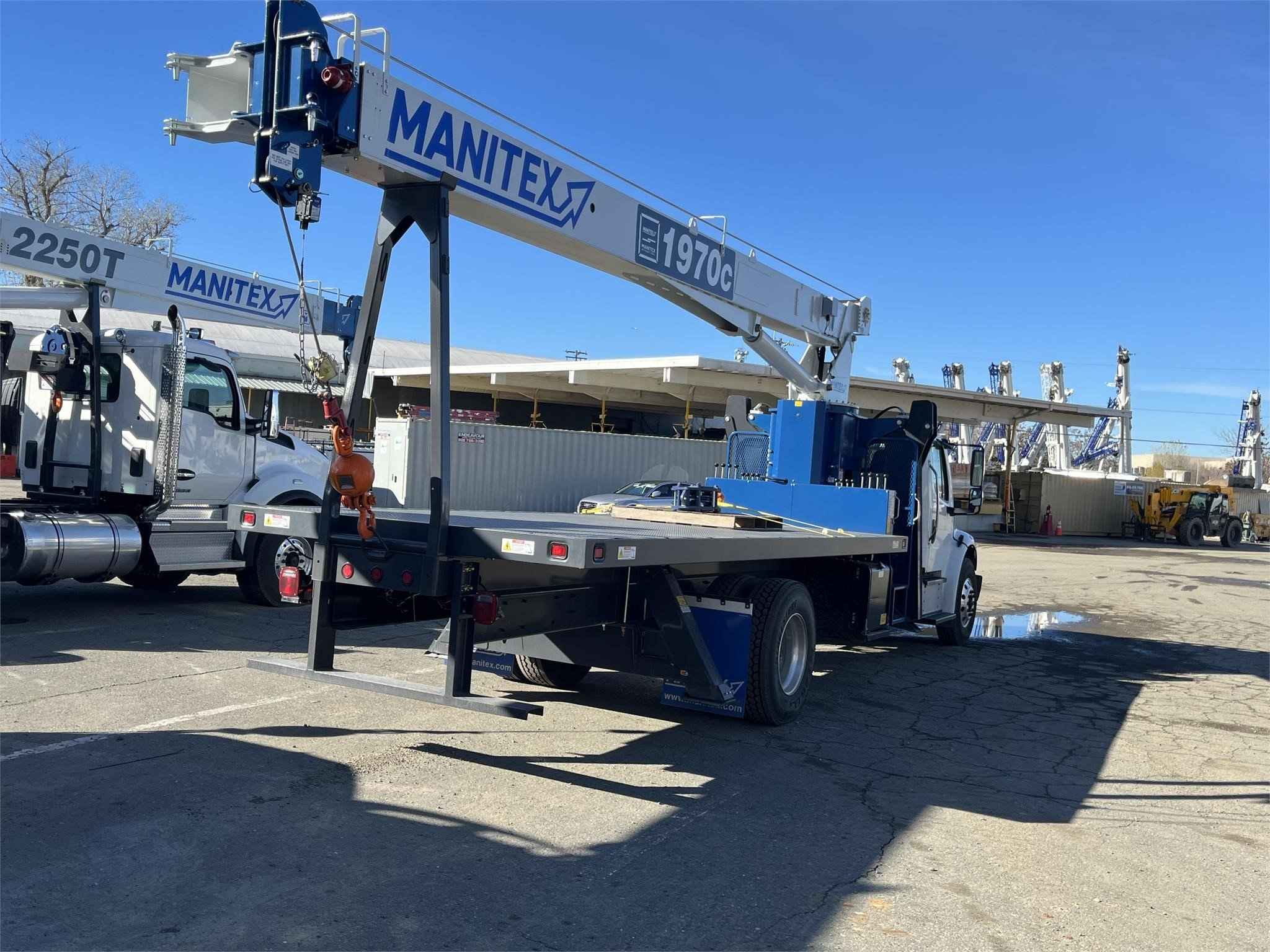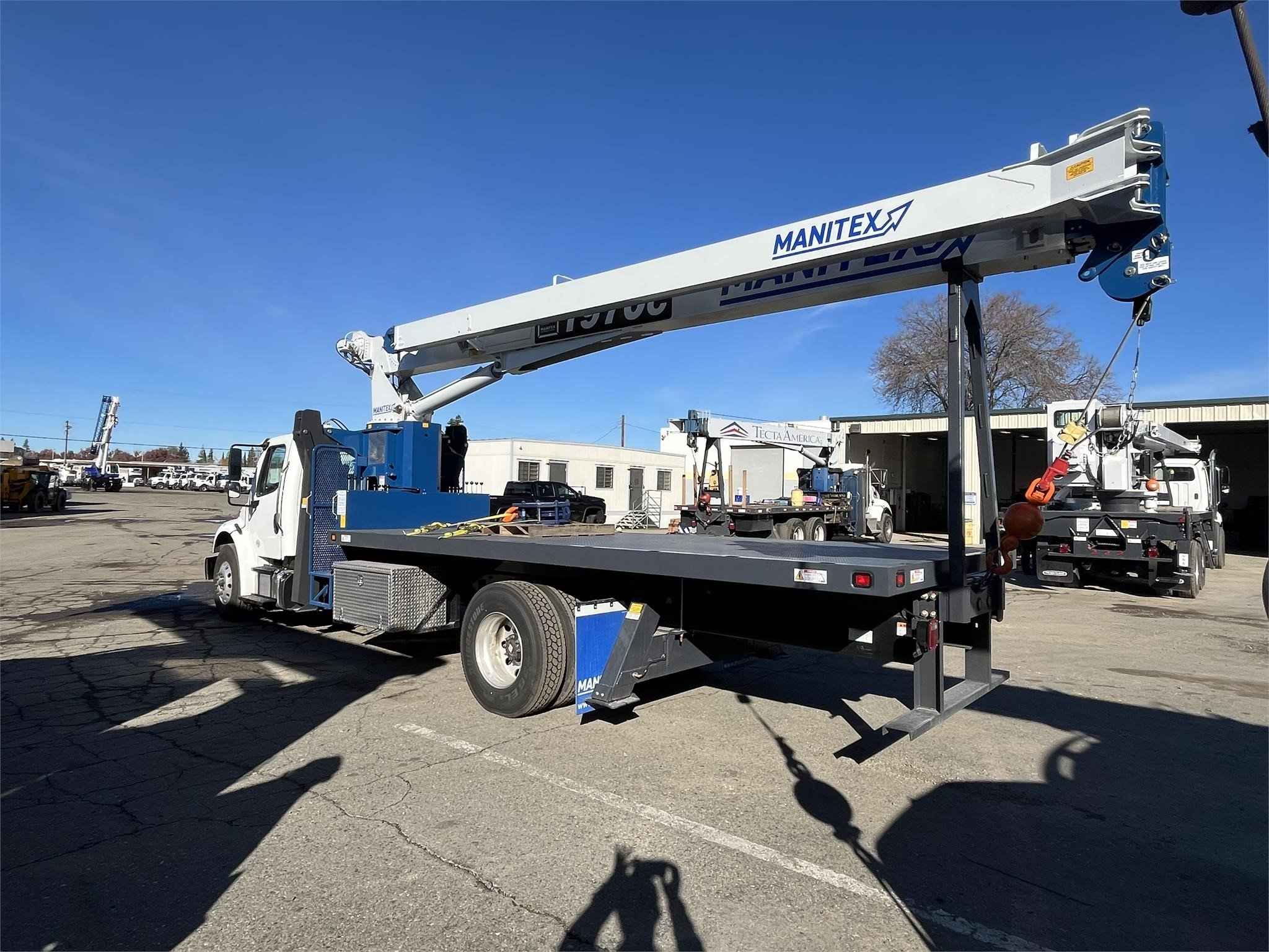 MANITEX 1970C 19 TON CRANE Standard features: 70’ Three-Section Telescopic Boom, 19 ton base rating at 5’ radius, 2-speed Hoist w/Grooved Drum, 7 Ton Hook and Ball, 3-Load Sheave Quick Reeve Boom Head, Externally wired Anti-Two Block w/lockout, Boom Hoist Cylinder, System Pressure Gauge, 372° Non continuous Rotation, Removable Boom Rest, Engine Start/Stop, Operator’s Service/Parts Manuals, Boom Length and Angle Indicators, Foot Throttle, Electronic Throttle, Bubble Level, 300’ of 9/16” EIPS IWRC Wire Rope, 70 Gallon HD Reservoir w/Suction Strainer & Ball Valve, Pedestal, Turret, Rotation Bearing & Swing System, Dual Operator Control Stations, Load Moment Indicator – Audio/Visual Alert w/Shutoff, Audible Outrigger /Stabilizer Motion Alarm, A-Frame Outriggers (21’6” spread width), A-frame rear stabilizers, 3-Section Hydraulic Pump – CCW Rotation is Standard, Subframe for 20’ bed, Outrigger Monitoring System verification only, Signal Horn. Additional Options Included: • 1 Piece 24’ Jib • Radio A2B • 3 Section Vane Pump-Clockwise Rotation • Standard Mount Installation • 20’ Steel bed with 1/8” thick Steel Thread Plate • Hotshift PTO • Rotation Resistant Rope in lieu of Standard • 15 Ton 1-Sheave Quick Reeve Block for 2-3 part line 9/16” rope • Chassis Mounted HD Hydraulic Reservoir in Lieu of Standard • Aluminum Toolbox (48” L x 24” W x 24” H) – Chassis Mounted MOUNTED ON 2024 FREIGHTLINER M2106 Mounted on a 2024 Freightliner M2106 with a Cummins B6.7, 280 HP diesel engine, Allison 2500 RDS Automatic Transmission, Detroit DA-F-14.7-3 14,000 lbs. drop single front axle, Detroit RS-21-160 21,000 lb. R- Series single rear axle, 50 gallon aluminum fuel tank, Heater and air conditioning with defrosters, full instrumentation, Full power windows, AM/FM/WB with Bluetooth, Single Air Horn Roof Mounted, Dual Mirrors, External Sunvisor, Halogen headlights and unit is painted White. Full set Alcoa wheels.