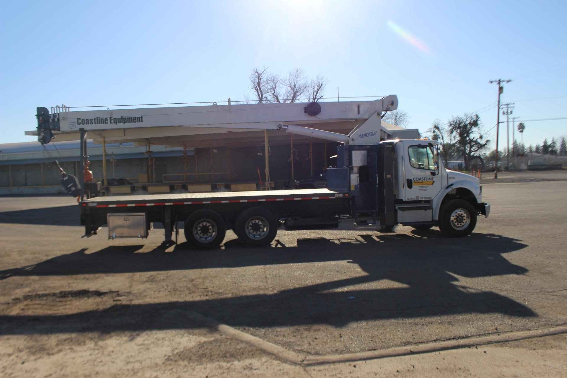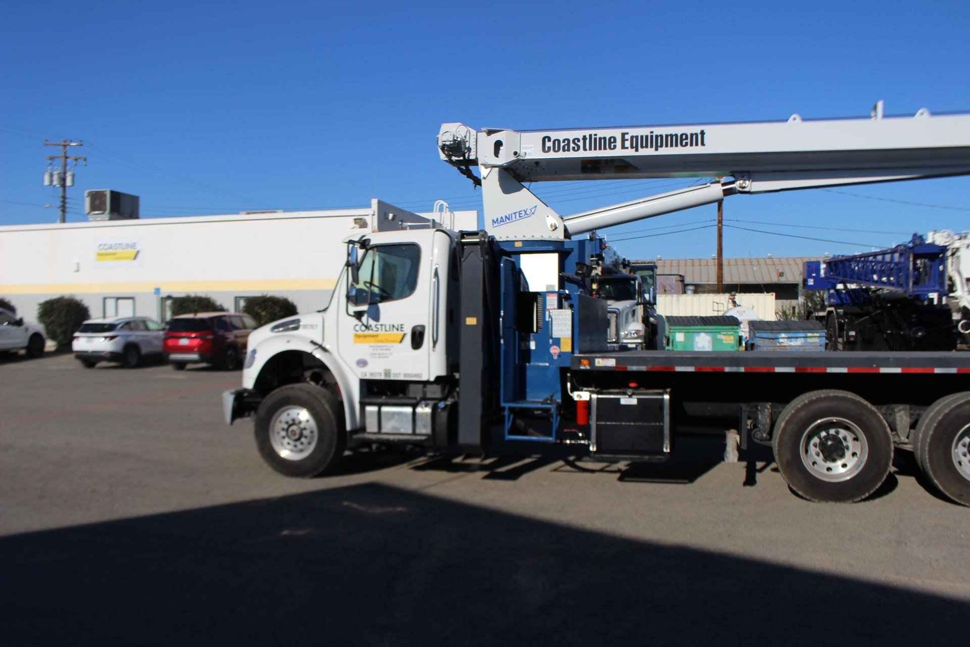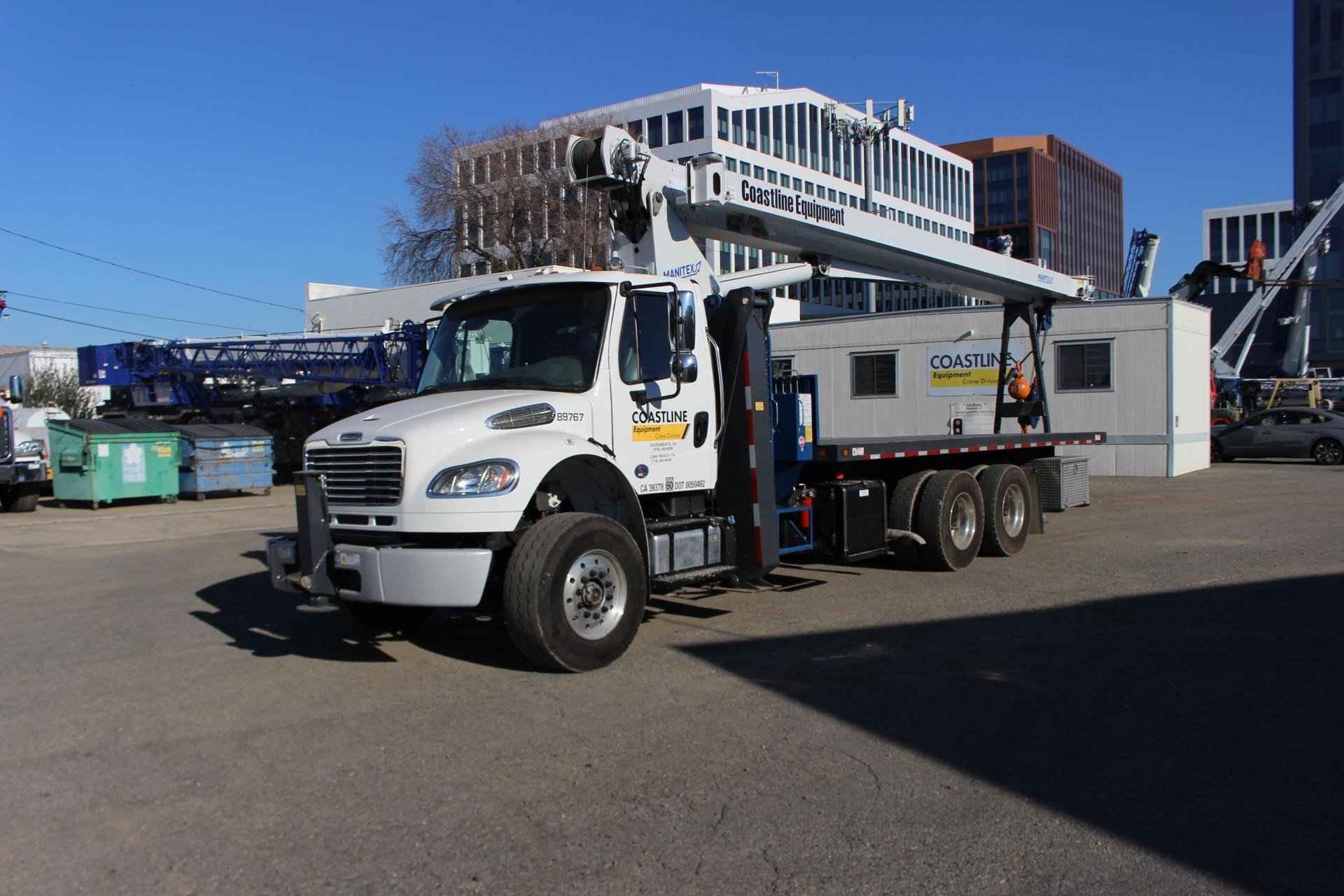 MANITEX 26101C 26 TON CRANE Standard features: 101’ Four-Section Telescopic Boom, 2-speed Hoist w/Grooved Drum, 7 Ton Hook and Ball, 3-Load Sheave Quick Reeve Boom Head, Externally Wired Anti-Two Block, Boom Hoist Cylinder, System Pressure Gauge, 372° Non Continuous Rotation, Removable Boom Rest, Engine Start/Stop, Operator’s Service/Parts Manuals, Boom Length and Angle Indicators, Function Overload Shutoff, Electronic Throttle, Bubble Level, 300’ of 9/16” Rotation Resistant Wire Rope, 70 Gallon Reservoir w/Suction Strainer & Ball Valve, Pedestal, Turret, Rotation Bearing & Swing System, Dual Operator Control Stations, Load Moment Indicator – Audio/Visual Capacity Alert w/Shutoff, Audible Outrigger /Stabilizer Motion Alarm, A-Frame Outriggers (21’6” spread width), A-frame Rear Stabilizers, Outrigger Monitoring System for verification only, Subframe for 22’ Bed, 3-Section Hydraulic Gear Pump – CCW Rotation is Standard, Signal Horn. Additional Options Included: • Radio Anti Two Block • 1 Piece 29’ Jib – Hard Wired • 22’ Steel Bed • Hotshift PTO • Rotation Resistant Rope • 15 Ton 1-Sheave Quick Reeve Block for 2-3 part line 9/16” rope • Chassis Mounted Heavy Duty Hydraulic Reservoir • Front Center Stabilizer • Mounting Front Center Stabilizer • 24” Steel Bulkhead • (2) Aluminum Toolboxes (36” L x 24” W x 24” H) chassis mounted • Cargo lights mounted on bulkhead facing rear • DOT Stripping evenly spaced on frame of flat bed • (5) Crib Plates 31x31 & Storage Bkts Chassis Mtg MOUNTED ON 2023 FREIGHTLINER M2 106 Mounted on a 2023 Freightliner M2 106 with a Cummins L9 360 HP diesel engine, Allison 3000 RDS automatic Transmission, MFS-18-133A at 18,000 lbs. front axle, MT-40-14X 40,000 lb. tandem rear axle, Airliner 40,000 lbs. extra duty rear suspension, Single 50 gallon aluminum fuel tank, Heater and air conditioning with defrosters, full instrumentation, Full power windows, interior color Opal Gray, AM/FM/WB/USB with Bluetooth world tuner radio, Single Air Horn mounted on roof, Dual Heated Mirrors, External Stainless Steel Sunvisor, Halogen headlights and unit is painted Elite White.