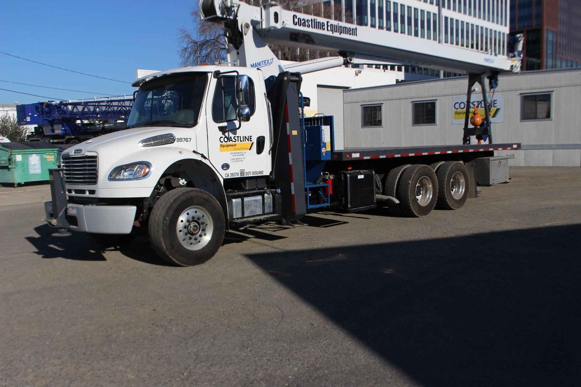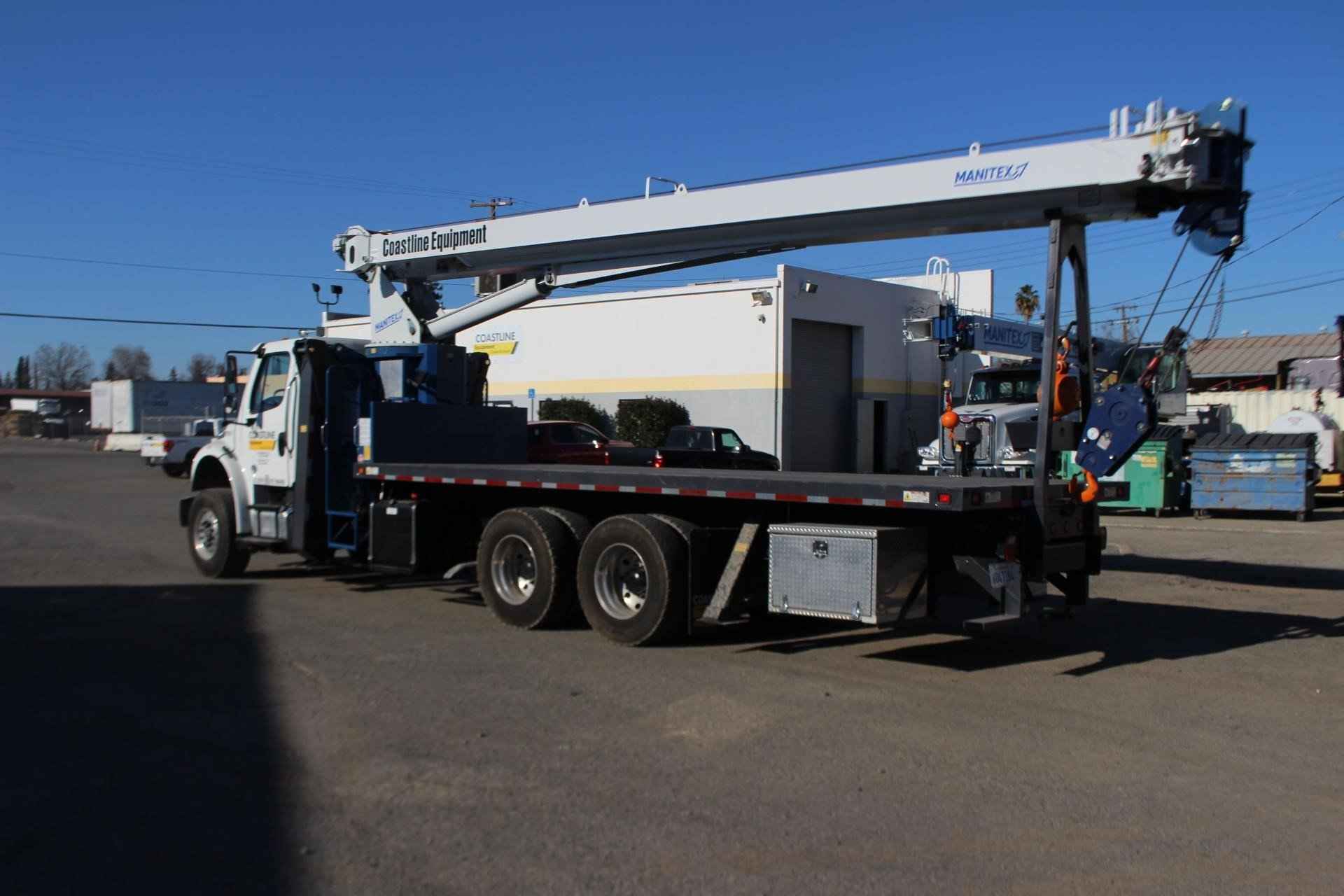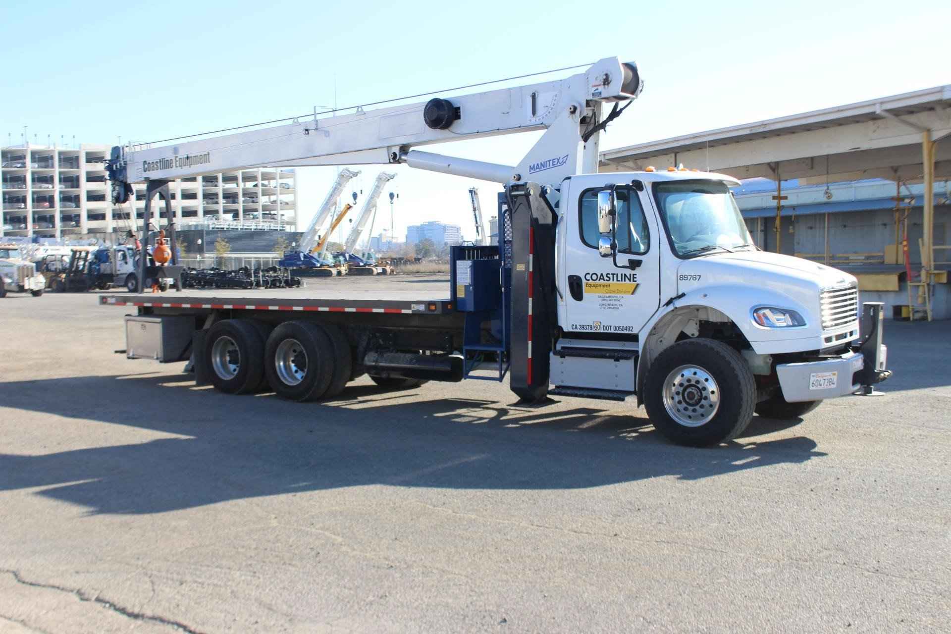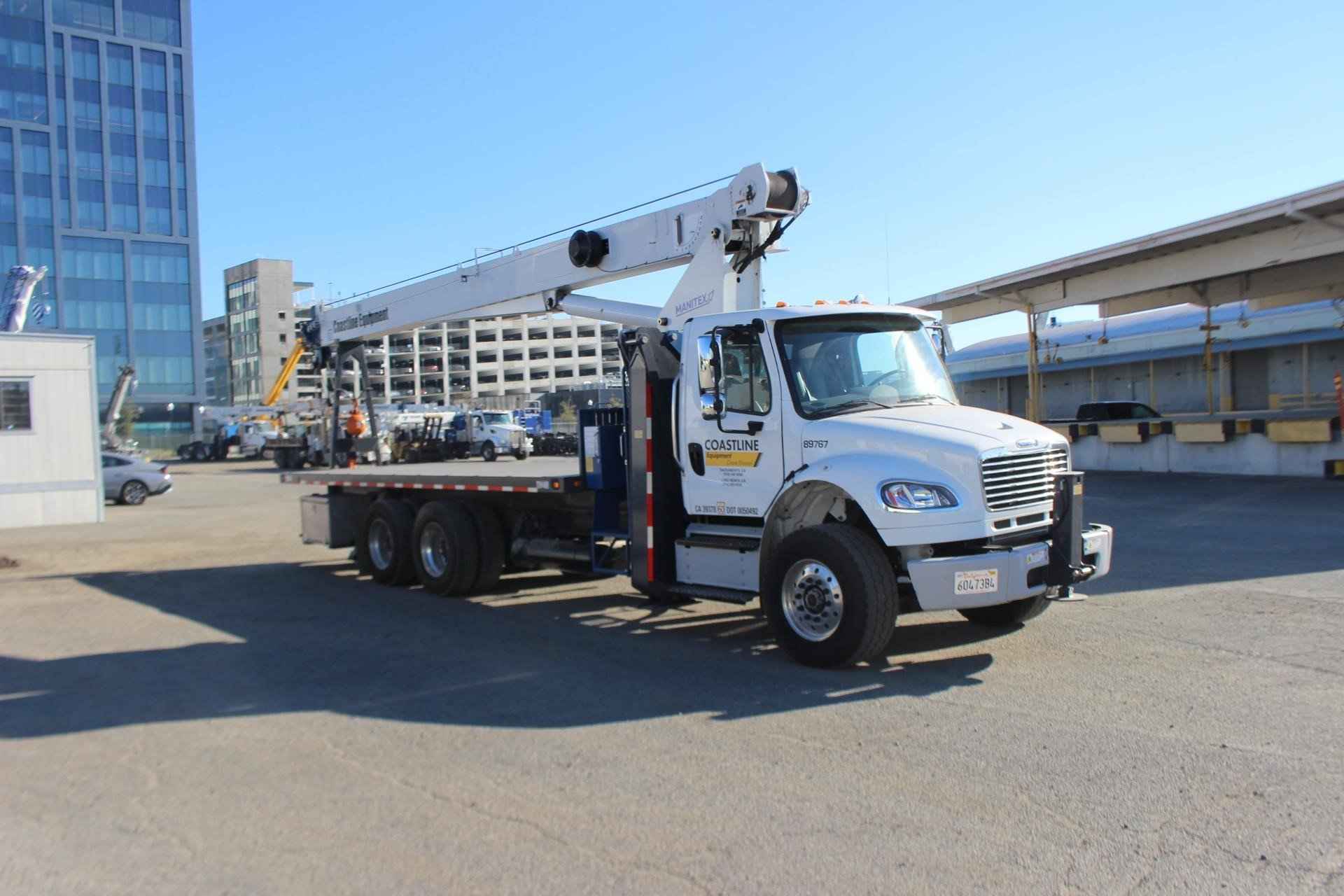 MANITEX 26101C 26 TON CRANE Standard features: 101’ Four-Section Telescopic Boom, 2-speed Hoist w/Grooved Drum, 7 Ton Hook and Ball, 3-Load Sheave Quick Reeve Boom Head, Externally Wired Anti-Two Block, Boom Hoist Cylinder, System Pressure Gauge, 372° Non Continuous Rotation, Removable Boom Rest, Engine Start/Stop, Operator’s Service/Parts Manuals, Boom Length and Angle Indicators, Function Overload Shutoff, Electronic Throttle, Bubble Level, 300’ of 9/16” Rotation Resistant Wire Rope, 70 Gallon Reservoir w/Suction Strainer & Ball Valve, Pedestal, Turret, Rotation Bearing & Swing System, Dual Operator Control Stations, Load Moment Indicator – Audio/Visual Capacity Alert w/Shutoff, Audible Outrigger /Stabilizer Motion Alarm, A-Frame Outriggers (21’6” spread width), A-frame Rear Stabilizers, Outrigger Monitoring System for verification only, Subframe for 22’ Bed, 3-Section Hydraulic Gear Pump – CCW Rotation is Standard, Signal Horn. Additional Options Included: • Radio Anti Two Block • 1 Piece 29’ Jib – Hard Wired • 22’ Steel Bed • Hotshift PTO • Rotation Resistant Rope • 15 Ton 1-Sheave Quick Reeve Block for 2-3 part line 9/16” rope • Chassis Mounted Heavy Duty Hydraulic Reservoir • Front Center Stabilizer • Mounting Front Center Stabilizer • 24” Steel Bulkhead • (2) Aluminum Toolboxes (36” L x 24” W x 24” H) chassis mounted • Cargo lights mounted on bulkhead facing rear • DOT Stripping evenly spaced on frame of flat bed • (5) Crib Plates 31x31 & Storage Bkts Chassis Mtg MOUNTED ON 2023 FREIGHTLINER M2 106 Mounted on a 2023 Freightliner M2 106 with a Cummins L9 360 HP diesel engine, Allison 3000 RDS automatic Transmission, MFS-18-133A at 18,000 lbs. front axle, MT-40-14X 40,000 lb. tandem rear axle, Airliner 40,000 lbs. extra duty rear suspension, Single 50 gallon aluminum fuel tank, Heater and air conditioning with defrosters, full instrumentation, Full power windows, interior color Opal Gray, AM/FM/WB/USB with Bluetooth world tuner radio, Single Air Horn mounted on roof, Dual Heated Mirrors, External Stainless Steel Sunvisor, Halogen headlights and unit is painted Elite White.