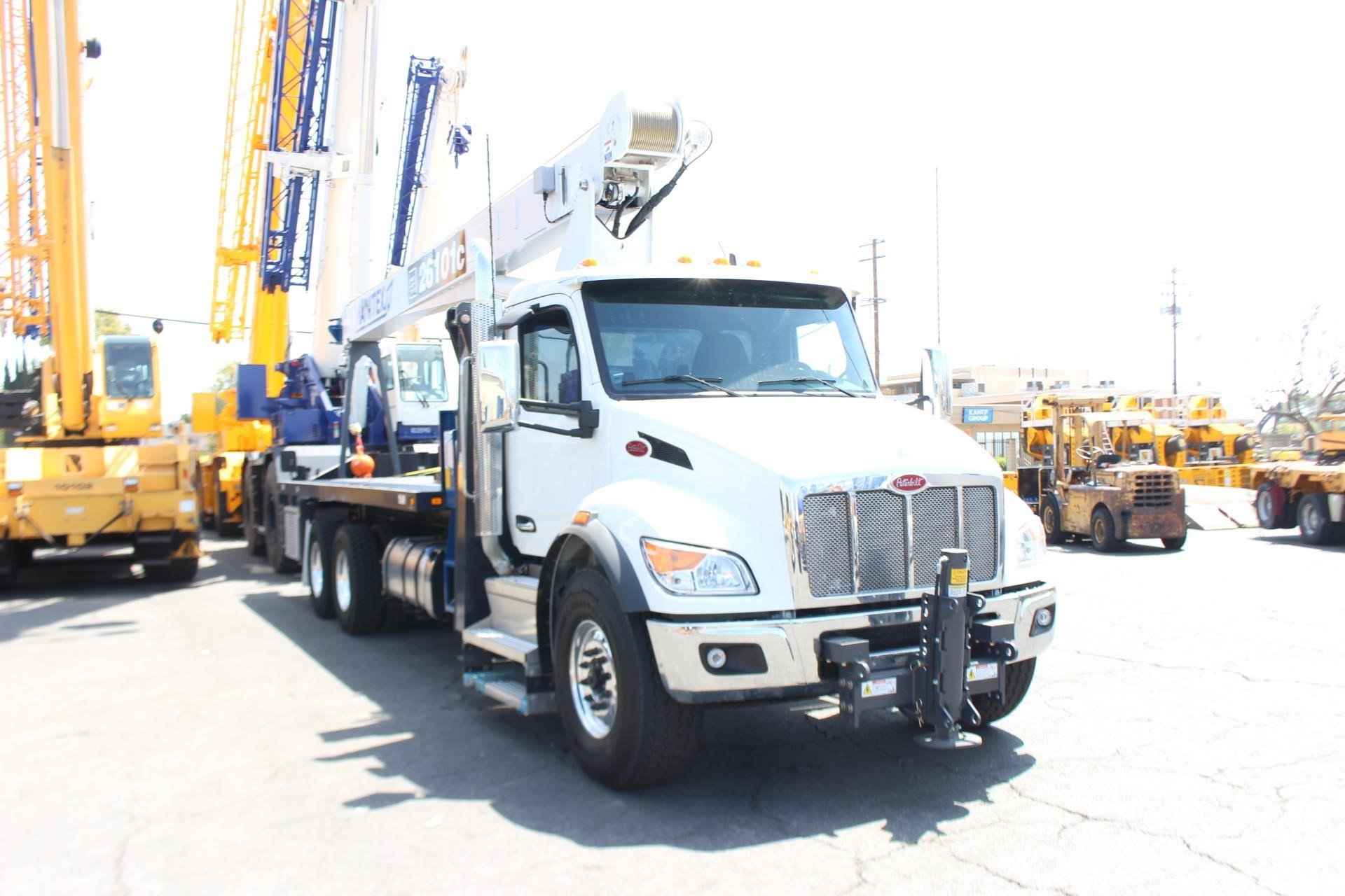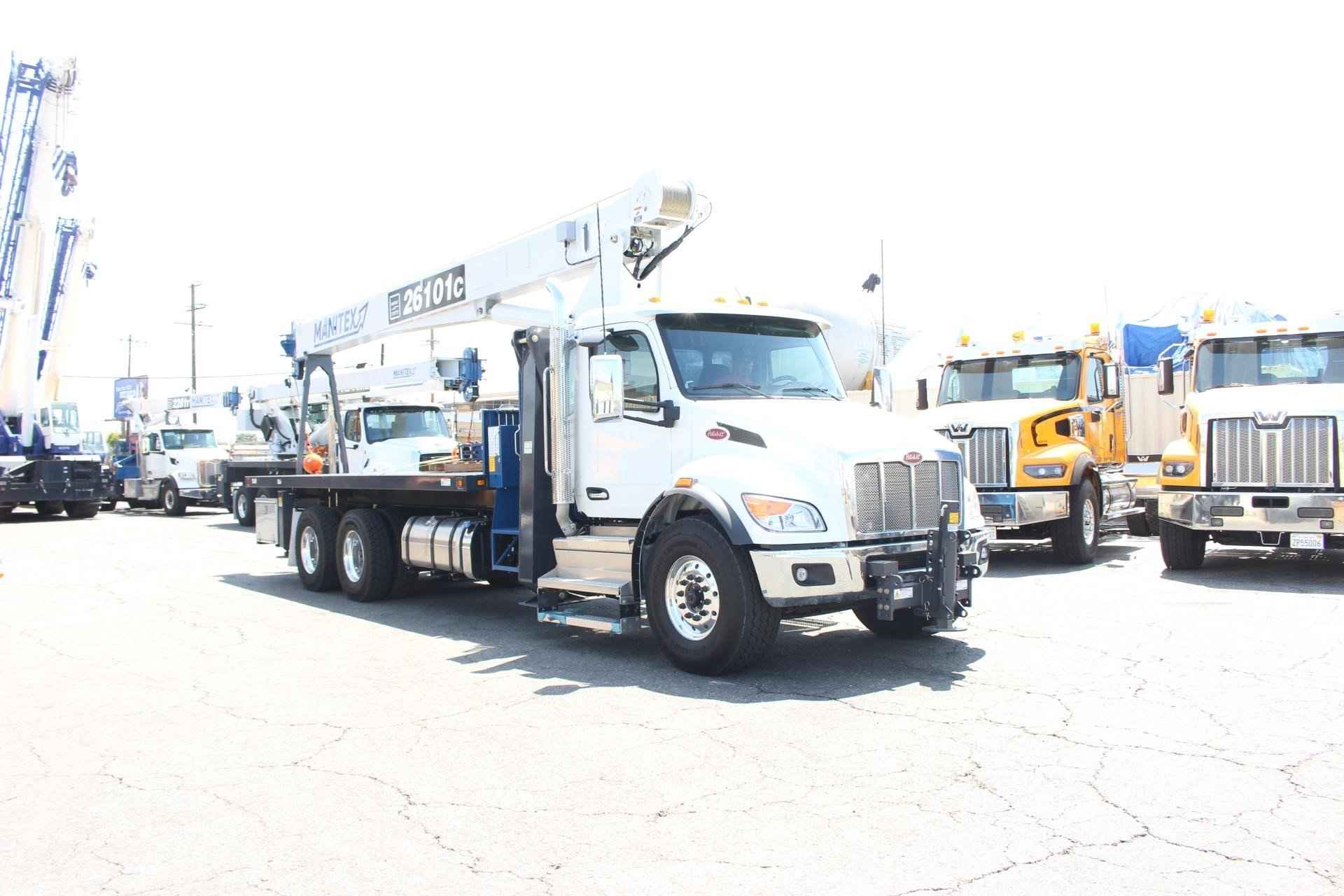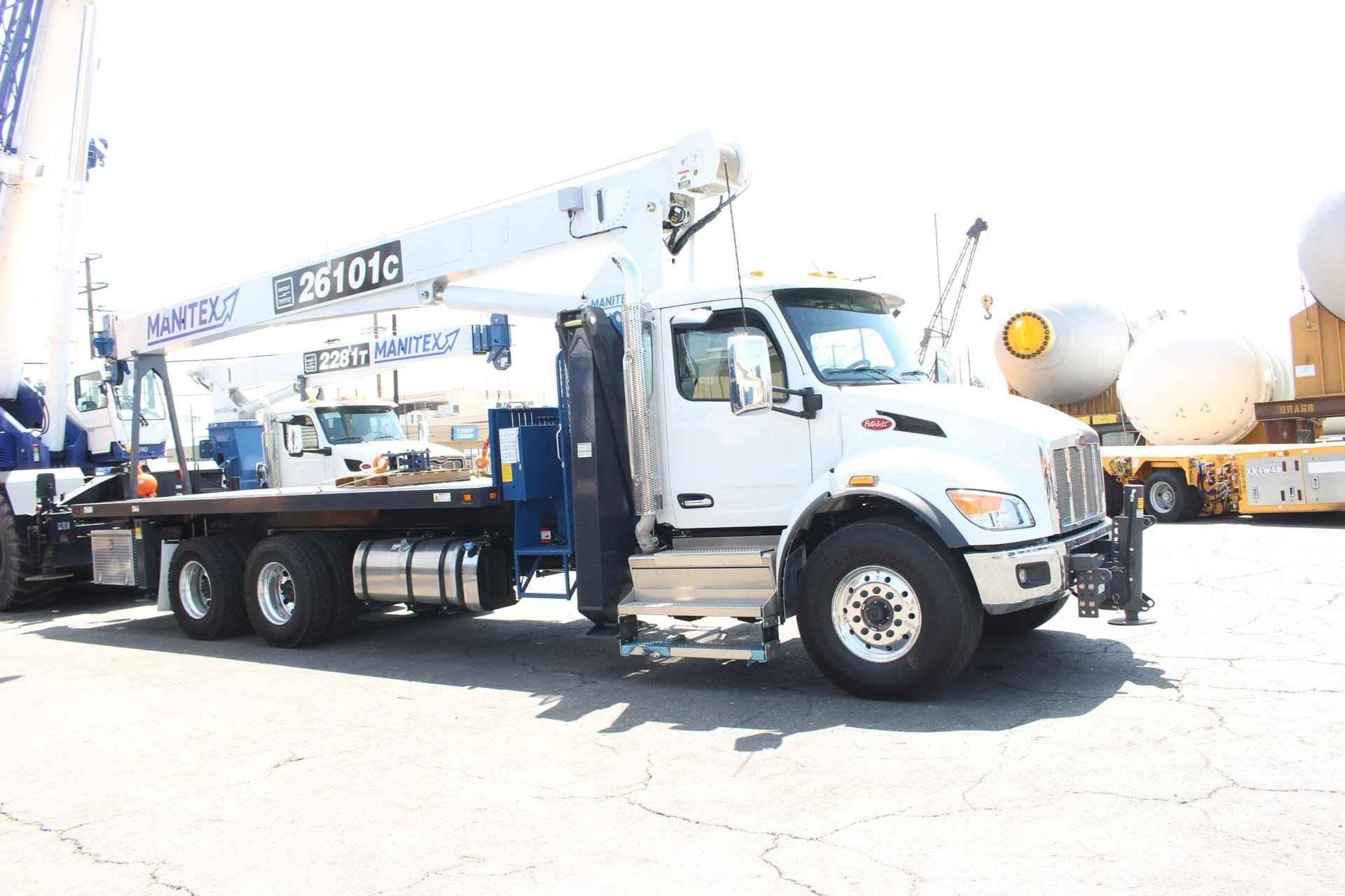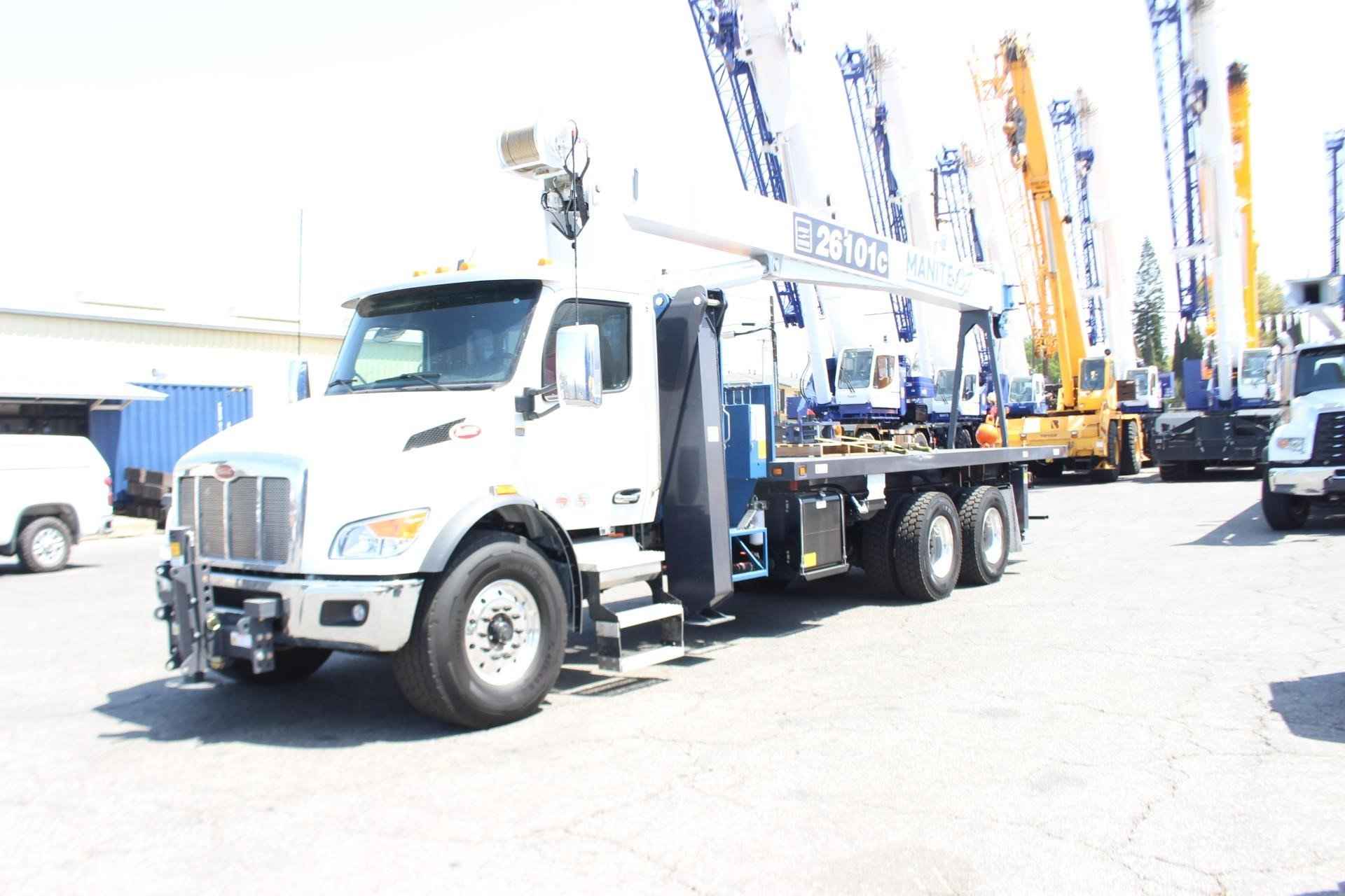 MANITEX 26101C 26 TON CRANE Standard features: 101’ Four-Section Telescopic Boom, 2-speed Hoist w/Grooved Drum, 7 Ton Hook and Ball, 3-Load Sheave Quick Reeve Boom Head, Externally Wired Anti-Two Block, Boom Hoist Cylinder, System Pressure Gauge, 372° Non Continuous Rotation, Removable Boom Rest, Engine Start/Stop, Operator’s Service/Parts Manuals, Boom Length and Angle Indicators, Function Overload Shutoff, Electronic Throttle, Bubble Level, 300’ of 9/16” Rotation Resistant Wire Rope, 70 Gallon Reservoir w/Suction Strainer & Ball Valve, Pedestal, Turret, Rotation Bearing & Swing System, Dual Operator Control Stations, Load Moment Indicator – Audio/Visual Capacity Alert w/Shutoff, Audible Outrigger /Stabilizer Motion Alarm, A-Frame Outriggers (21’6” spread width), Outrigger Monitoring System for verification only, Subframe for 22’ Bed, 3-Section Hydraulic Gear Pump – CCW Rotation is Standard, Signal Horn. Additional Options Included: • Radio Anti Two Block • 1 Piece 29’ Jib • 22’ Steel Bed • Out and Down Rear Stabilizers • Hotshift PTO • Rotation Resistant Rope • 15 Ton 1-Sheave Quick Reeve Block for 2-3 part line 9/16” rope • Chassis Mounted Heavy Duty Hydraulic Reservoir • Front Center Stabilizer • Hydraulic Oil Cooler • 24” Steel Bulkhead • Aluminum Toolbox (48” L x 24” W x 24” H) MOUNTED ON PETERBILT 548 Mounted on a 2026 Peterbilt 548 tractor chassis with a Paccar PX-9 370 HP diesel engine, Allison 3000 RDS-P Gen 5 Transmission, Dana Spicer D2000F 20,000 lb. front axle, Dana Spicer DSH40 40,000 lb. rear axle, Full set of Alcoa polished wheels, D-Shape Aluminum 60 gallon fuel tank, Heater and air conditioner with defrosters, full instrumentation, full power windows, interior color Gray/Black, AM/FM/WB Bluetooth Phone and audio radio, Air Horn mounted under cab, Dual heated mirrors, Stainless steel sunvisor, Halogen headlights and unit is painted Axalta Two Stage White.