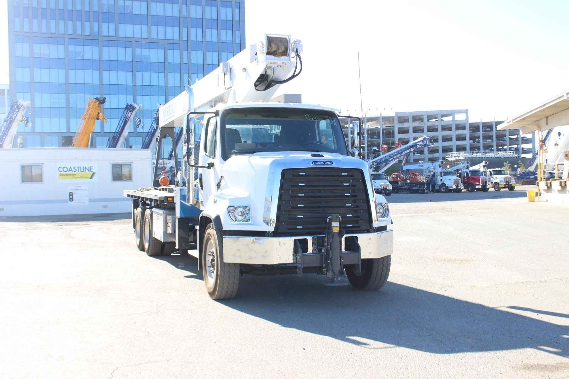 MANITEX 30100C Standard features: 100’ Four-Section Telescopic Boom A-Frame, 7-ton hook and ball, 3- load sheave quick reeve boom head, Externally Wired anti-two block w/lockout, Boom hoist cylinder, System pressure gauge, 372° Non Continuous rotation, Removable boom rest, Engine start/stop, Operators service/parts manuals, Boom length and angle indicators, Electronic Foot throttle, Signal Horn, Bubble Level, Beverage cup holders, Braden Winch, 2-speed Hoist w/grooved drum, 335’of 9/16” Rotation Resistant Wire Rope, Subframe for 21’ Bed, 70 gallon reservoir w/suction strainer and ball valve, Pedestal, Swept Back Turret, Rotation bearing and Swing system, Dual Operator Control Stations, Can Bus Load moment indicator w/Internal length Cable-audio/visual capacity alert w/shutoff, Hermetically sealed Printed Circuit board electrical system w/LED Circuit Status Indicators, Audible Outrigger/Stabilizer Motion Alarm, A-frame Link Type Front Outriggers (22’4” Spread Width), Out and Down Rear Stabilizers (13’7” Spread), 3-Section Hydraulic Pump-Counterclockwise Rotation is standard, Outrigger Monitoring System. Additional Options Included: • Out/Down Outrigger • 1 piece 26’ Jib • 21’ HH Steel Bed x 102” • Standard Mount Installation • Hot Shift PTO • Heavy Duty Hydraulic Reservoir Mounting • 15 Ton 1-Sheave Quick Reeve Block • Front Center Stabilizer • Aluminum Tool Box (48” x 24” x 24”) Chassis Mount MOUNTED ON 2024 FREIGHTLINER 108SD Mounted on a 2024 Freightliner 108SD with a Cummins L9 370 HP diesel engine, Allison 3000 RDS Automatic Transmission, Detroit DA-F-20.0.5 20,000 lbs. front axle, MT-40-14X 40,000 lb. R-series tandem rear axle, Full set Alcoa polished aluminum wheels, Single 60 gallon fuel tank, Heater and air conditioning with defrosters, full instrumentation, Full power windows, interior color Opal Gray, AM/FM/WB world tuner radio with USB, auxiliary inputs and Bluetooth, Single Electric Horn, Dual Heated Mirrors, External Composite Sunvisor, Halogen headlamps and unit is painted Elite White.