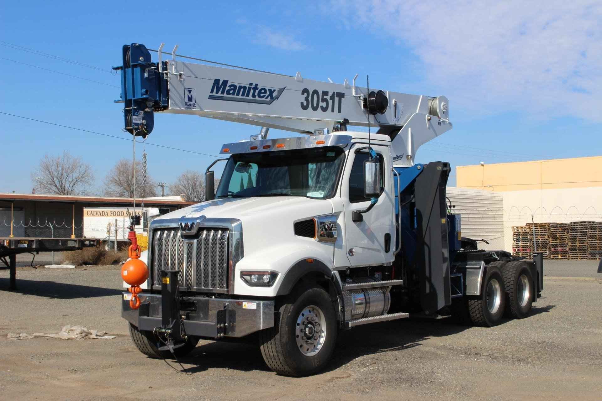 NEW MANITEX 3051T 30 TON Standard features: 51’ Three-Section Telescopic Boom, 7 Ton Hook and Ball, 3-Load Sheave Quick Reeve Boom Head, Hard-Wired Anti-Two Block w/lockout, Boom Hoist Cylinder, System Pressure Gauge, 372° Non continuous Rotation, Boom Rest- Tractor Mount with Load Block Bracket, Engine Start/Stop, Operator’s Service/Parts Manuals, Boom Length and Angle Indicators, Electronic Foot Throttle, Signal Horn, Bubble Level, Beverage Cup Holders, 2-speed Hoist w/Grooved Drum, 335’ of 9/16” Rotation Resistant Wire Rope, 70 Gallon Reservoir Mount for Tractor Mount w/Suction Strainer & Ball Valve, Pedestal, Turret, Rotation Bearing & Swing System, Dual Operator Control Stations, Can Bus Load Moment Indicator w/Internal length Cable – Audio/Visual Capacity Alert w/Shutoff, Hermetically sealed Printed, Subframe Tractor Mount, Circuit Board Electrical System w/LED Circuit Status Indicators, Audible Outrigger /Stabilizer Motion Alarm, Out and Down Rear Stabilizers, A-Frame Outriggers, 3-Section Gear Hydraulic Pump – CCW Rotation is Standard, Outrigger Monitoring System. Additional Options Included: • Tractor Mount for 3051TM • 3 Section Vane Pump-Clockwise rotation • Hot Shift PTO • Drive shaft for Pump Installation • Removable Behind Cab Boom Rest with Load Block Storage Option • Front Center Stabilizer • Mounting Front Center Stabilizer • Control valve for operation of single stabilizer, Required w/FBS • Aluminum Toolbox (36” x 24” x 24”) Chassis Mount MOUNTED ON WESTERN STAR 49X Mounted on a Western Star 49X tractor chassis with a Cummins X12 500 HP diesel engine with a Allison 4500 RDS automatic Transmission, Meritor MFS-20 22,000 lb. drop front axle, Meritor RT-26-46000# R-Series tandem rear axle with pump, Airliner 46,000# rear suspension, Full set of Alcoa Aluminum Polished wheels, Single polished Aluminum 50 gallon fuel tank, Heater and air conditioner with defrosters, full instrumentation, dual heated mirrors, interior color Charcoal Black, AM/FM/WB World tuner radio with Bluetooth, USB and auxiliary inputs, dual air horns, exterior stainless steel sunvisor, Halogen headlights, and unit is painted White Elite.