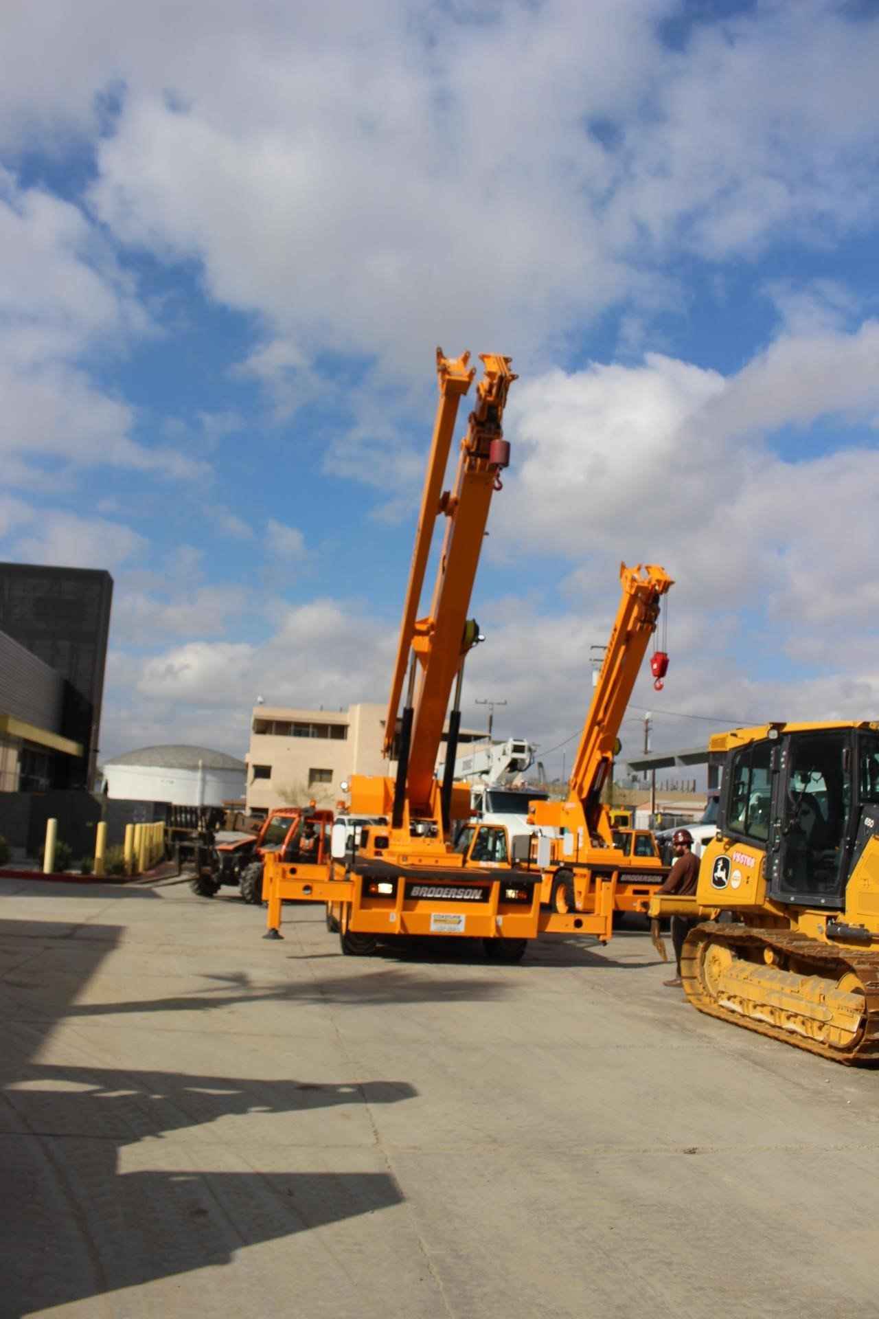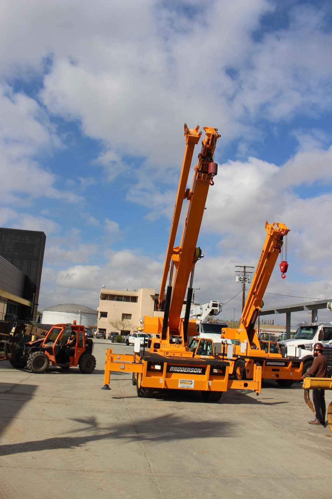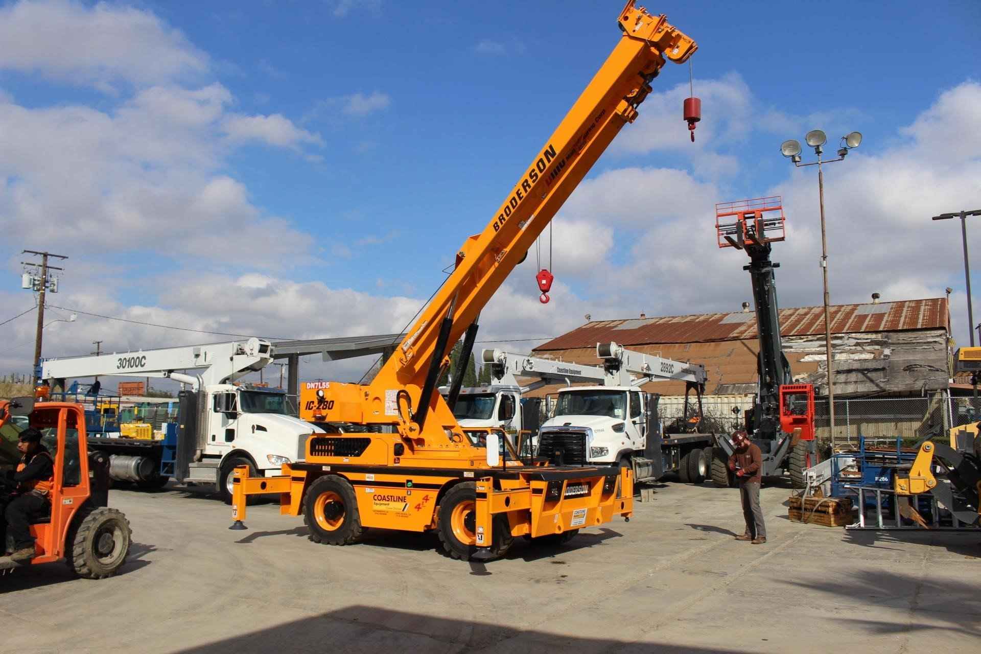 BRODERSON IC-280-A 20 TON CRANE Standard Features: The 20 ton capacity IC-280-A Industrial crane features: 4-Section, 63′ 10″ (19.5m) Long, Full-Power, Proportional Extending Telescopic Boom with continuous 360 degree swing rotation turret. Rotation is powered by hydraulic motor and worm gear drive. Four Hydraulic, 3-Position Independently Controlled Outriggers can be set in-and-down, mid-and-down, and out-and-down. Outrigger pad dimension: 11” (30 cm) diameter. Two-Speed Hoist with maximum line speed of 186 fpm (57m/min) and maximum bare drum line pull of 12,500 lbs (5,670 kg). Telematics Hardware provides cellular data transmission with 15-minute data update interval. GPS, engine data & faults, & run time. Email alerts, web and mobile access. Hydraulic Power is provided by a direct driven tandem pump delivering 61 gpm (231L/min) at rated RPM. Rated Capacity Limiter warns the operator of impending overload with audible and visual signals, and stops boom functions in the event of overloads. Multiple Steering Configurations including 4-Wheel Steer, where the front and rear wheels steer in opposite directions, permits a very tight turning radius for quick positioning in constrained spaces. Operator can quickly switch between rear-wheel steering, 4-wheel, or crab steering, aided by electronic sensors and a control box that automatically aligns the steering after a new mode is selected. Rear wheels steer in two-wheel drive mode. EPA Tier 4 Final Diesel Engine Cummins QSF3.8L Diesel Powershift Transmission with 4 speeds forward and reverse, minimizes bumps and jolts during shifting that is possible at any engine speed in any gear. Heavy Duty Chassis Frame provides a front deck carrying capacity of 14,800 lbs (6,713 kg). Easy Access to engine compartment and hydraulic equipment components simplifies maintenance and repair. Low Profile Design ideal for tight work spaces and simplifies transportation by flatbed truck. Available Features Included: • Four-Wheel Steer & Four-Wheel Drive • High traction tread, 445/65D22.5, 18 Ply • Pintle Hook, Rear • Rearview Mirrors • All Weather Cab, w/heater, defroster, & wiper • Strobe Lights • Boom Work Lights • Work lights rear • Rated Capacity Limiter • Hoist Drum Rotation Indicator • Telematics with 24 month data subscription • Boom Extension, 20 Ft. Offset
