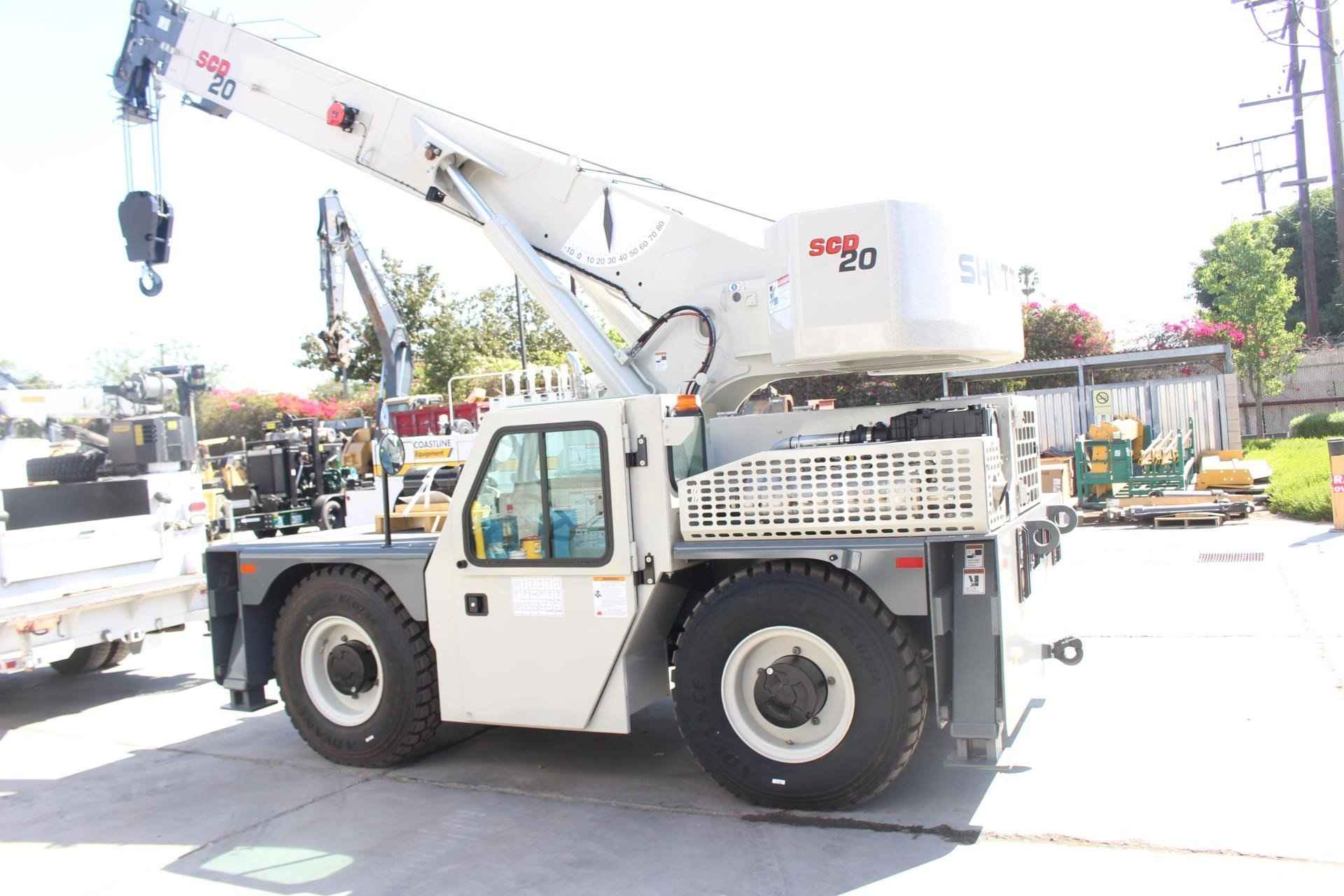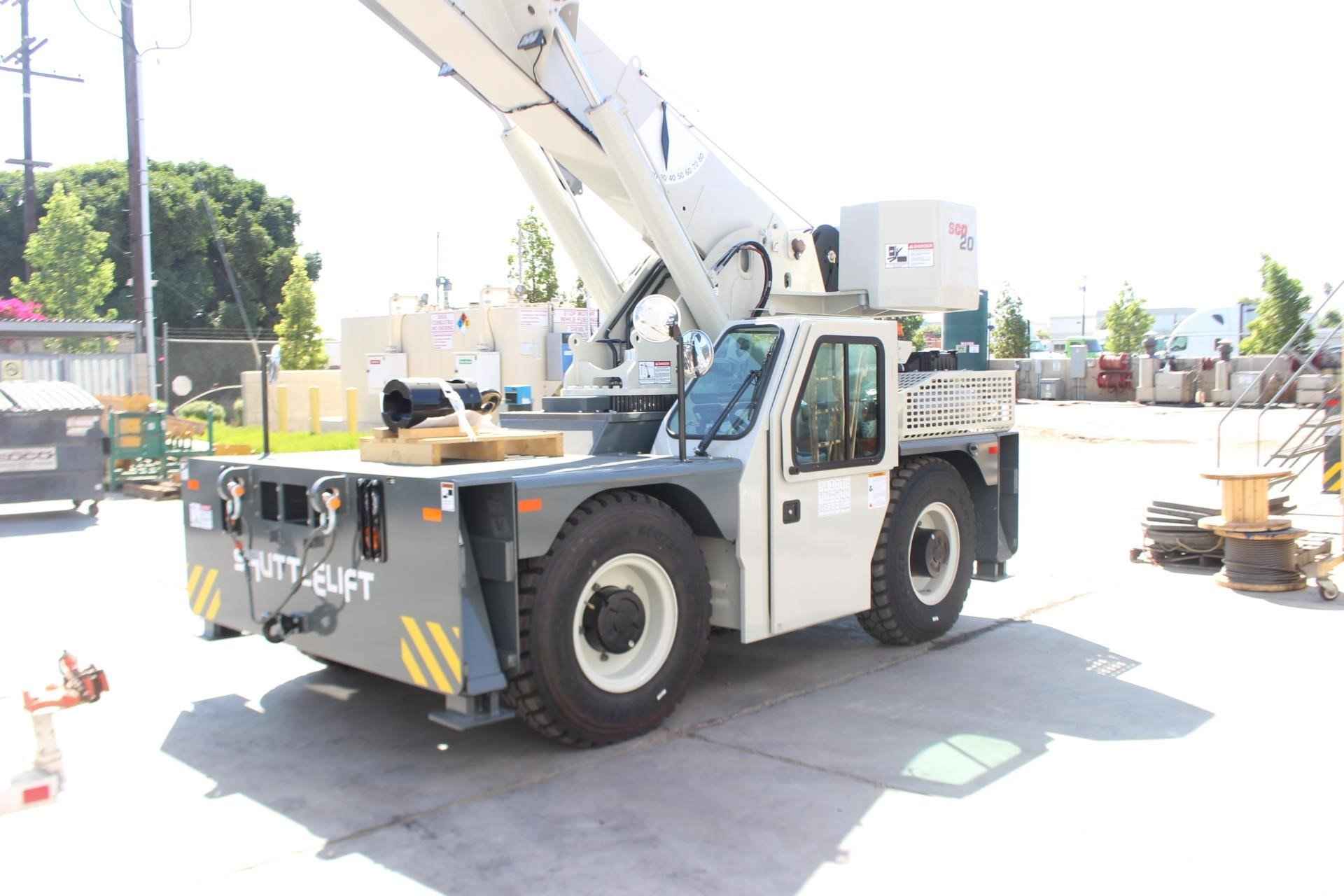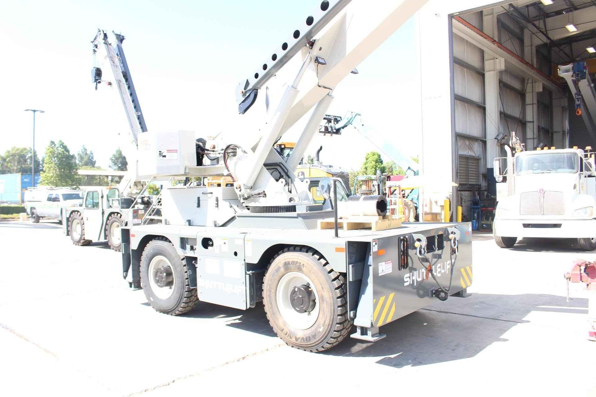 2025 SHUTTLELIFT - MANITOWOC SCD20 20 TON Standard features: BOOM: 54.5 ft. four section Full power boom with integral holding valve on telescope cylinder. Three position, pivoting boom nose. BOOM ELEVATION: Twin double acting hydraulic cylinders, 0° to 80° with integral holding valves & mechanical angle indicator RATED CAPACITY LIMITER AND ANTI-TWO BLOCK SYSTEM: Hardwired Wylie i4300 rated capacity limiting system with audio-visual (buzzer/light) warning and function cut-out. Color graphical display of boom length, load radius, boom angle, rated load, and calculated load. Hardwired A2B system is a low-profile style w/audio warning and auto control lock-out. OPERATOR’S STATION: Chassis mounted cab shell with roof safety glass, suspension seat, and dash mounted pilot operated control levers, gauges for engine functions, tilt steering wheel, electric horn, fire extinguisher, sight level bubble, seat belt, and DC electronics charging port. SWING: 360° continuous rotation, worm & gear drive on ball bearing swing circle. COUNTERWEIGHT: One piece cast type bolted to the turntable. HYDRAULIC SYSTEM: Load sensing variable displacement axial piston pump, 34.5 gallon steel reservoir with external sight level indicator. HOIST: Two speed planetary drive main hoist with automatic multi-disc brake. Includes 3rd wrap indication wight function cut out, a drum rotation indicator in the hoist joystick control, and hoist direction indicator light on dash. WIRE ROPE: 320’ of 9/16 “diameter 6 x 19 class EEIPS IWRC. HOOK BLOCK: Two sheave, “Quick Reeve” style hook block, 20 US ton capacity. OUTRIGGERS: Hydraulic box/beam style at all four corners with integral check valves and integral steel outrigger pads. Independent control of outriggers and outrigger motion alarm. ENGINE: Cummins QSF 3.8L (Tier IV Final) 4-cylinder turbo charged water cooled diesel, 130 HP @ 2500 RPM, includes Cummins catalyst and SCR device to meet EPA emissions. (Required for sale in areas with maxim 15ppm sulfur content diesel fuel or country requirement.) AXLES: Front: Drive/steer type with limited slip differential. Rear: Steer/non-drive (4x2 drive); rear axle oscillates 1.5°. Standard 2 wheel and 4 wheel coordinated and crab steering with electronic self-alignment. TRANSMISSION: Powershift, four speeds forward and four speeds reverse. BRAKES: Four wheel full hydraulic, internal multi-wet disc brake system with mechanically applied disc type parking brake on front axle input shaft. TIRES: 12.00 R20 tires. LIGHTS: Full lighting package includes front & rear chassis mounted work lights, rear taillights, turn indicators, brake and hazard. MISCELLANEOUS STANDARD EQUIPMENT: Non-skid deck surface, backup alarm, front & rear tie down lugs, dual side rear view mirrors, hook block tie down, owners USB flashdrive (includes operator’s, service/maintenance, and parts manuals, troubleshooting schematics, load charts, and safety book). Additional Options Included: • Front and Rear 15 Ton Pintle hitch, headlight, and taillight grilles. • Includes amber strobe light and boom mounted work lights. • Enclosed Compartment with front, side and rear window glass, windshield wiper and washer, two piece door with sliding and swing out window, heater, and defroster and cab dome light. • 4-Wheel drive with 1.5° rear axle oscillation • Outrigger position monitoring system • Air conditioning