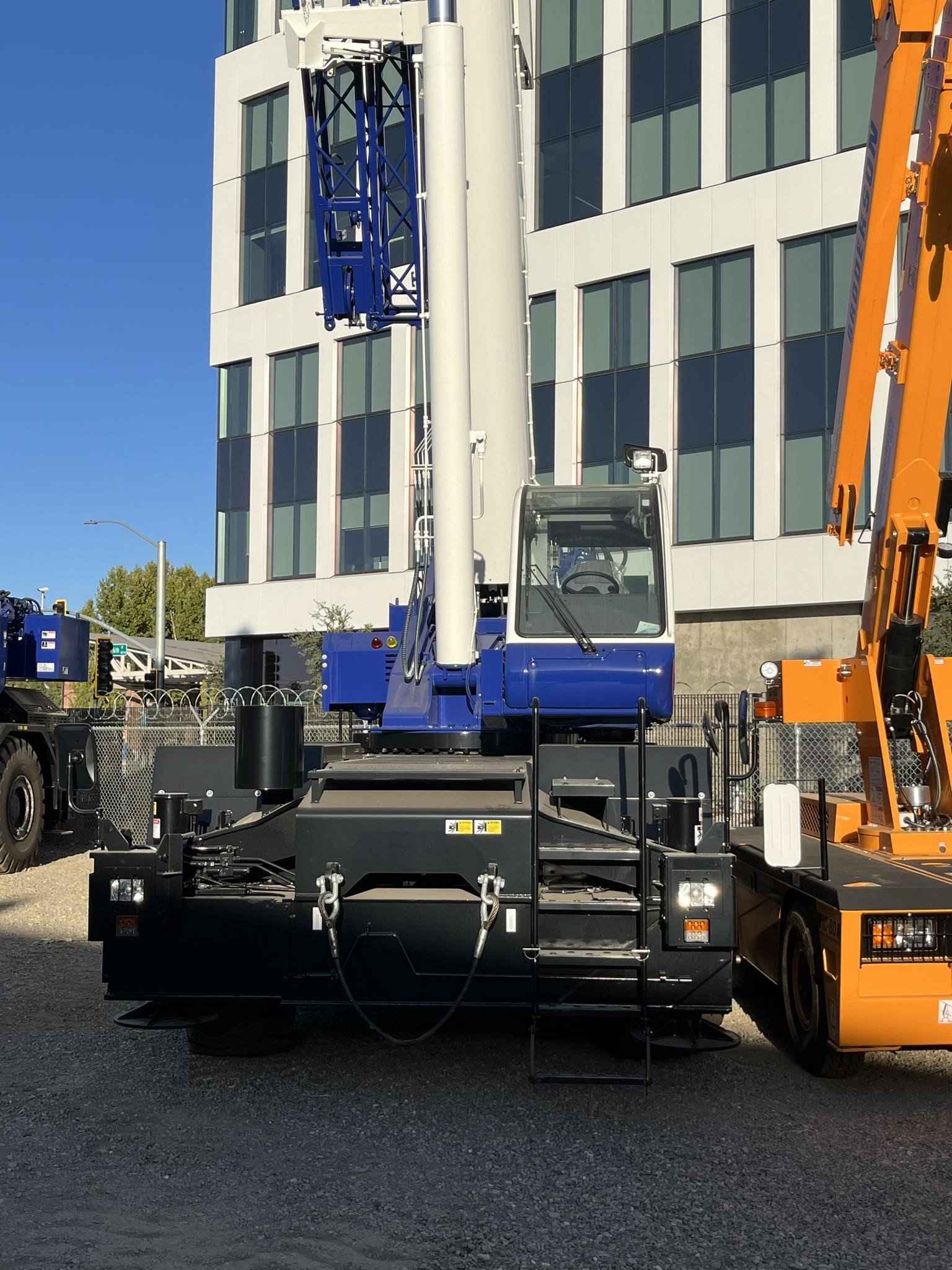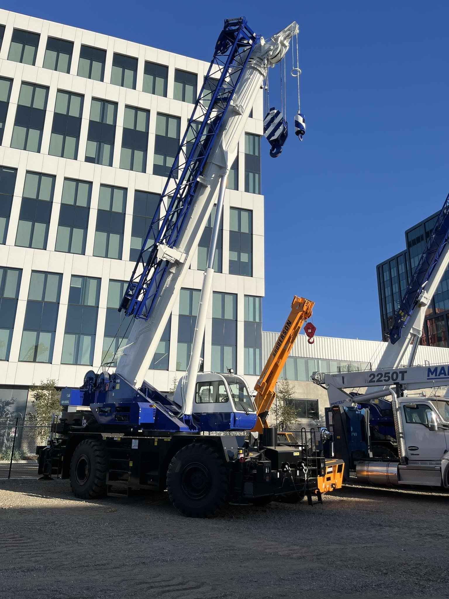 TADANO GR550XL 55 TON CRANE Standard Features: • Four section full power synchronized boom 35.1’- 113.9’ • 28.9’ or 50’ bi fold lattice jib (tilt type) with 5°, 25°, or 45° pinned offsets and self-storing pins. • Auxiliary lifting sheave (single top) storable • Variable speed main hoist with grooved drum, cable follower and 633’ of ¾” cable. • Variable speed auxiliary hoist with grooved drum, cable follower and 361’ of 3/4 “cable. • Drum rotation indicator (audible, visible and thumper type) main and auxiliary hoist • Anti-two block device (overwind cutout) • Boom angle indicator • Tadano electronic load moment indicator system (AML-C) • Outrigger extension length detector • Electronic crane monitoring system • Tadano twin slewing system and 360° positive slewing lock • Self-centering finger control levers with pilot control • Control pedals for boom elevating and boom telescoping • 3-way adjustable cloth seat with armrests, high back and seat belt • Tilt telescoping steering wheel • Tinted safety glass and sun visor • Front windshield wiper and washer • Roof window wiper and washer • Power window (cab door) • Rear view mirrors (right and left side) • Mirror for main and auxiliary hoists • Cigarette lighter and ashtray • Cab floor mat • Pump disconnect in operator’s cab • Hydraulic oil cooler • Hot water cab heater and air conditioner • Positive control • Quick reeving type bi-fold jib • Work lights • Independent controlled outriggers • Four outrigger extension positions • Self-storing outrigger pads • Cummins QSB6.7 turbo charged after cooled engine 270HP with exhaust brake • Electronic controlled automatic transmission driven by torque converter • 4 X 4 X 4 drive/steer • Non-spin rear differential • Semi-elliptic leaf springs suspension with hydraulic lockout device (front and rear) • 23.5-25(OR) tires • Disc brakes • Fenders • Air dryer • Water separator with filter (high filtration) • Engine over run alarm • Back up alarm • Low oil pressure/high water temp warning device (visual) • Rear steer centering light • Air cleaner dust indicator • Full instrumentation package • Complete highway light package • Tool storage compartment • Tire inflation kit • 24 volt electric system • 6.2 ton hook ball with swivel • 55 ton - 5 sheave with swivel hook block and safety latch for ¾” wire rope • Towing hooks front and rear • Lifting eyes • Hook block tie down (front bumper) • Weighted hook storage compartment • Halogen head lamp • Telematics (machine data logging and monitoring system) with HELLO-NET via Internet • Fuel consumption monitor • Eco mode system
