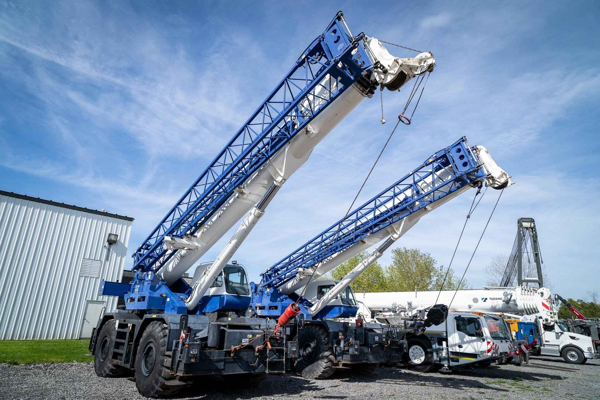 The Tadano GR-750XL is a rough terrain crane with a maximum lifting capacity of 75 tons. There is a maximum boom length of 141.1 feet and a maximum jib length of 58.1 feet. The boom of the GR-750XL is a fully synchronized five section telescoping boom. Two telescoping cylinders, a retraction cable, and an extension cable make up the synchronization system. The boom head has six sheaves to increase the power and stability of the boom. The two-stage jib is a lattice type jib with cylinders that allow for easy storage on the base boom section. The jib head also has a single sheave to increase the power and stability of the jib. The outrigger system is made up of four hydraulic beam and jack outriggers. The beams are controlled independently from the cab.