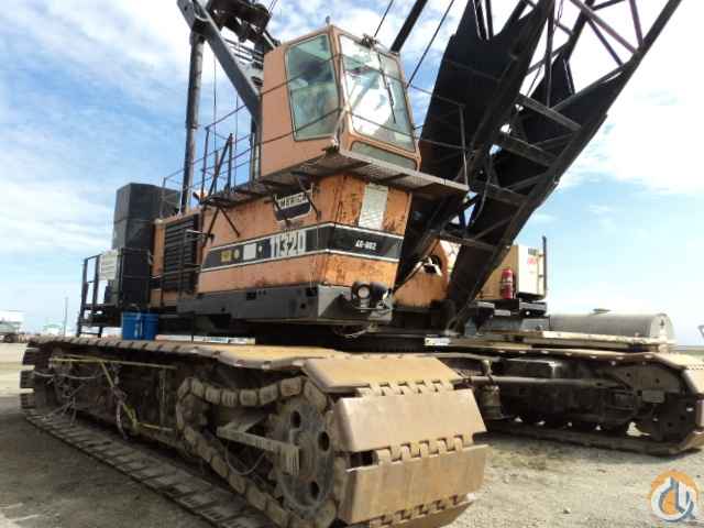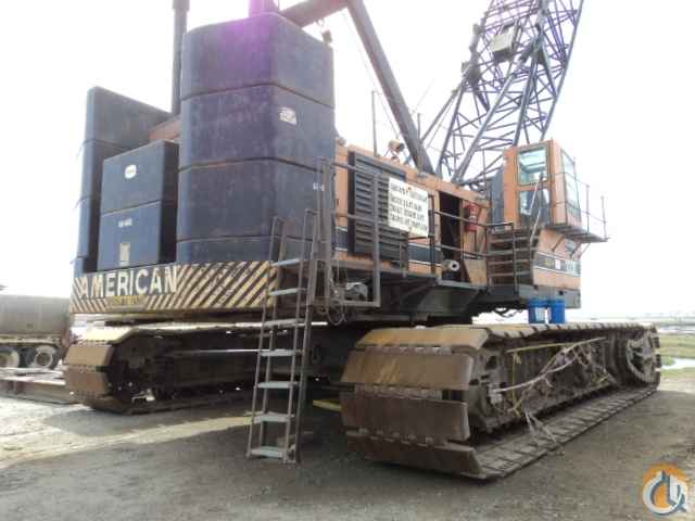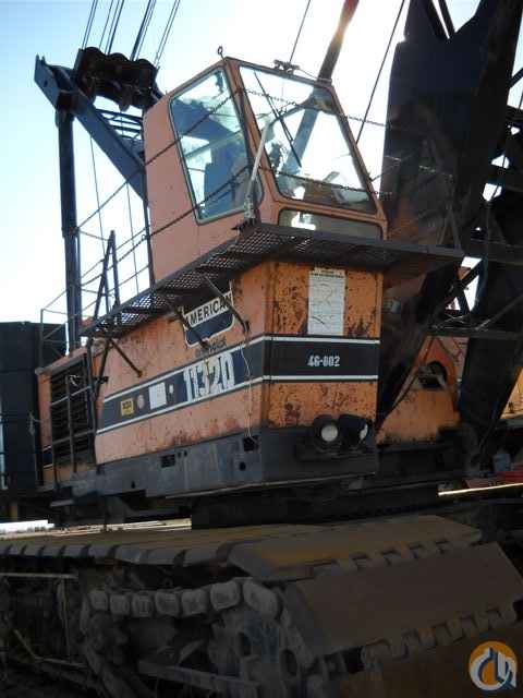 1982 American Lattice Boom Crawler Crane. Model 11320. Serial number 8205A03010. Hours: 20,477. This crane has a 900,000 lbs capacity, with 230,000 lbs of counterweight. It has 160 feet of 94H tubular chord boom. The main load line is reeved to an 8-part line of 1.25" diameter rope, with a gross lifting capacity of 400,000 lbs based on a line pull of 50,000 lbs on a single line. There is a headache ball on a single line on the rooster jib attachment, on a 1.125" diameter rope, with a line pull of 37,140 lbs. There is an additional boom section of 50'. The crane was fitted in 2007 with a Crane Smart LMI version R6.