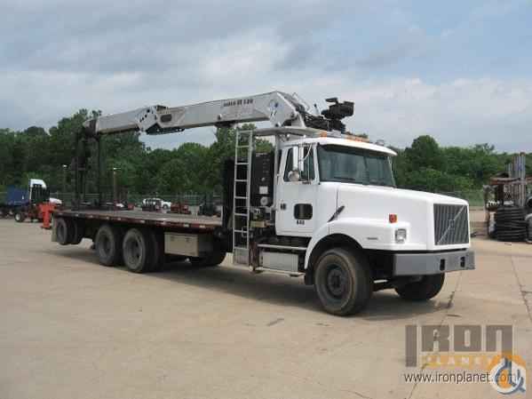 Location...Arkansas. (261538) S/N...4V5JC2GF3YN869109. Day cab w/ heater and A/C components, Volvo VE D12B-345 engine, Eaton Fuller 8-speed + LO&LO-LO manual transmission, drop axle, 11R22.5 tires, 304"x96" flatbed, JABCO JT3204S knuckle boom. The engine started and ran. The drivetrain engaged in forward and reverse. The hydraulic system responded to the controls. The main components appear to be in place and operational.
