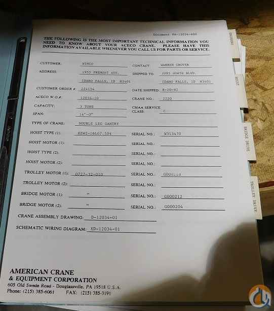 1992/93 ACECO Double Leg Gantry Crane - 3 TON