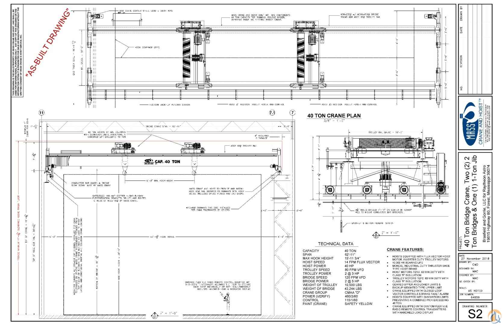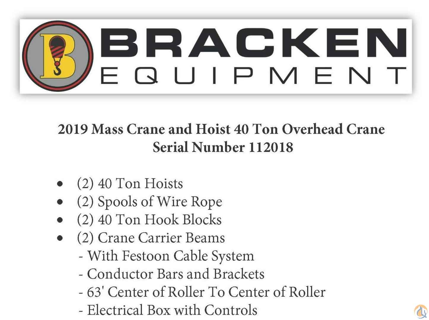 NEVER USED, 62'11" Span, Dual Hoist, 15'11" Hook Height, 14 FPM Hoist Speed, 80 FPM Trolly Speed, 10,500# Trolly Weight, 43,244# Bridge Weight, (2) 40T Blocks, (2) 40T Hoists, (2) Crane Carrier Beams, Call Kevin @ 601-631-1616!