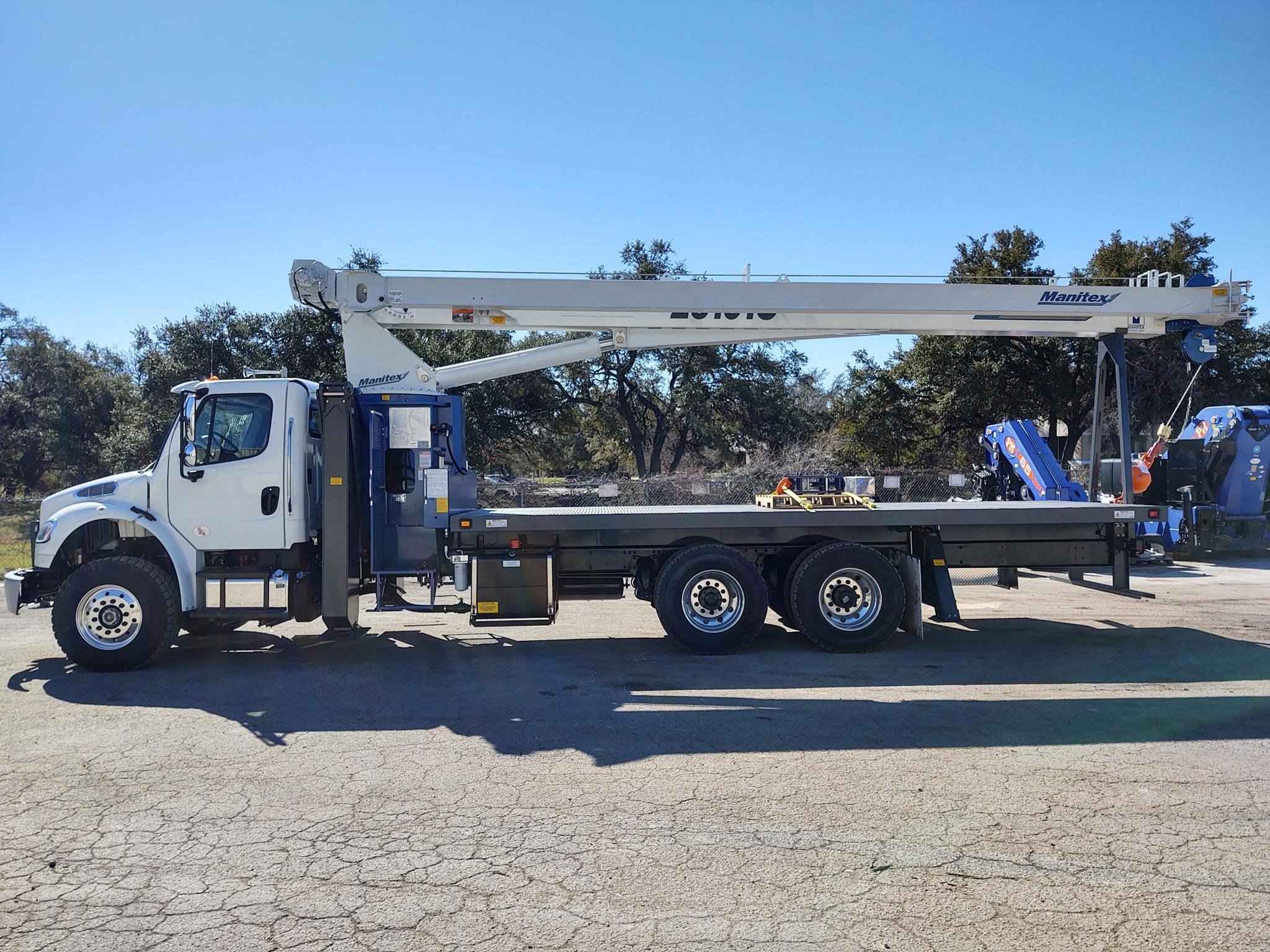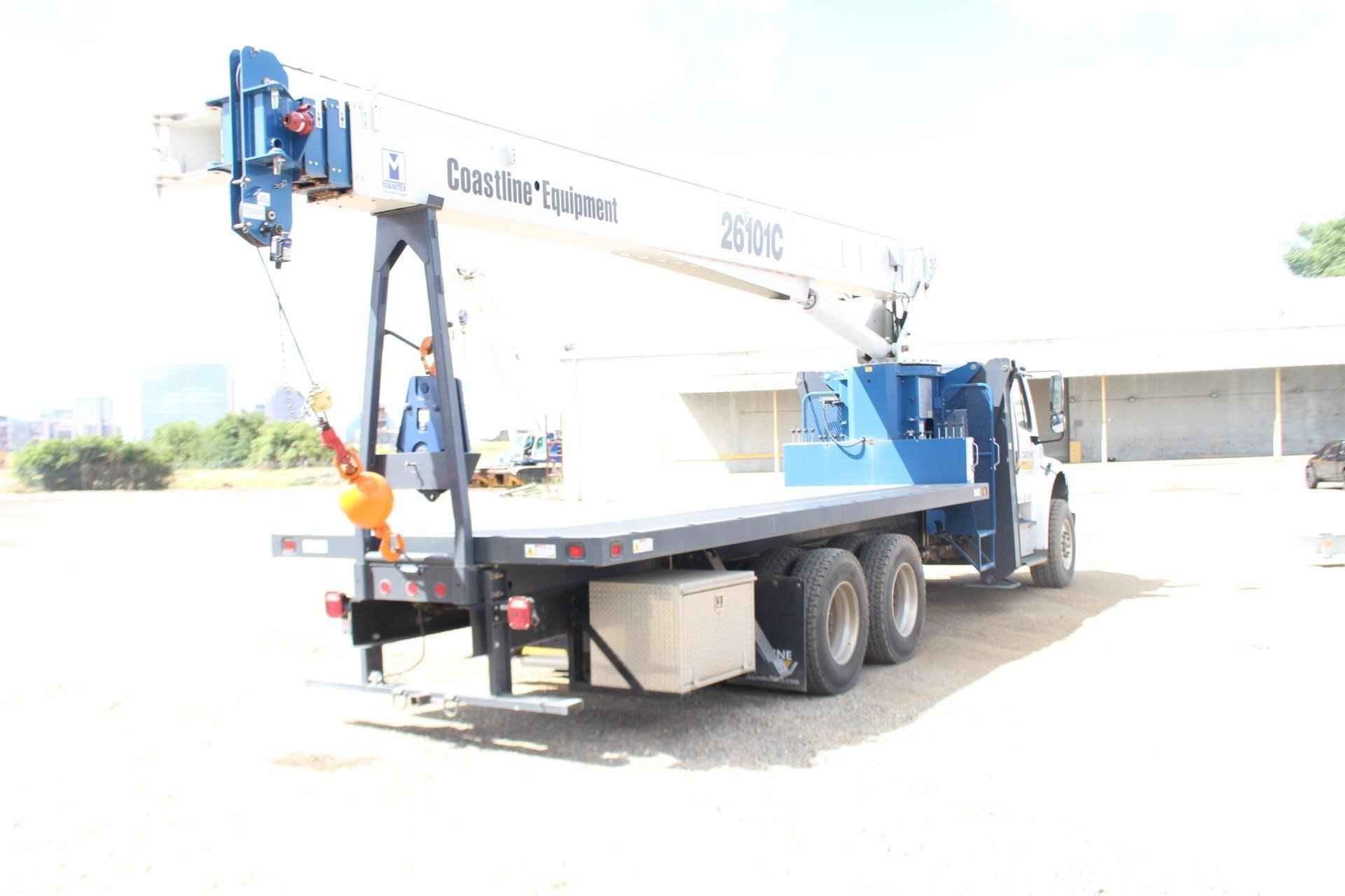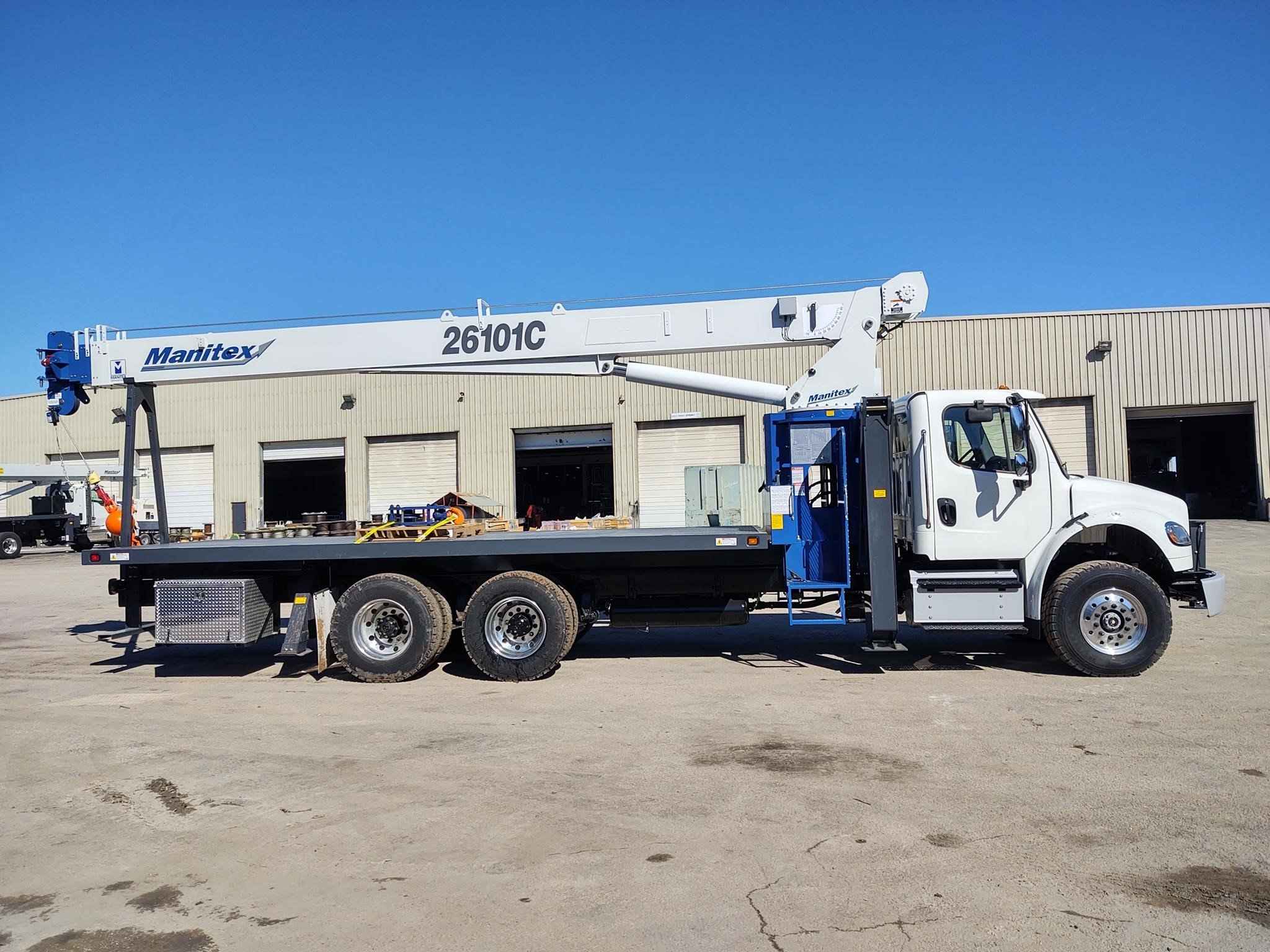 MANITEX 26101C 26 TON CRANE Standard features: 101’ Four-Section Telescopic Boom, 2-speed Hoist w/Grooved Drum, 7 Ton Hook and Ball, 3-Load Sheave Quick Reeve Boom Head, Externally Wired Anti-Two Block, Boom Hoist Cylinder, System Pressure Gauge, 372° Non Continuous Rotation, Removable Boom Rest, Engine Start/Stop, Operator’s Service/Parts Manuals, Boom Length and Angle Indicators, Function Overload Shutoff, Electronic Throttle, Bubble Level, 300’ of 9/16” Rotation Resistant Wire Rope, 70 Gallon Reservoir w/Suction Strainer & Ball Valve, Pedestal, Turret, Rotation Bearing & Swing System, Dual Operator Control Stations, Load Moment Indicator – Audio/Visual Capacity Alert w/Shutoff, Audible Outrigger /Stabilizer Motion Alarm, A-Frame Outriggers (21’6” spread width), A-frame Rear Stabilizers, Outrigger Monitoring System for verification only, Subframe for 22’ Bed, 3-Section Hydraulic Gear Pump – CCW Rotation is Standard, Signal Horn. Additional Options Included: • Radio Anti Two Block • 1 Piece Jib (101) (G/RS) – Radio A2B • 22’ Steel Bed with 1/8” thick steel thread plate • 3 Section Vane Pump clockwise rotation • Hotshift PTO • Chassis Mounted Heavy Duty Hydraulic Reservoir • 15 Ton 1-Sheave Quick Reeve Block for 2-3 part line 9/16” rope • Front Center Stabilizer • Control Valve for operation of single stabilizer, Required w/FBS • Aluminum Toolbox (36” L x 24” W x 24” H) chassis mounted MOUNTED ON 2023 FREIGHTLINER M2 106 Mounted on a 2023 Freightliner M2 106 with a Cummins L9 360 HP diesel engine, Allison 3000 RDS automatic Transmission, MFS-18-133A at 18,000 lbs. front axle, MT-40-14X 40,000 lb. tandem rear axle, Airliner 40,000 lbs. extra duty rear suspension, Single 50 gallon aluminum fuel tank, Heater and air conditioning with defrosters, full instrumentation, Full power windows, interior color Opal Gray, AM/FM/WB/USB with Bluetooth world tuner radio, Single Air Horn mounted on roof, Dual Heated Mirrors, External Stainless Steel Sunvisor, Halogen headlights and unit is painted Elite White.