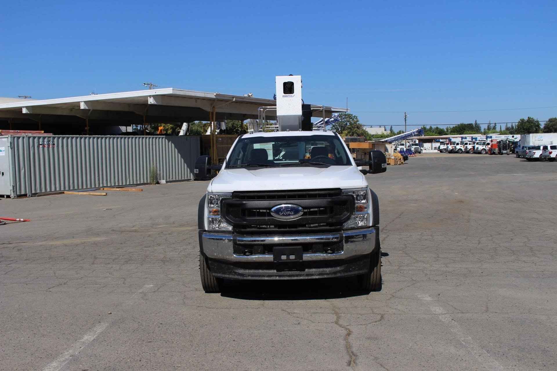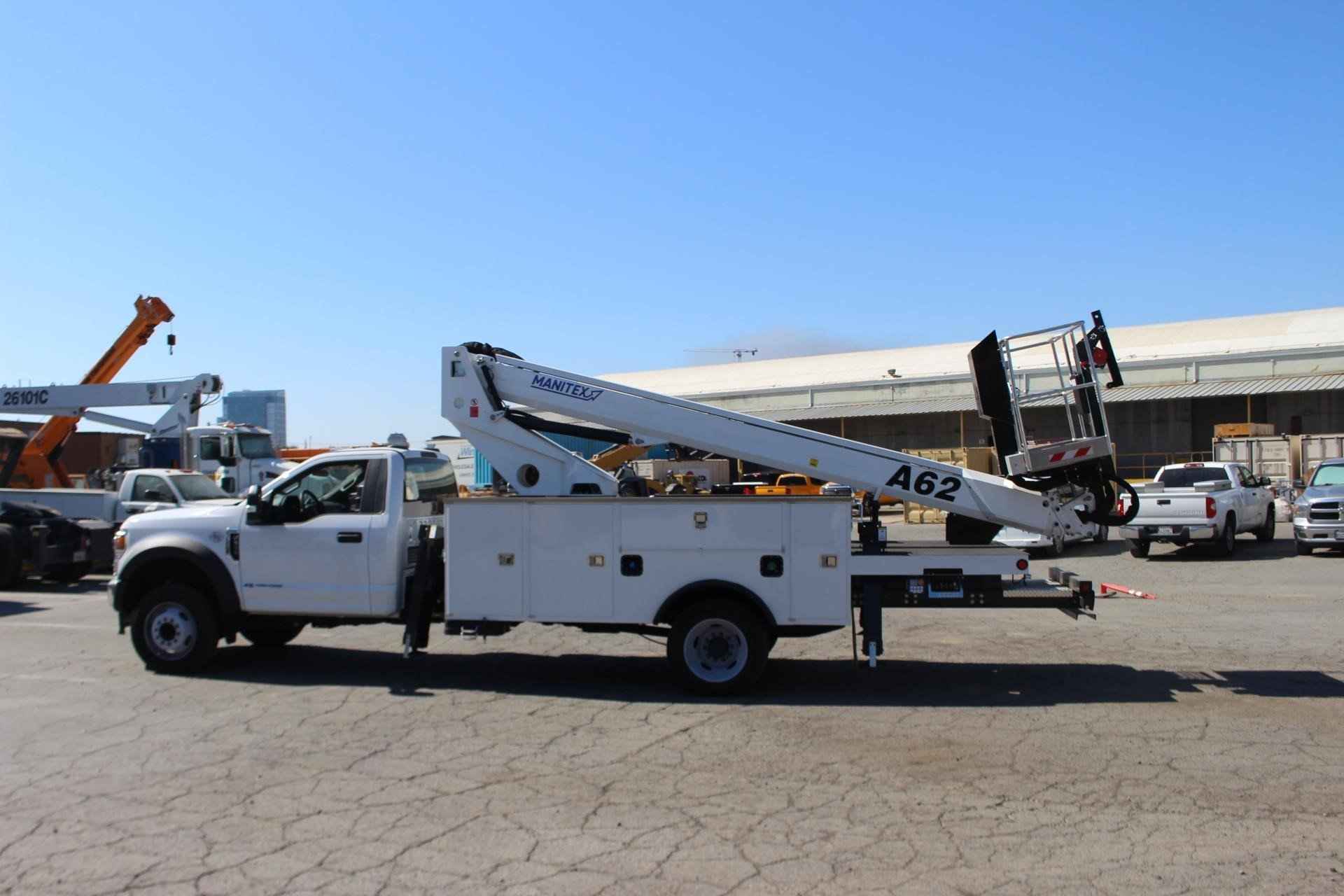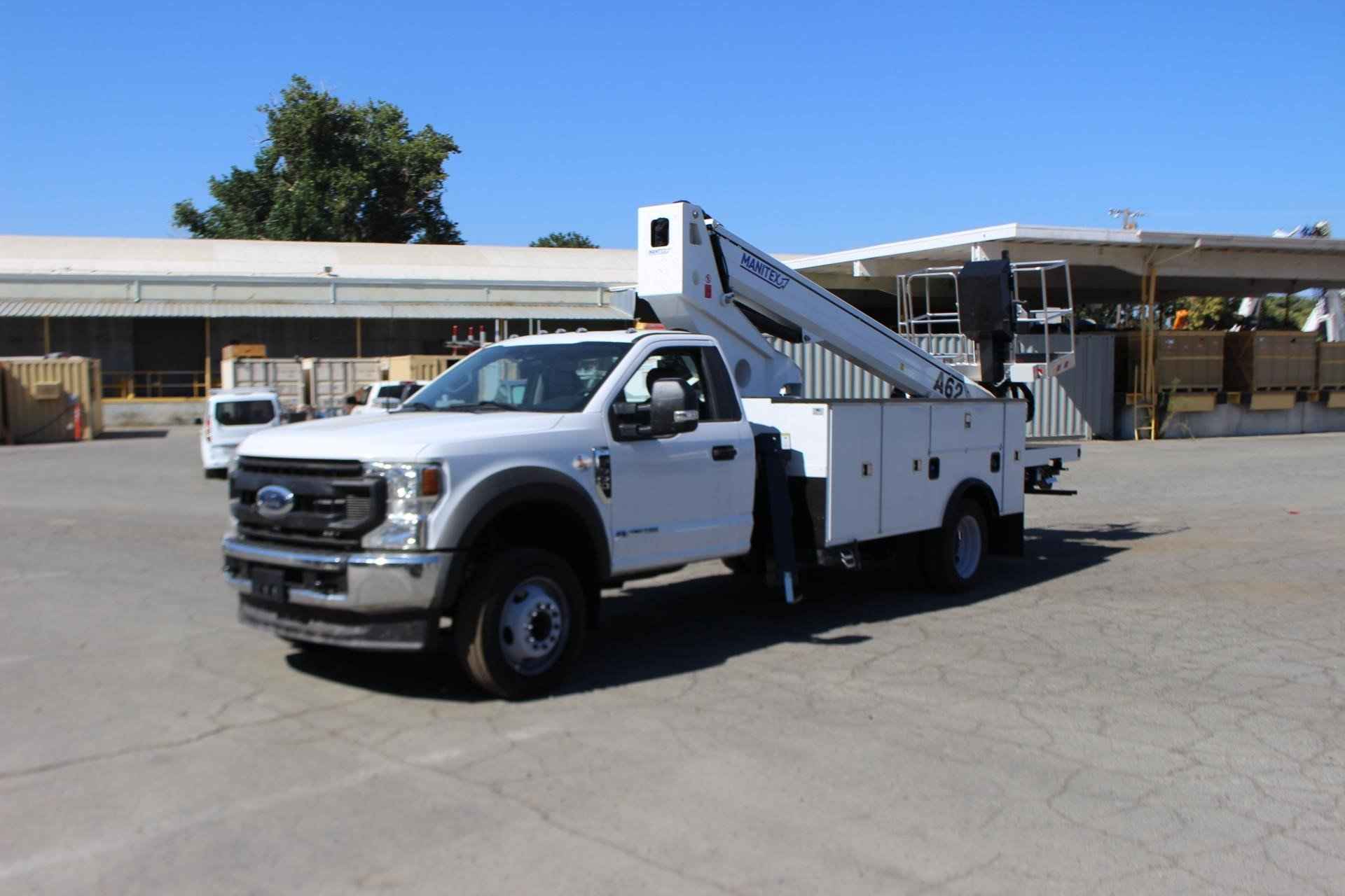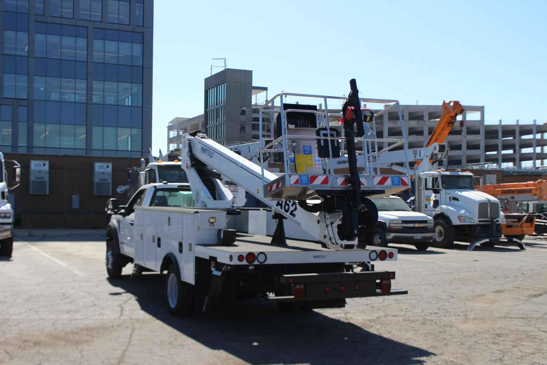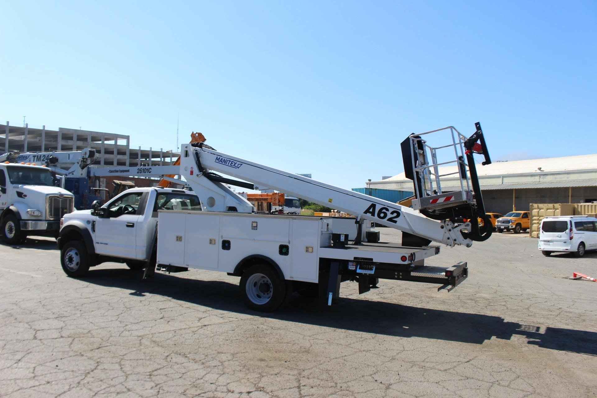 MANITEX A62 Standard features: Three-Section Telescopic Aerial Lift Platform – Internally wired – Standard, Maximum Operating Height – 62’, Maximum Operating Outreach – 38’, Boom operating Angle - 15° -+75°, Maximum Basket Capacity – 500 lbs. 2 people, Basket Dimensions – 67” x 27.5” x 43”, Aluminum Man Basket, Hydraulic stabilization controls, Turret rotation - 700° (+/-350°) non continuous, Basket rotation - 90° Left + 90° Right, Hydraulic tank capacity – 18 gallons, 4 hydraulic stabilizers (7’6” spread), Outrigger monitoring system, Hand pump for emergency lowering, Emergency engine stop button, Hydraulic basket rotation, Document folder on basket, Operator’s service/parts manuals, Engine start/stop from basket, Internally routed cables and hoses to basket, Safety operator foot pedal in basket, Dual side outrigger operator controls Additional Options Included: • 1 Section Gear Pump – Automatic Transmission (4x2) • Hotshift PTO • Steel Service Body • Electric Basket Jib Winch – 200lbs. capacity • (4) Crib Plates 18x18 & Storage Bkts. Chassis Mtg. MOUNTED ON 2023 FORD F-550 Mounted on a 2023 Ford F-550 with a Powerstroke 6.7L diesel engine, TorqShift 10-speed automatic transmission, GVWR 19,500 lbs., 40 gallon fuel tank, Front axle load 7,500 lbs. and the rear axle is 14,706 lbs., 4 wheel anti-locking braking system, Heated mirrors, Oxford White Paint, Vinyl 40/20/40 Split Bench Seat, air conditioning, AM/FM/Stereo radio w/MP3 Player , Engine Block Heater, 250 Amp Alternator, 2 – 120V Power Outlets.