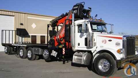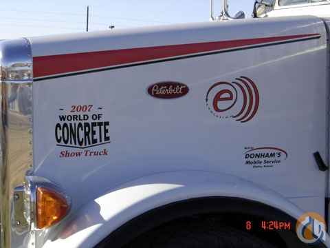Location..Kansas. 2007 World of Concrete Show Truck 2007 Peterbilt with front mounted Fassi F415A24L414 Evolution Knuckle boom, Topseat and Radio Remote, 72' reach 2,083lbs. horizontal reach, Pusher and Tag axles, 27' Bed, all aluminum wheels, 475 C15 cat, 18 speed, 20 and 46 axles.