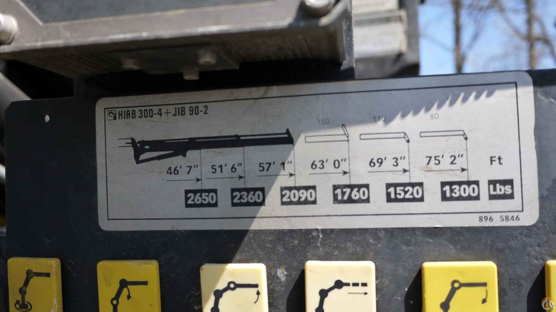 HIAB 300-4 KNUCKLEBOOM; 13 TON; PICKS 14,450 LB AT 13'9'' SIDE REACH; PICKS 2,090 LB AT 57'1'' MAX SIDE REACH; 4 HYD EXT ON OUTER BOOM FLY JIB W/ 2 HYD EXT; RADIO REMOTE CONTROLS; 2 HYD OUT DOWN OUTRIGGERS.