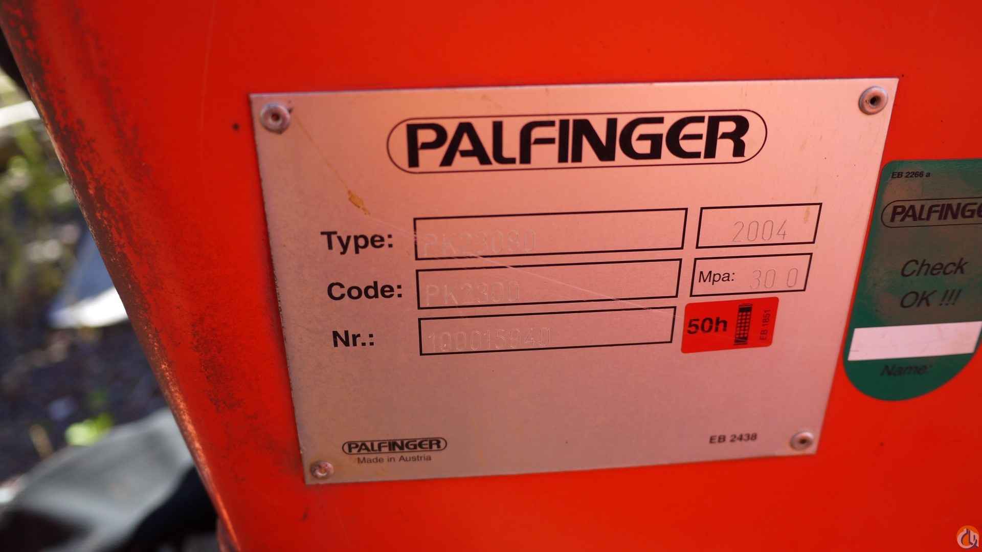 2004 PALFINGER PK23080; 9 TON; PICKS 18,080 LB AT 8'10'' SIDE REACH; PICKS 6,150 LB AT 25'11'' MAX SIDE REACH; 2 HYD EXT ON OUTER BOOM; 2 HYD OUT DOWN OUTRIGGERS; (HAS HYD TANK PUMP).