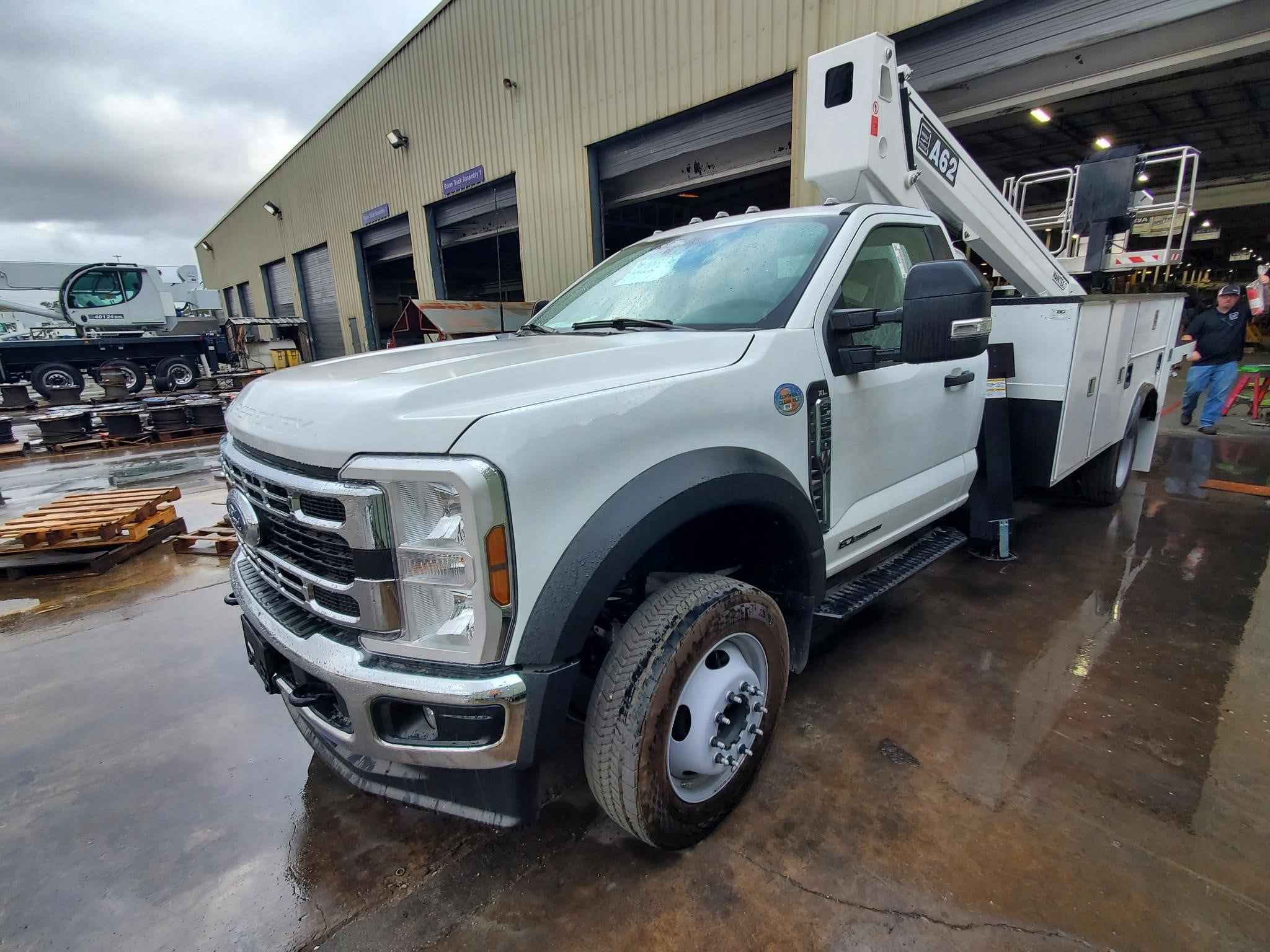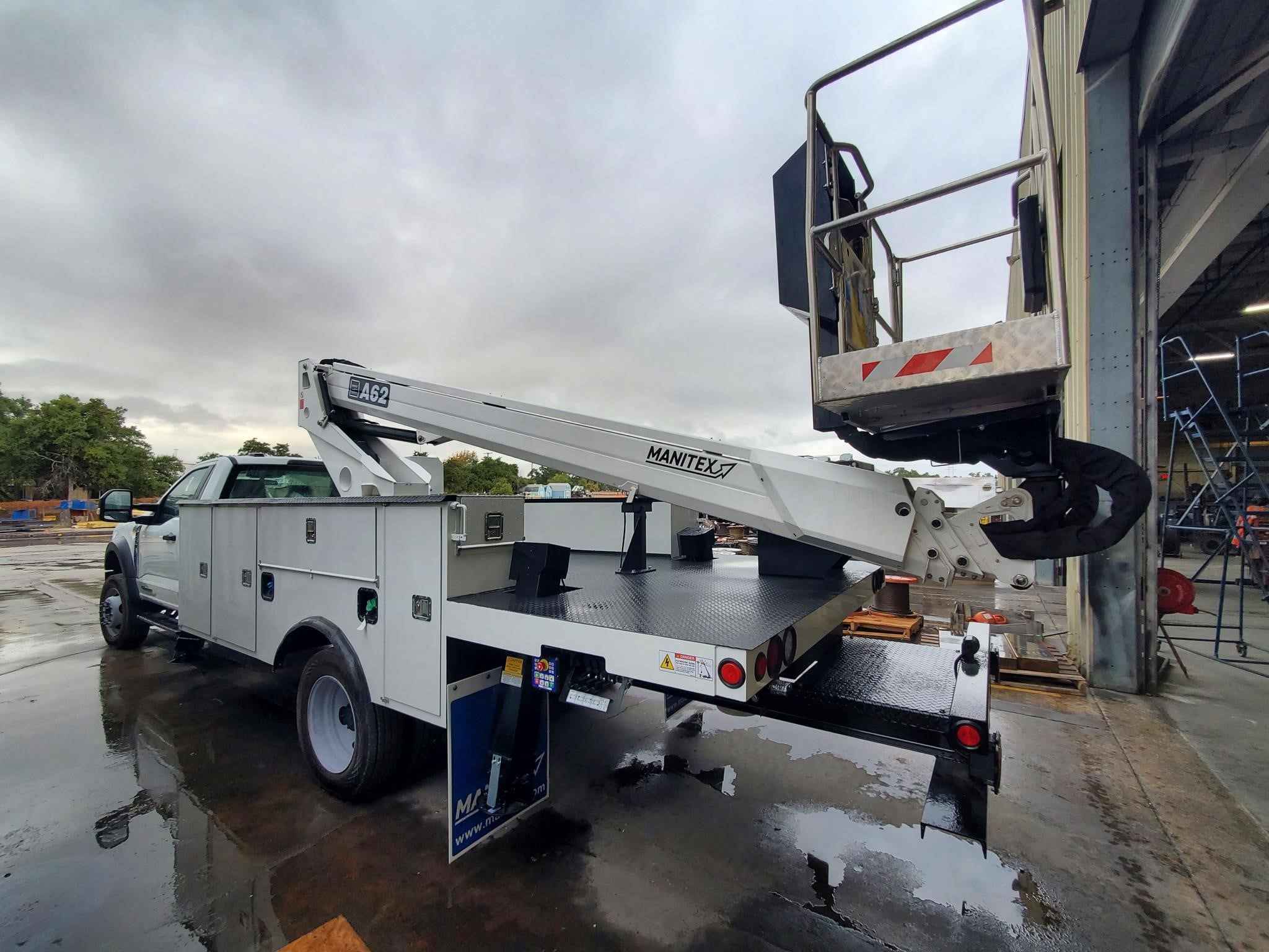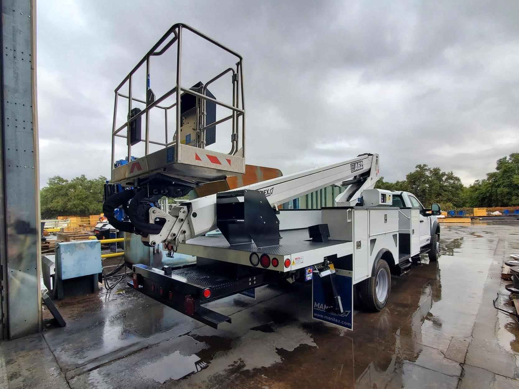 Mounted on various chassis options including, Ford, Dodge, and Chevy. Available with either a steel service body or a flatbed. Capacity: 550 lbs Max Working Height: 62 feet Type of Articulation: Telescopic Number of Boom Sections: 3 Boom Boom Angle: -15° / + 75° Chassis Requirements GWVR: 15,400 lbs FAWR (lbs): 7,000 RAWR: 14,700 lbs Max Height floor of bucket: 56 feet Outreach: 38 feet Front Outrigger: Fixed A Shape Rear Outrigger: Fixed A Shape Hoses and cables: Inside booms Cylinder of extension: Inside booms Position and angle control: Yes Size of basket: 67 x 28 x 43 Inches [aluminum] Standard Features: Start-up and shutdown of the main engine and any auxiliary engine from the basket Protective sidebars Protection on controls area on column and basket Acoustic device for PTO plugged in A self-locking device on rotation Warning device operating outriggers (truck dashboard) Interlock for stabilizers Hand pump for emergency lowering Document folder on the basket Thermal protection on the electrical system Emergency button with stop engine device Hydraulic basket rotation Holding valves on every cylinder Maximum pressure valves on the hydraulic circuit Use and maintenance manual Available Options: Jiblet Winch with 200 lbs max capacity 110V Electrical outlet in the basket and a 2.2 kW inverter Various body options including service body and flatbeds