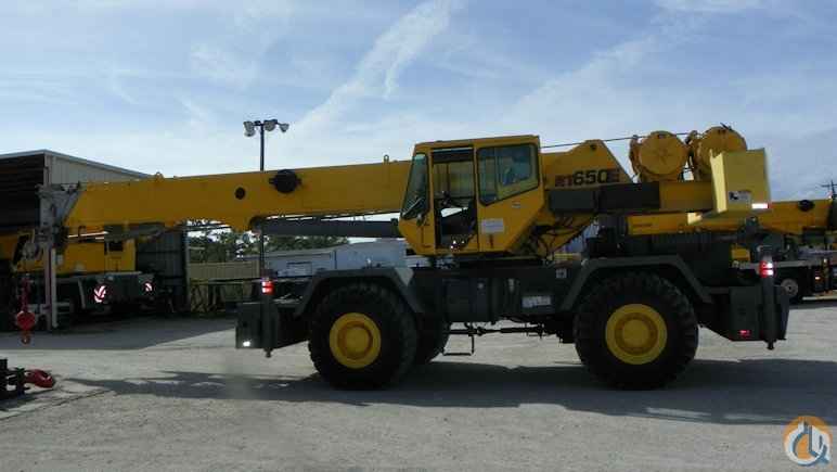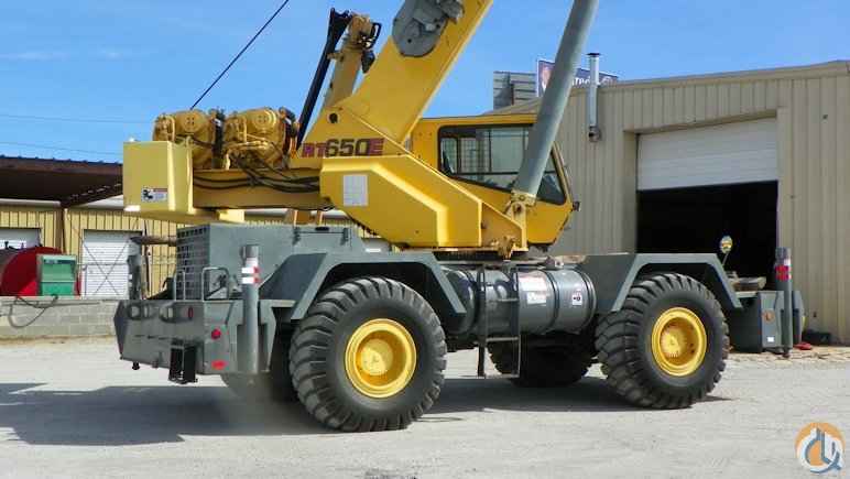 2002 Grove RT650E, 50 ton rough terrain crane equipped with: 105 ft. 4 section full-power boom, 29 ft.-51 ft. side stow jib, main & auxiliary winches, auxiliary lifting sheave, 360 degree swing lock, PAT DS350 LMI system, single axis controls, heater & A/C in cab, Cummins diesel engine ( 1,000 hours on new engine ), 23.5 X 25 tires, Very good condition with a current certification.