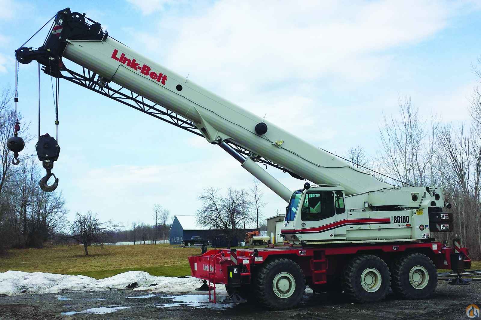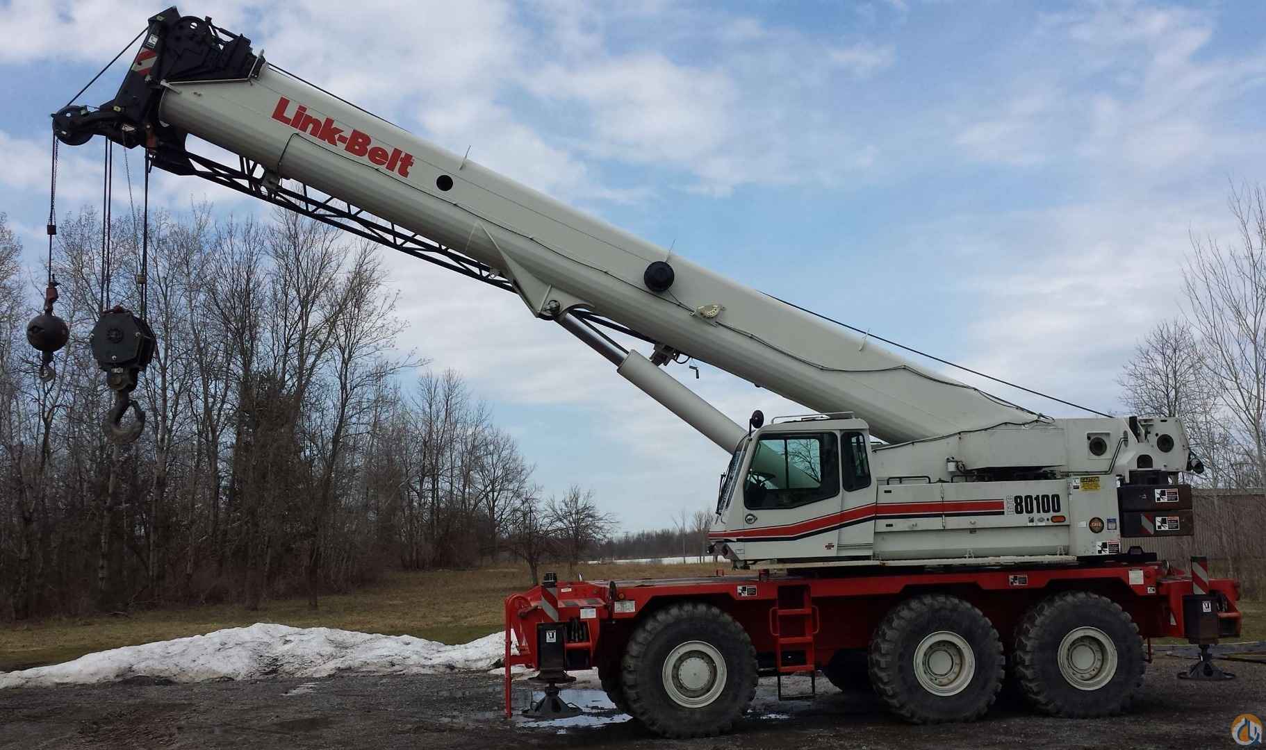 2009 Link-Belt RTC-80100 SII Rough Terrain Crane, Hydraulic Outrigger Pin Removal, Hydraulic Counterweight Removal, Main & Auxiliary w/ Followers, 360° Swing Lock, RCL Bar Graph, A/C, Single-Axis Controls, Auxiliary Lifting Sheave, 55' Bi-Fold, 12-Ton Overhall Ball w/ Swivel, 50-Ton 4-Sheave Block.