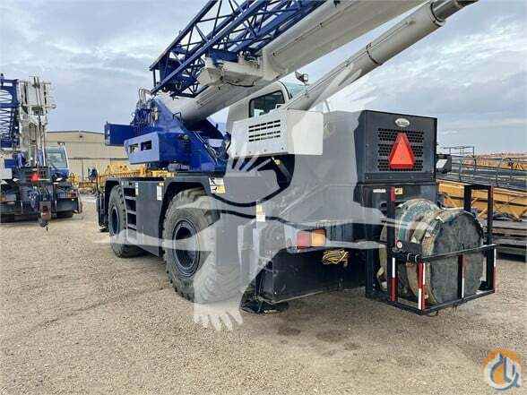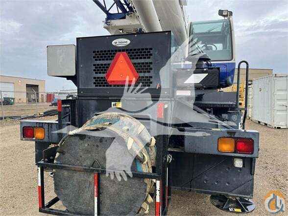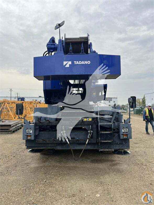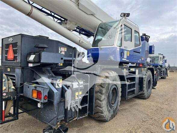 ONE USED 2013 TADANO GR550XL ROUGH TERRAIN CRANE, C/W: SN: 540819 55 US ton capacity Four section full power synchronized boom 35.1’-113.9’ (10.7 m-34.7 m) 50’ (15.2 m) bi-fold lattice jib (tilt type) Auxiliary lifting sheave (single top) storable Variable speed main hoist with grooved drum, cable follower and 633’ of ¾†cable Variable speed aux. hoist with grooved drum, cable follower and 361’ of ¾†cable Drum rotation indicator (audible, visible and thumper type) main and aux. hoist Anti-two block device (overwind cutout) Boom angle indicator Tadano electronic load moment indicator system (AML-C) Outrigger extension length detector Electronic crane monitoring system Tadano twin slewing system and 360 degree positive slewing lock Self centering finger control levers with pilot control Control pedals for boom elevating and boom telescoping 3 way adjustable cloth seat with armrests, high back and seat belt Tilt-telescoping steering wheel Tinted safety glass and sun visor Front windshield wiper and washer Roof window wiper and washer Power window (cab door) Rear view mirrors (right and left side) Mirror for main and aux. hoists Cigarette lighter and ashtray Cab floor mat Pump disconnect in operator’s cab Hydraulic oil cooler Hot water cab heater and air conditioner Positive control Quick reeving type bi-fold jib Work lights Independently controlled outriggers Four outrigger extension positions Self-storing outrigger pads Cummins QSB6.7 turbo charged after cooled engine (270HP) with exhaust brake Electronic controlled automatic transmission driven by torque converter 4 x 4 x 4 drive/steer Non-spin rear differential Semi-elliptic leaf springs suspension with hydraulic lockout device (front and rear) Disc brakes Fenders Air dryer Water separator with filter (high filtration) Engine over-run alarm Back-up alarm Low oil pressure/high water temp. warning device (visual) Rear steer centering light Air cleaner dust indicator Full instrumentation package Complete highway light package Tool storage compartment Tire inflation kit 24V electric system 6.2 ton (5.6 metric ton) hook ball with swivel 55 ton (50 metric ton) 5-sheave with swivel hook block and safety latch for ¾†(19 mm) wire rope Towing hooks-Front and rear Lifting eyes Hook block tie down (front bumper) Weighted hook storage compartment Halogen head lamp Telematics (machine data logging and monitoring system) with HELLO-NET via internet Fuel consumption monitor Eco mode system
