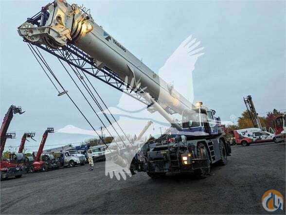 One Used 2013 Tadano GR550XL Rough Terrain Crane: 55 US ton capacity Four section full power synchronized boom 35.1’-113.9’ (10.7 m-34.7 m) 50’ (15.2 m) bi-fold lattice jib (tilt type) Auxiliary lifting sheave (single top) storable Variable speed main hoist with grooved drum, cable follower and 633’ of ¾†cable Variable speed aux. hoist with grooved drum, cable follower and 361’ of ¾†cable Drum rotation indicator (audible, visible and thumper type) main and aux. hoist Anti-two block device (overwind cutout) Boom angle indicator Tadano electronic load moment indicator system (AML-C) Outrigger extension length detector Electronic crane monitoring system Tadano twin slewing system and 360 degree positive slewing lock Self centering finger control levers with pilot control Control pedals for boom elevating and boom telescoping 3 way adjustable cloth seat with armrests, high back and seat belt Tilt-telescoping steering wheel Tinted safety glass and sun visor Front windshield wiper and washer Roof window wiper and washer Power window (cab door) Rear view mirrors (right and left side) Mirror for main and aux. hoists Cigarette lighter and ashtray Cab floor mat Pump disconnect in operator’s cab Hydraulic oil cooler Hot water cab heater and air conditioner Positive control Quick reeving type bi-fold jib Work lights Independently controlled outriggers Four outrigger extension positions Self-storing outrigger pads Cummins QSB6.7 turbo charged after cooled engine (270HP) with exhaust brake Electronic controlled automatic transmission driven by torque converter 4 x 4 x 4 drive/steer Non-spin rear differential Semi-elliptic leaf springs suspension with hydraulic lockout device (front and rear) Disc brakes Fenders Air dryer Water separator with filter (high filtration) Engine over-run alarm Back-up alarm Low oil pressure/high water temp. warning device (visual) Rear steer centering light Air cleaner dust indicator Full instrumentation package Complete highway light package Tool storage compartment t24V electric system 6.2 ton (5.6 metric ton) hook ball with swivel 55 ton (50 metric ton) 5-sheave with swivel hook block and safety latch for ¾†(19 mm) wire rope Towing hooks-Front and rear Hook block tie down (front bumper) Weighted hook storage compartment Halogen head lamp Telematics (machine data logging and monitoring system) with HELLO-NET via internet Fuel consumption monitor 7,295 Hours 1,479 Kms