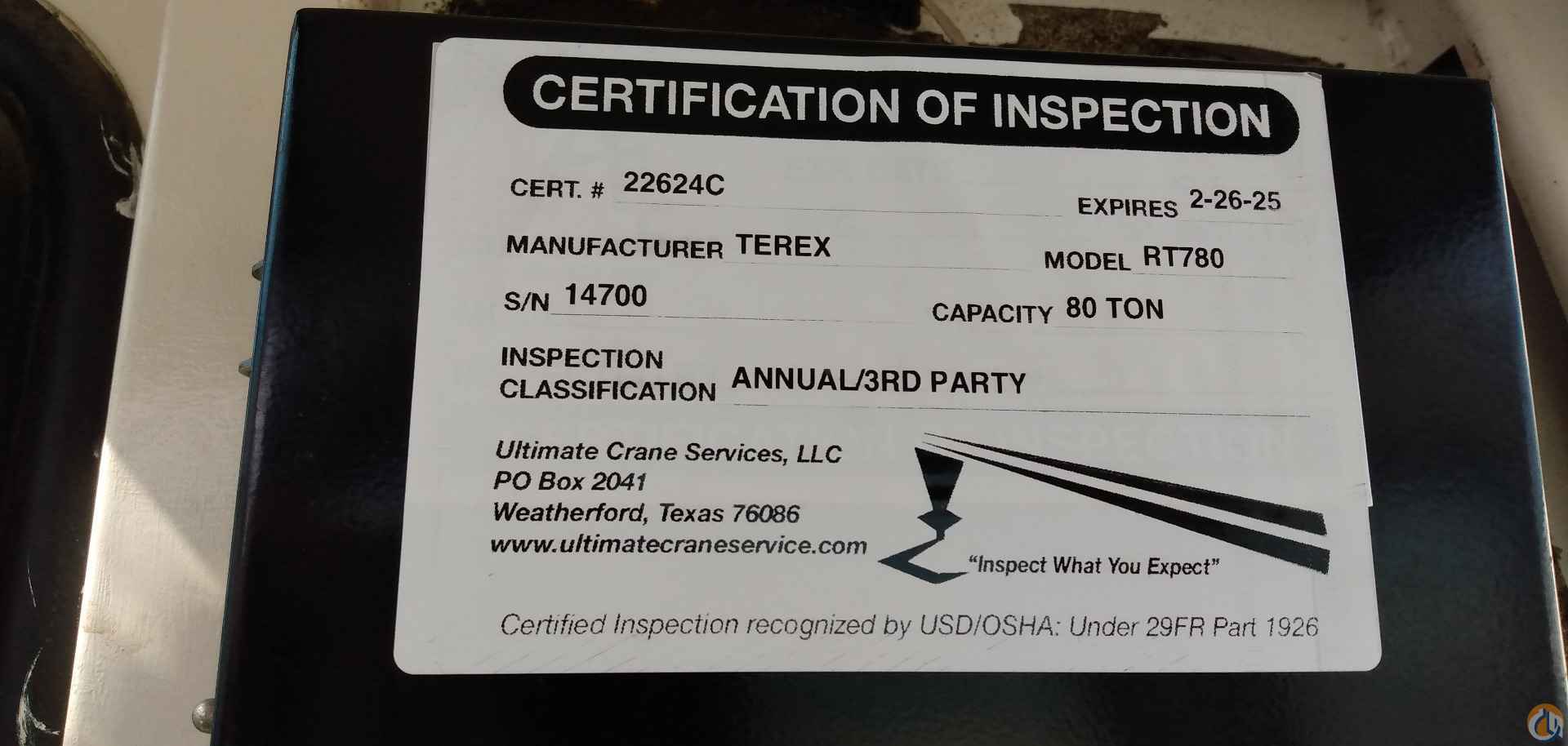 2007 TEREX RT780-1 , 80 TON ROUGH TERRAIN CRANE, 544 HOURS, 40'-126' MAIN BOOM, 33'-57' JIB, CUMINS DIESEL ENGINE, MAIN AND AUX WINCH, 75 TON HOOK BLOCK, 12 Ton HOOK BALL. |